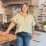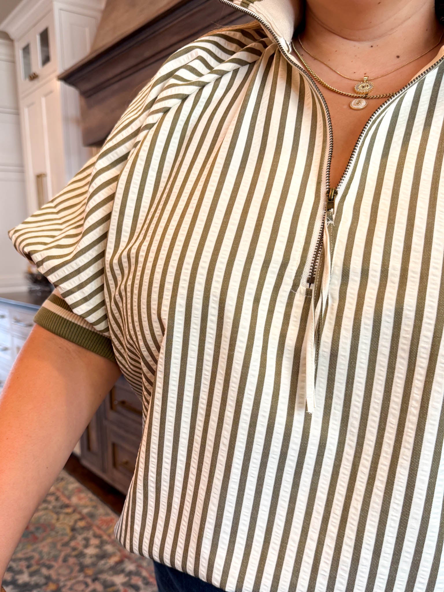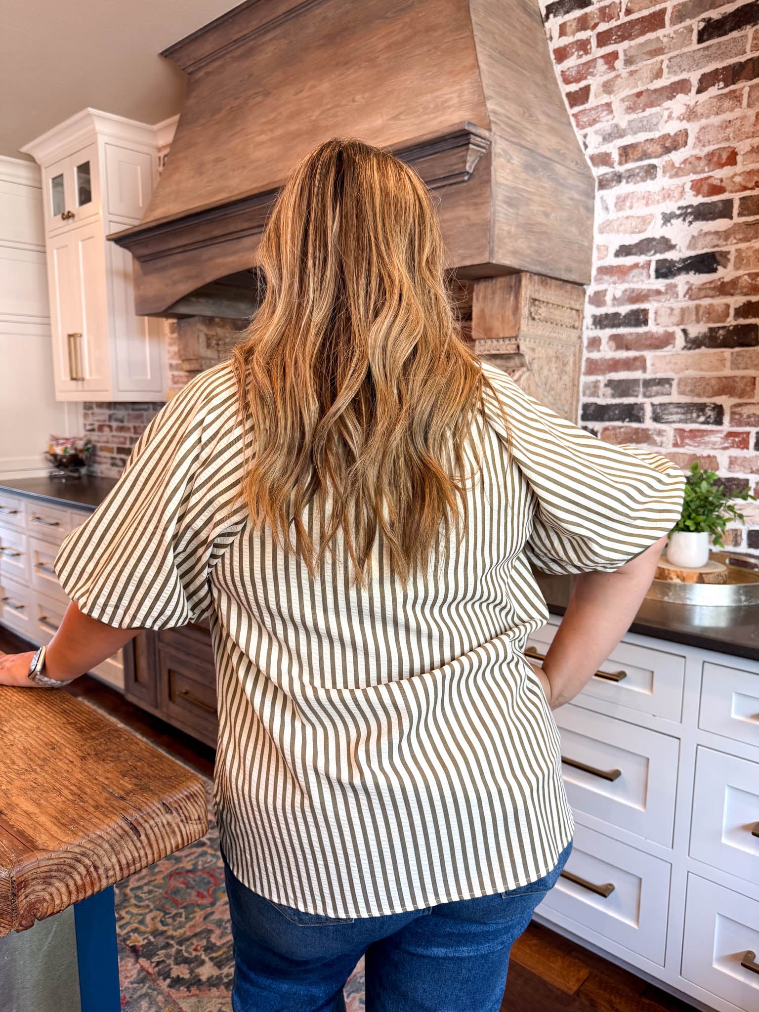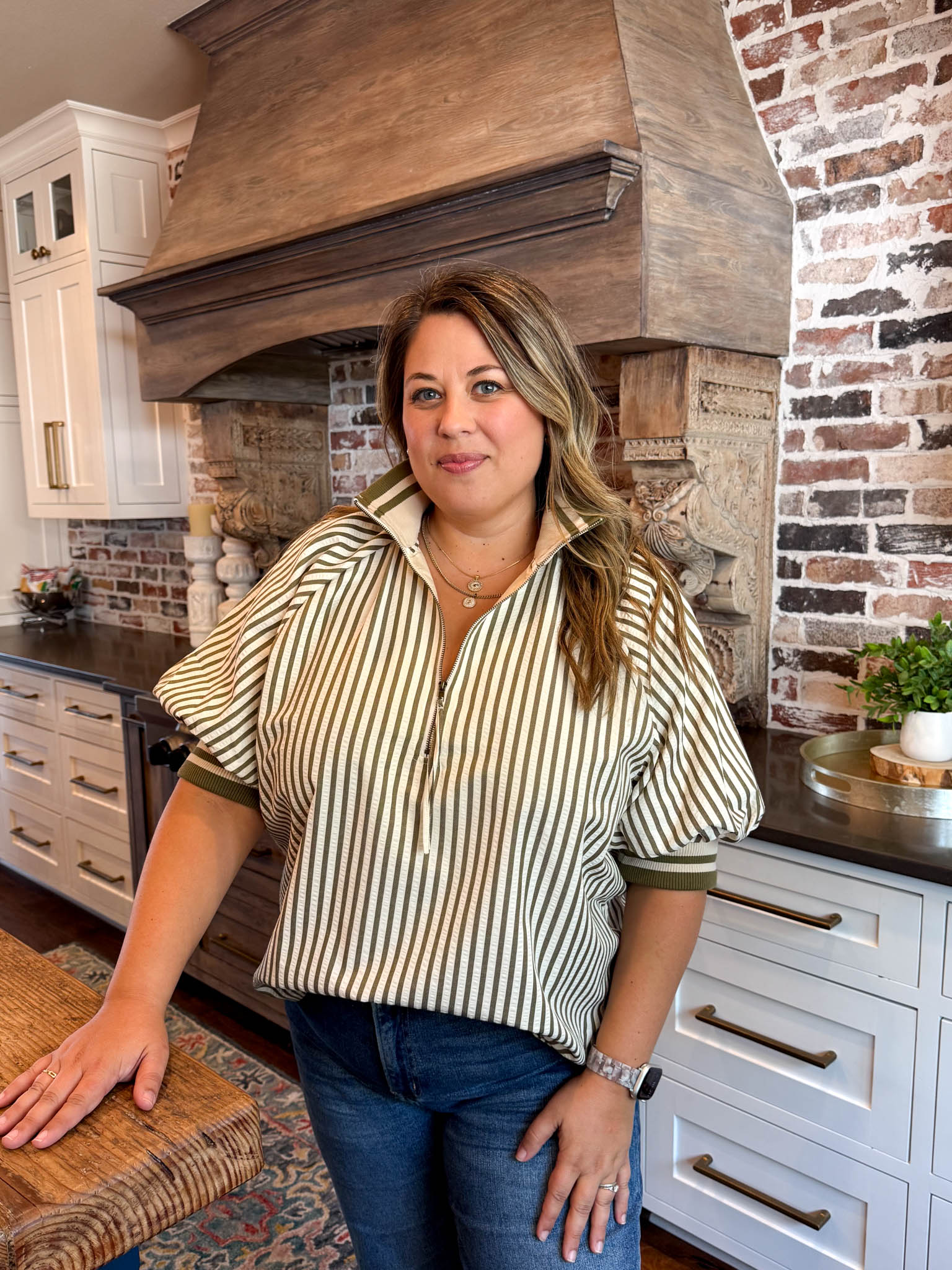 Elevate your style with the Kiara Olive Blouse, featuring playful balloon sleeves and a chic green and white stripe pattern that turns heads effortlessly.