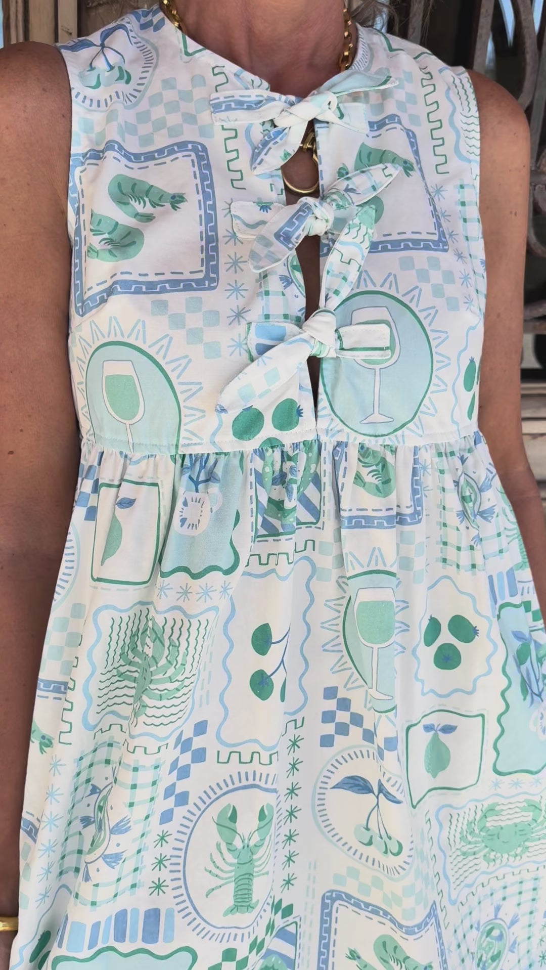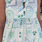 Turn heads with this jade and blue sleeveless mini dress—a bold statement piece that balances playful prints with refined details for any occasion.