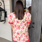 • Coral detailing at the hem, sleeves, and collar adds a pop of color and playful contrast