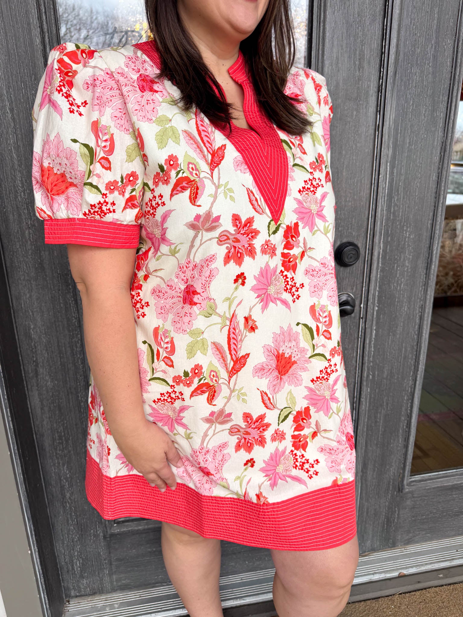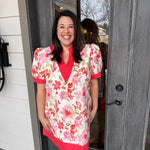 Twirl into spring with this charming white mini dress that pairs a flattering V-neckline with dreamy puffy sleeves and a cheerful pink floral print.