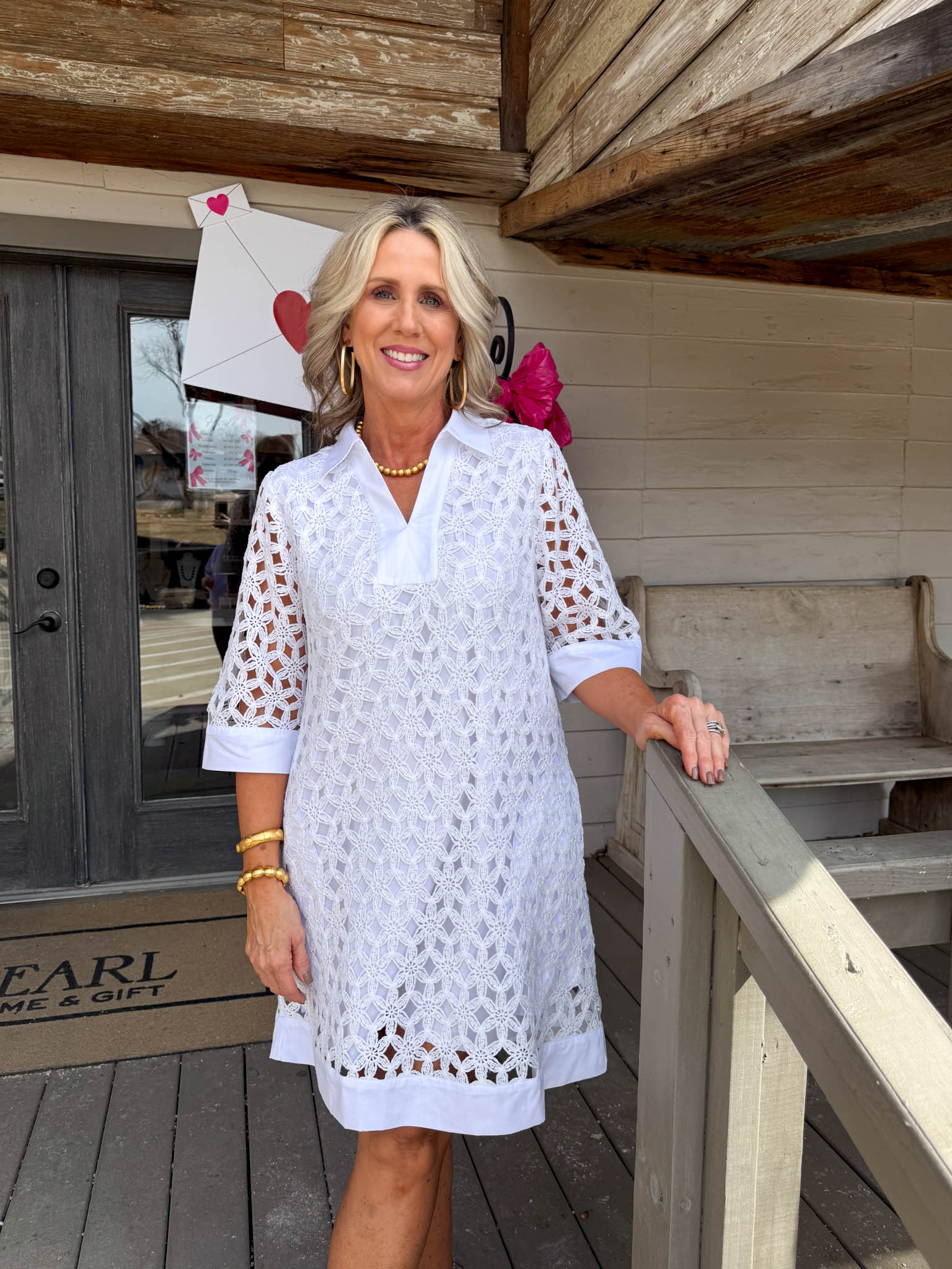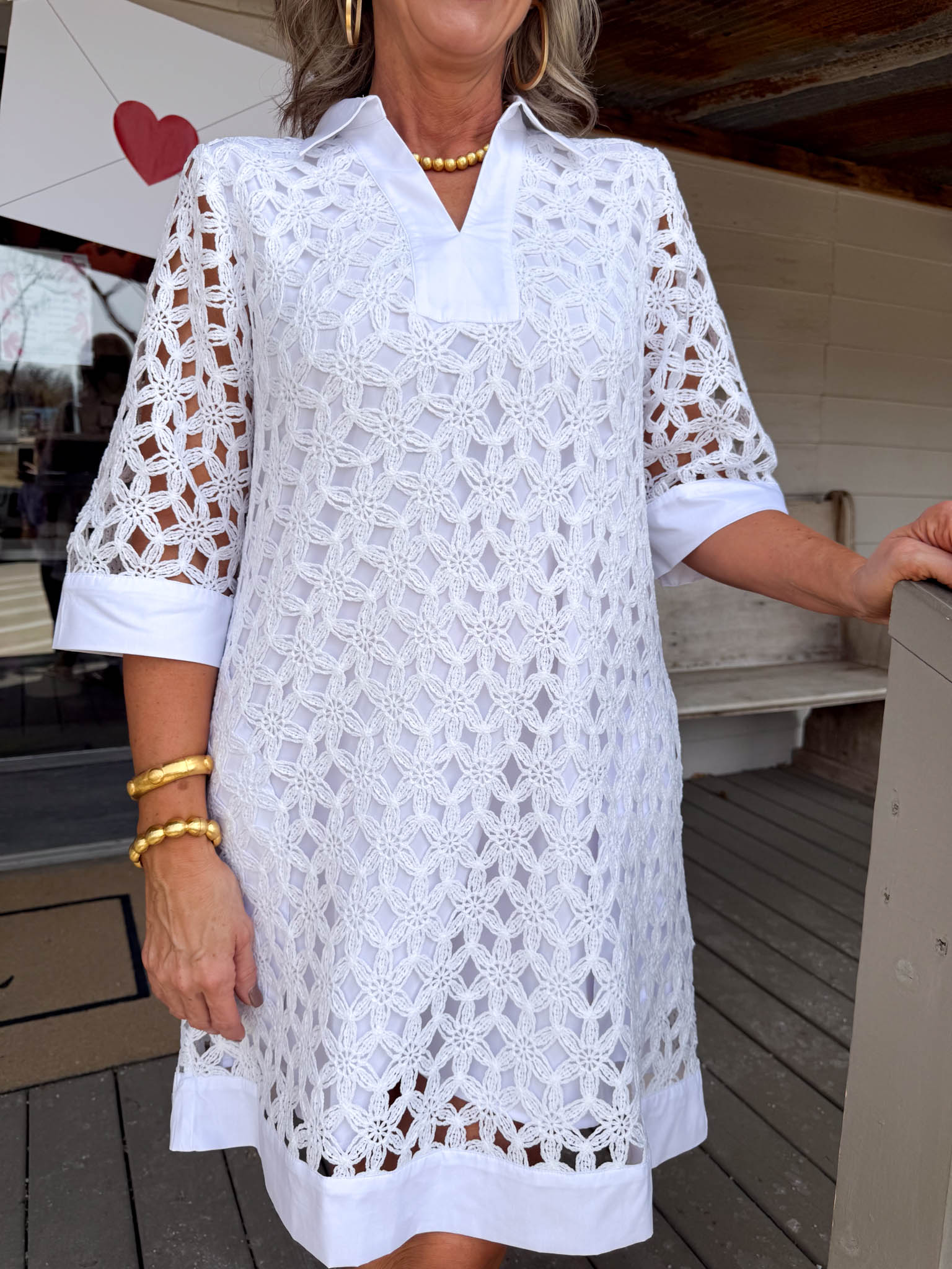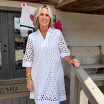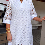 Twirl into spring with this charming white mini dress that pairs crisp 3/4 sleeves with an airy floral eyelet overlay for effortless elegance.