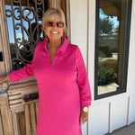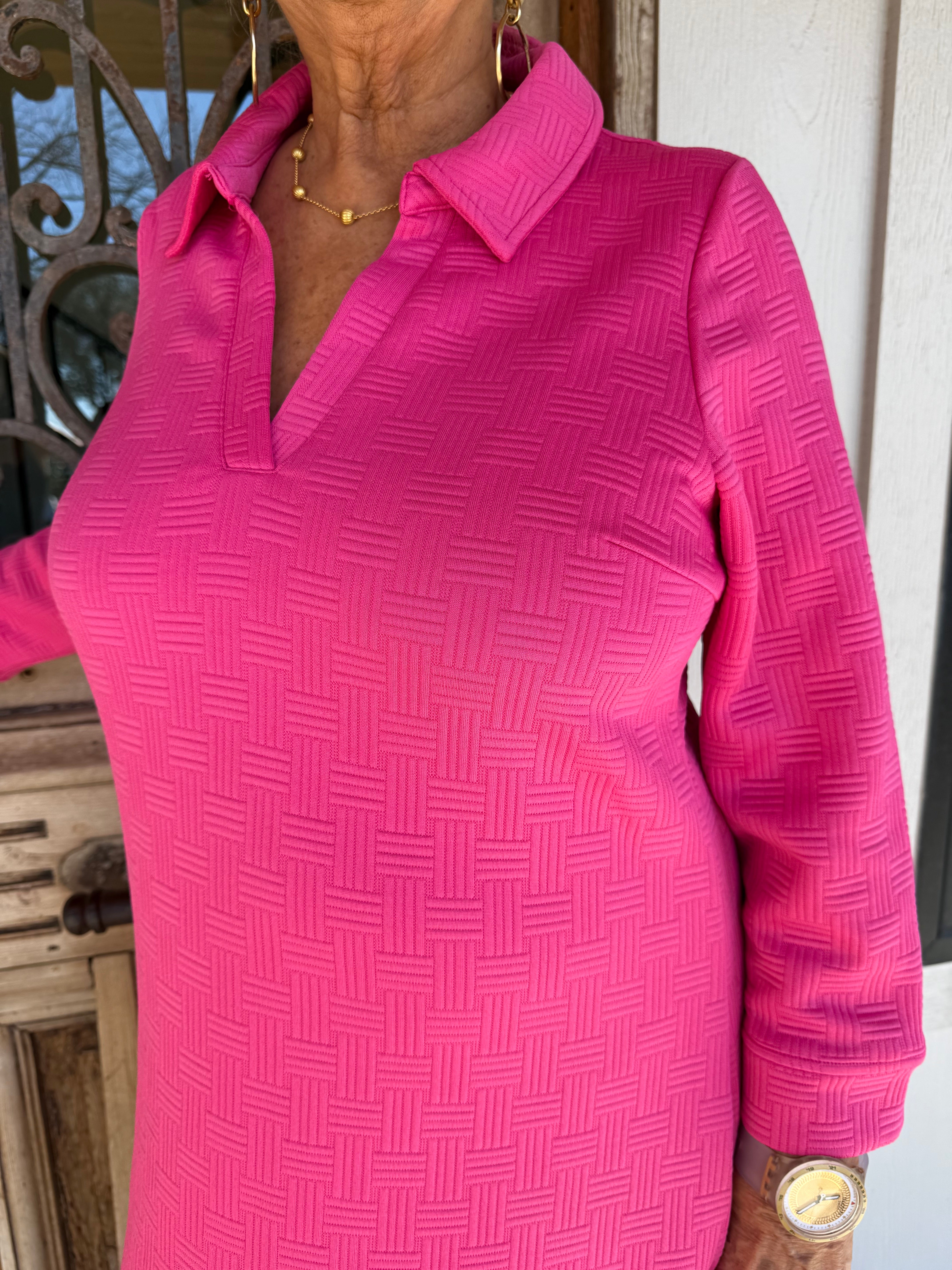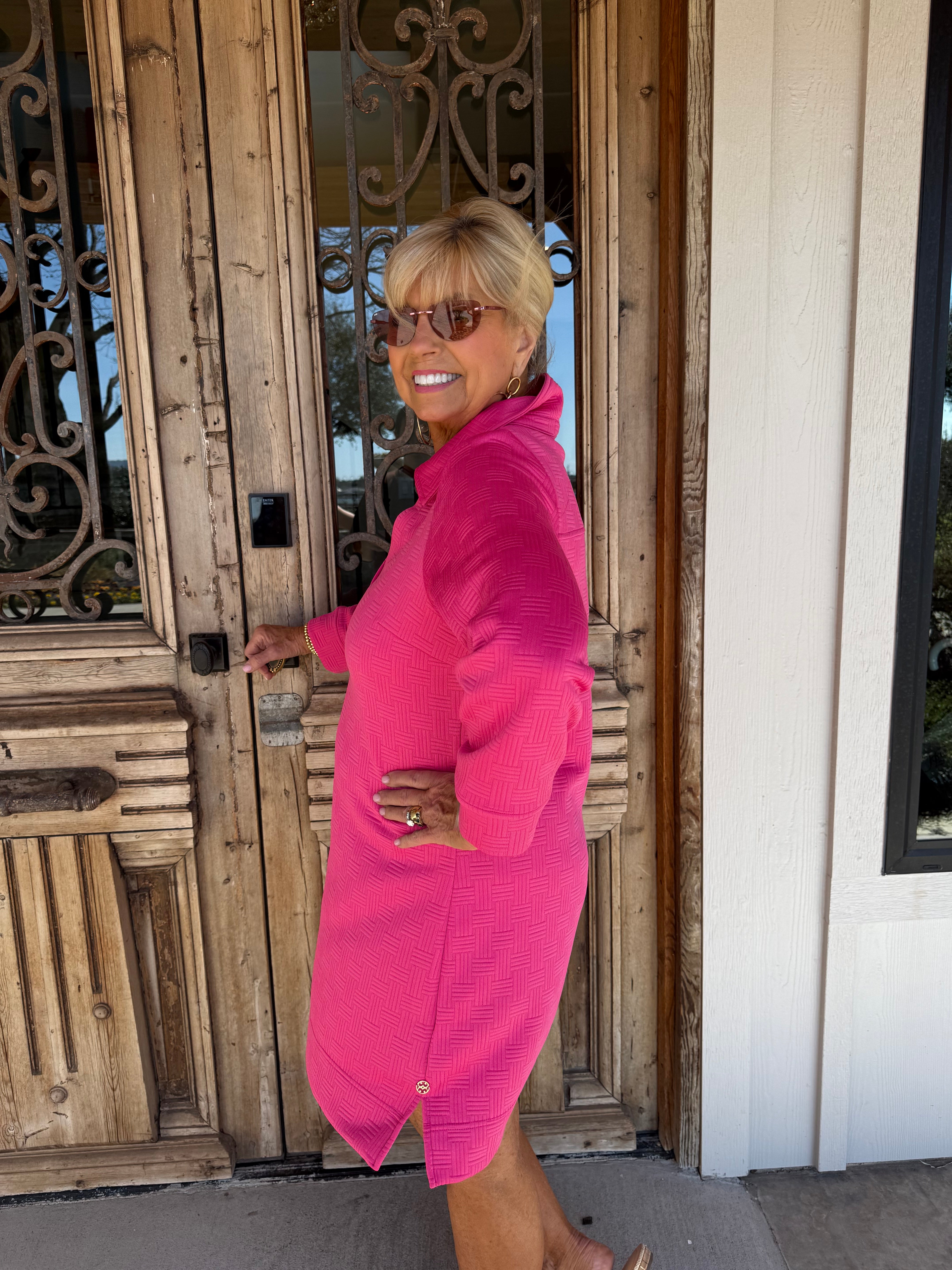 Lindsey is a chic pink textured mini dress with flattering 3/4 sleeves and a classic v-neck that transitions effortlessly from day to evening.