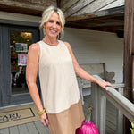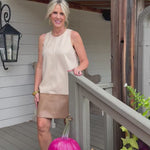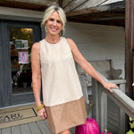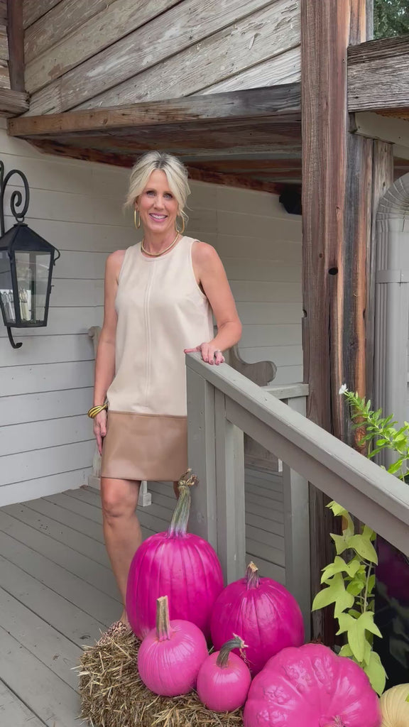 Slip into the London Mini Dress and watch heads turn with its chic ecru latte hue and edgy faux leather stripe that adds the perfect twist to your suede shift style.