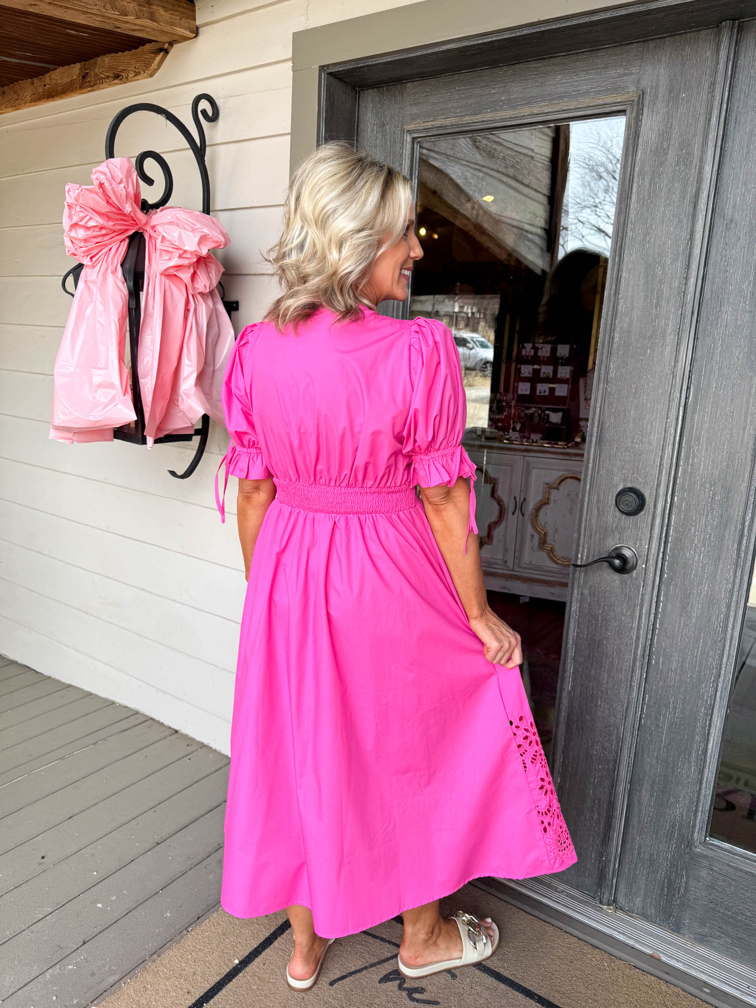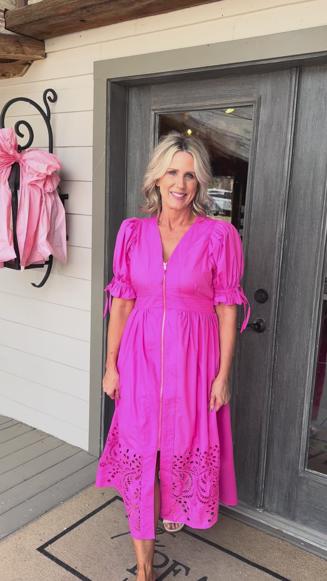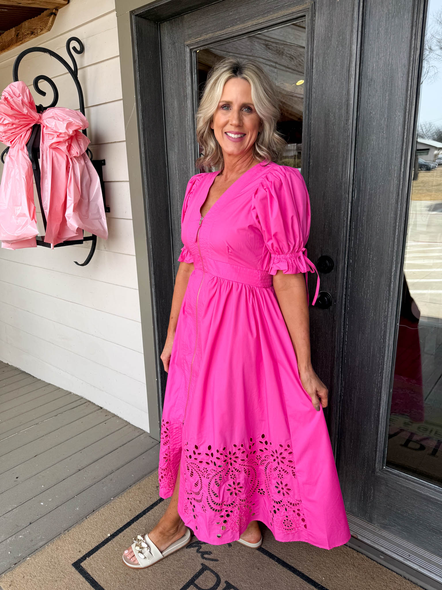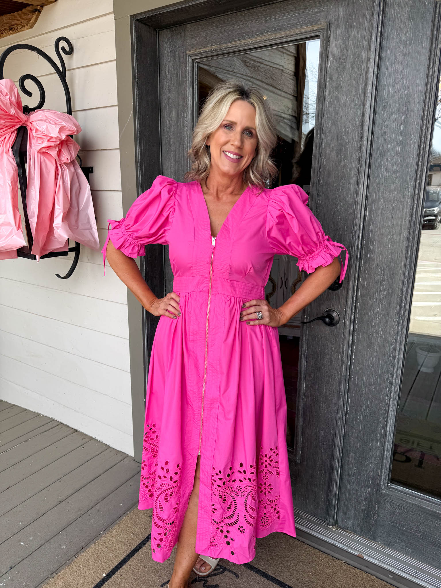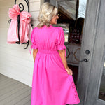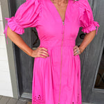 Make a statement in this hot pink Lucy Midi Dress—a playful midi with puffy sleeves, zip-up front, and charming eyelet detailing that transitions effortlessly from day to night.