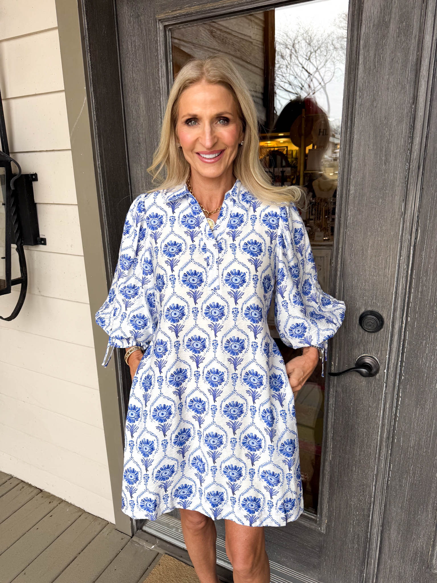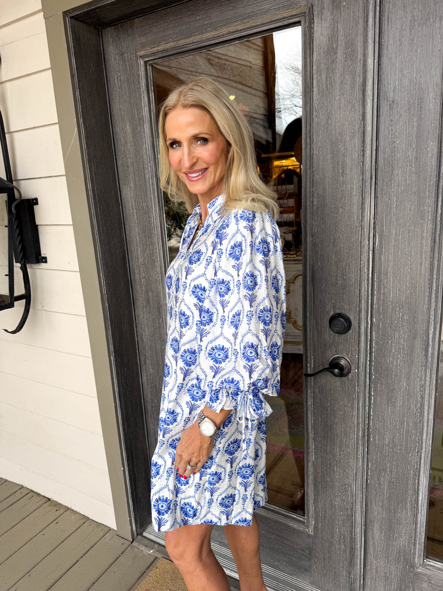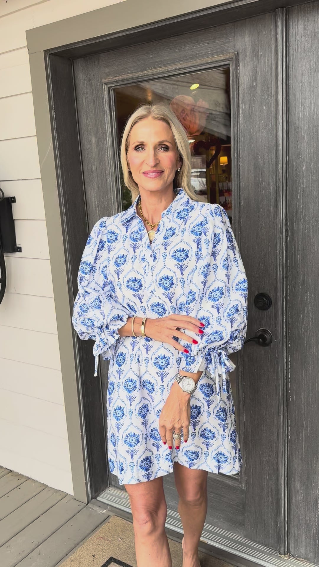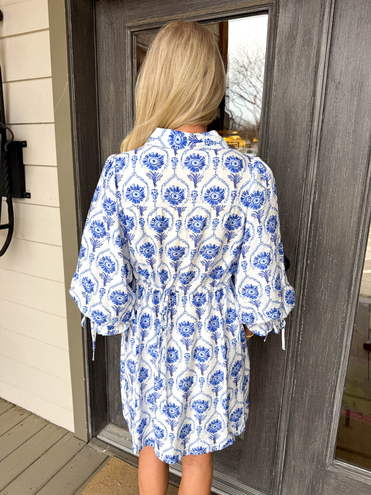 Brighten your wardrobe with this crisp white mini dress that pairs effortless style with a cheerful blue floral print.