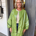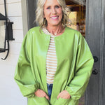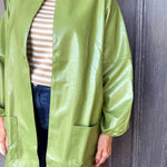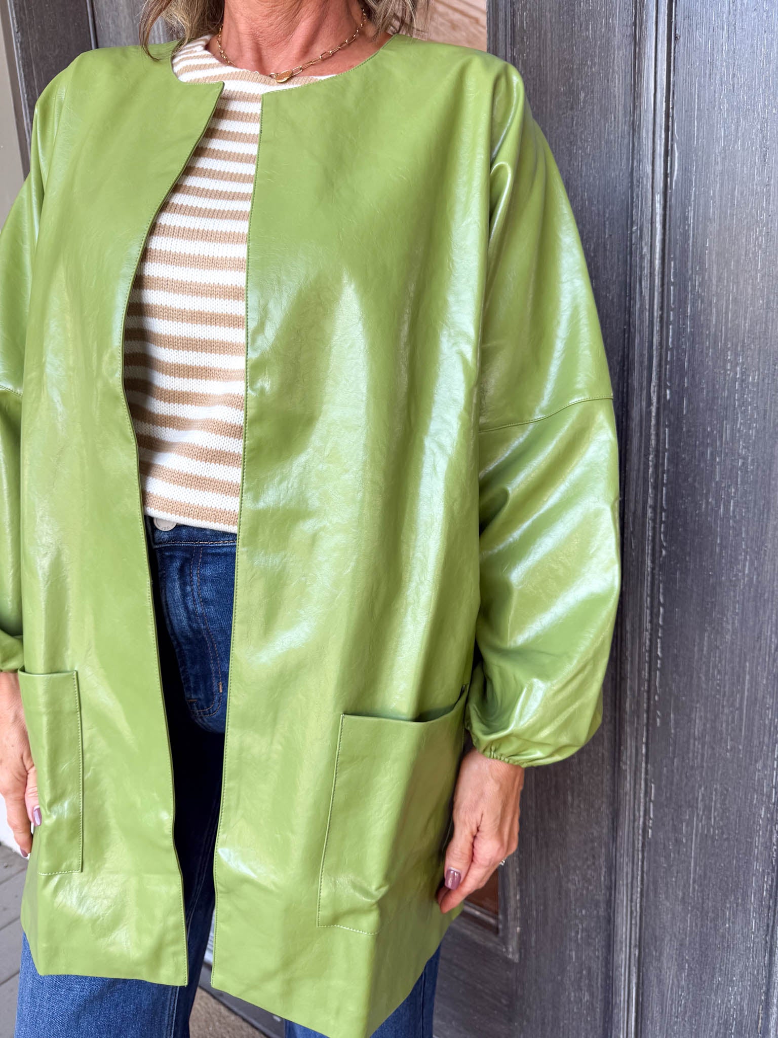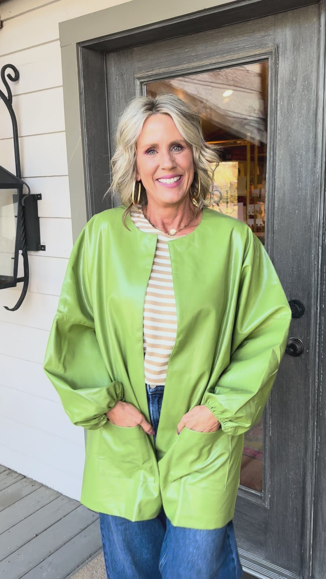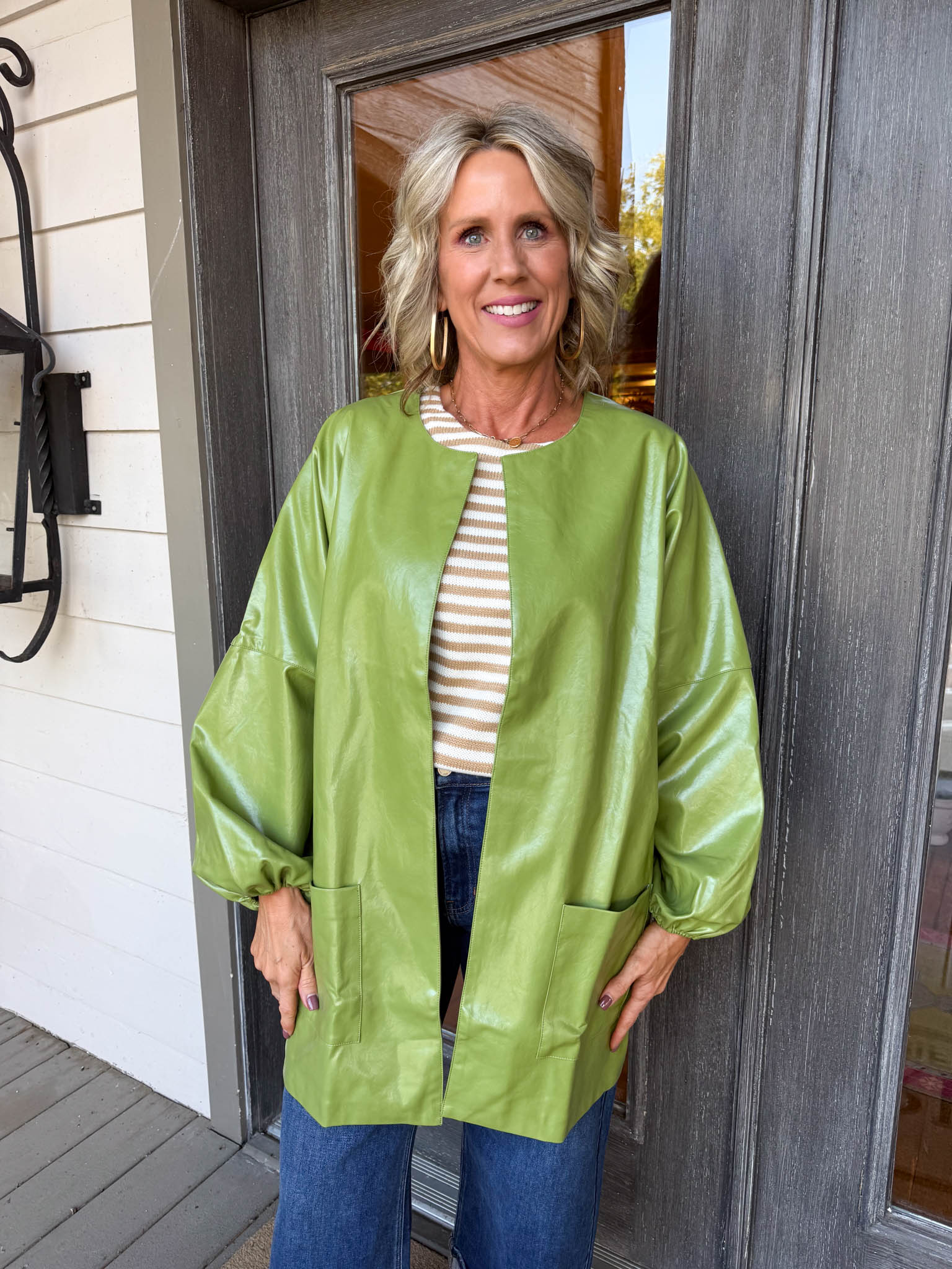 Add a pop of bold energy to your wardrobe with the Matcha Billowy Sleeve Jacket, where bright green faux leather meets dramatic sleeves for a look that’s impossible to ignore.