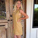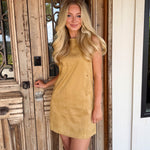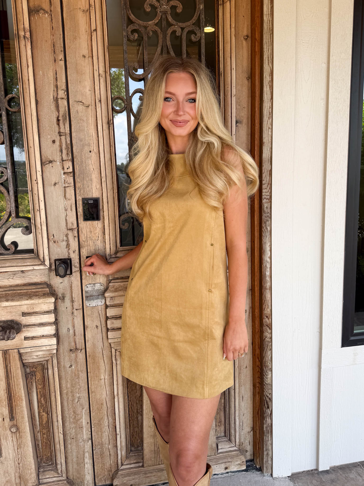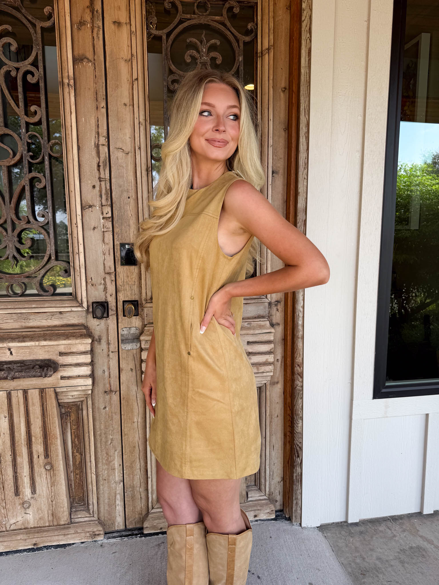 - Studded pockets add a fun, flirty touch to a classic suede shift silhouette.