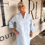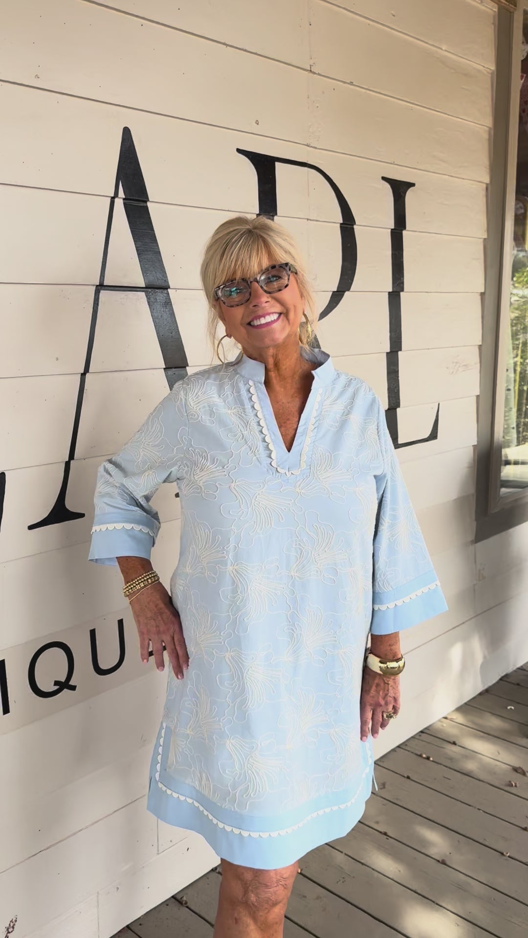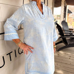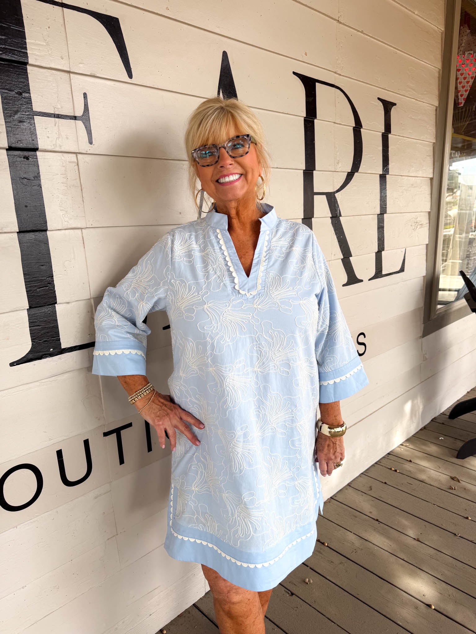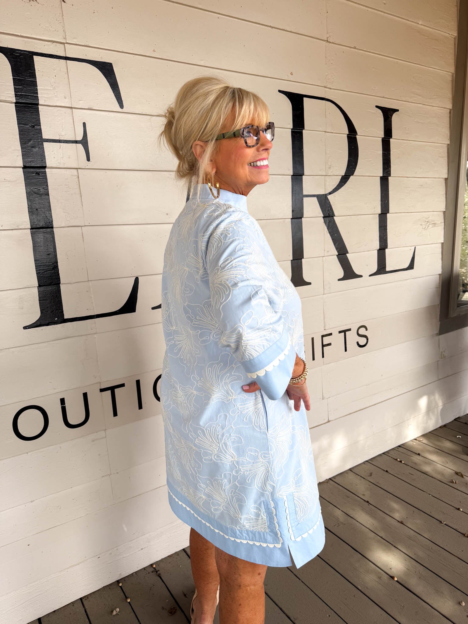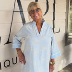 • Crisp blue 3/4 sleeves paired with delicate white floral embroidery for a fresh, feminine touch