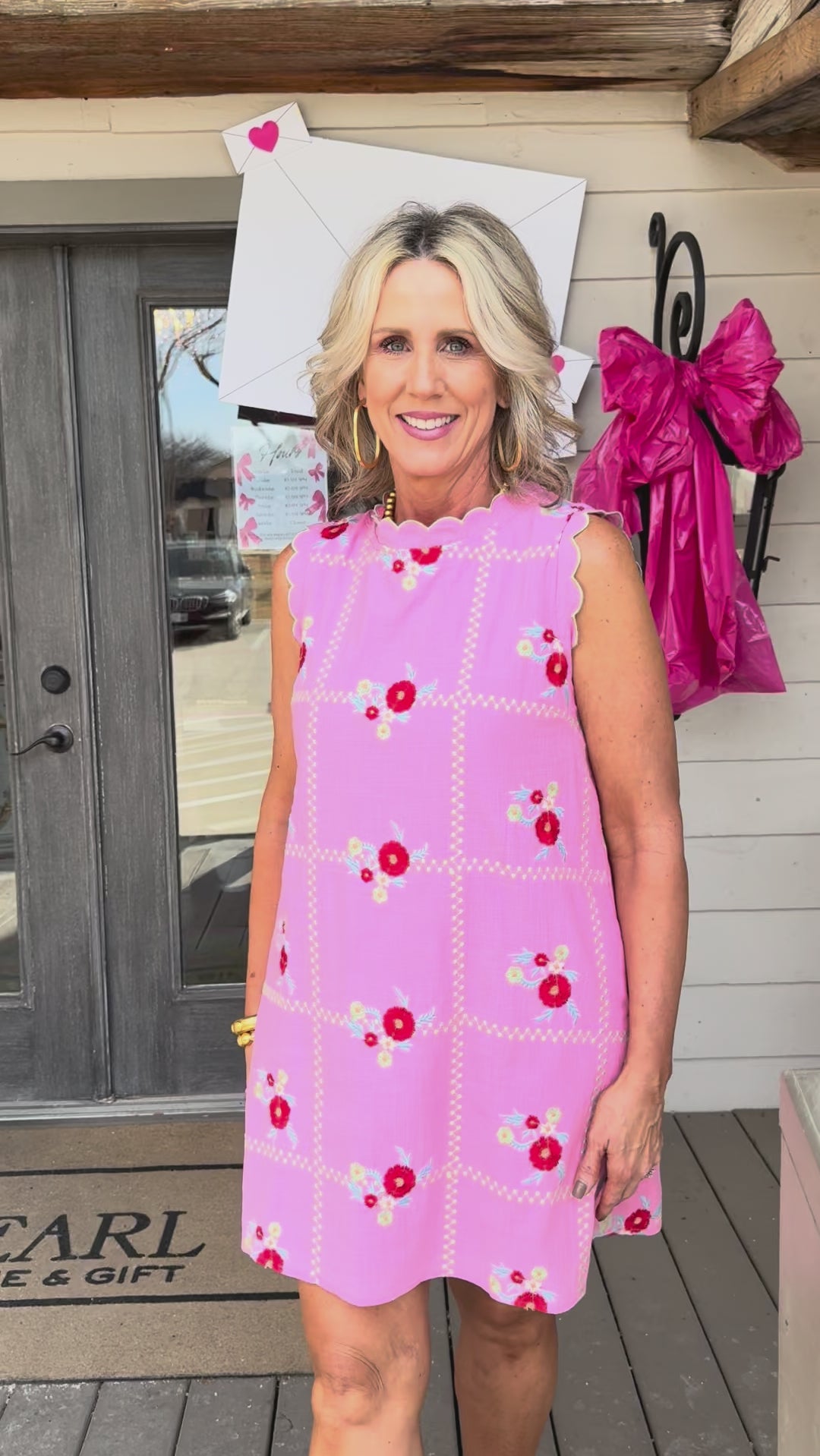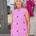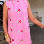 This pink mini dress blooms with blue and green florals and charming details that make every moment feel like a garden party.