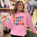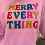 Brighten your day with the Merry Everything Sweatshirt, featuring bold multicolored chenille patch letters that spread festive cheer wherever you go.