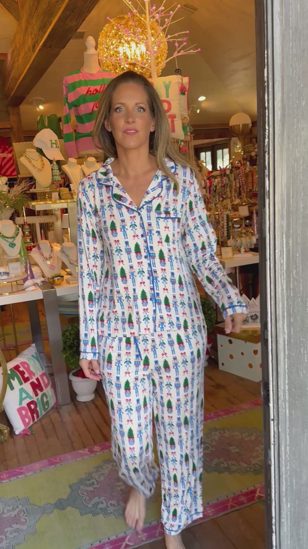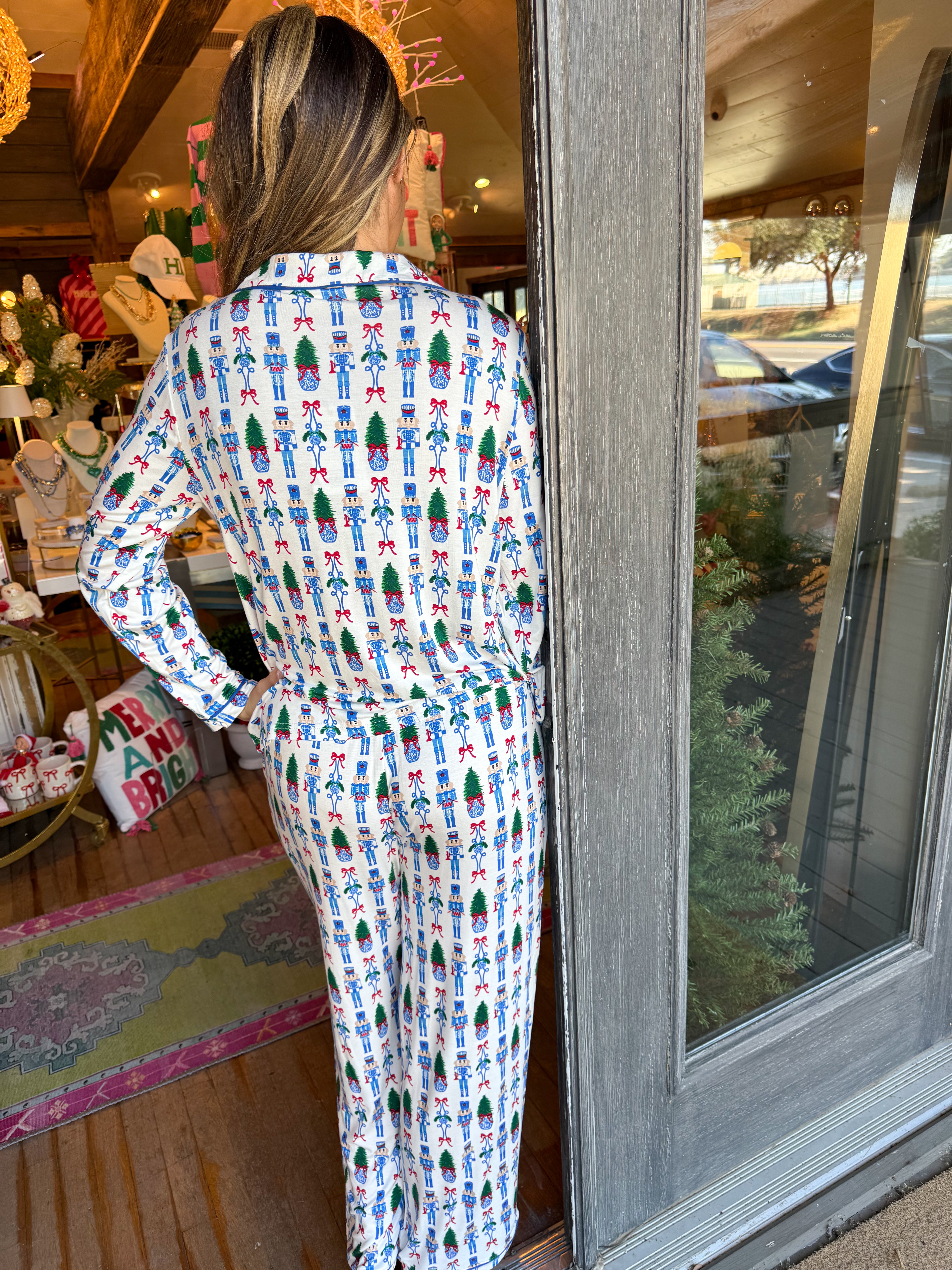 - Soft white button-up top with charming blue nutcracker and topiary prints adds holiday cheer to bedtime