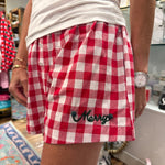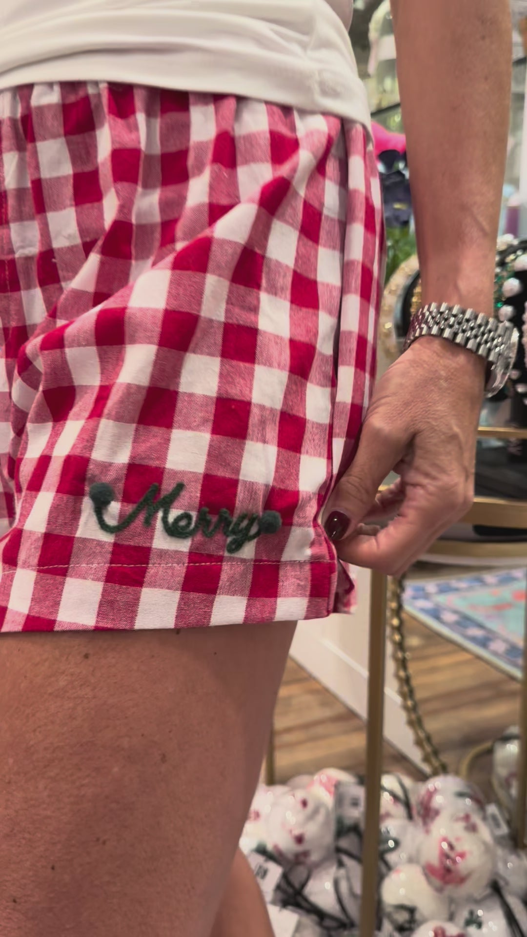Get cozy and festive in these Merry Pom Pom Gingham Shorts, where playful red and white checks meet charming embroidered details for the perfect holiday lounge look.