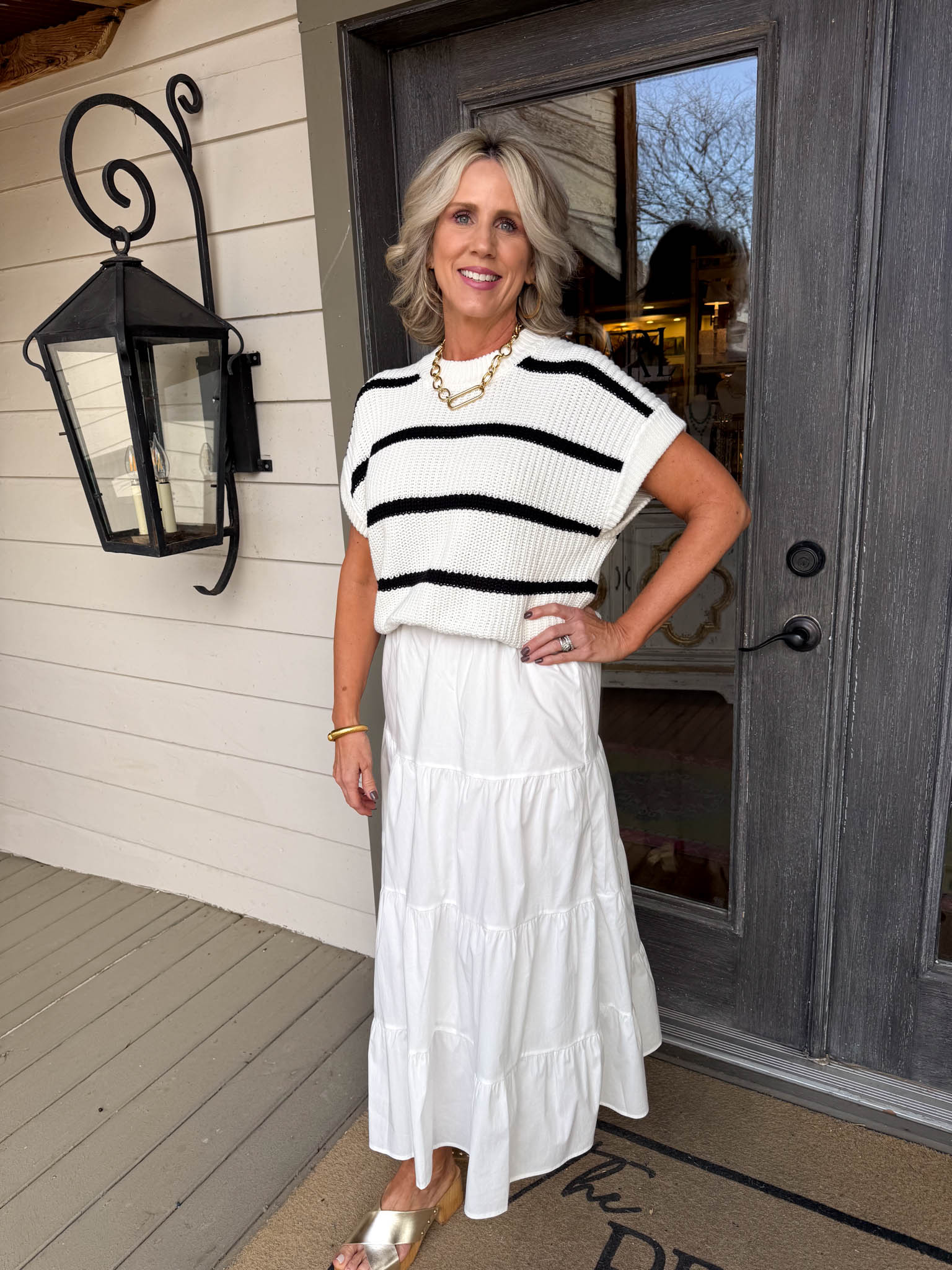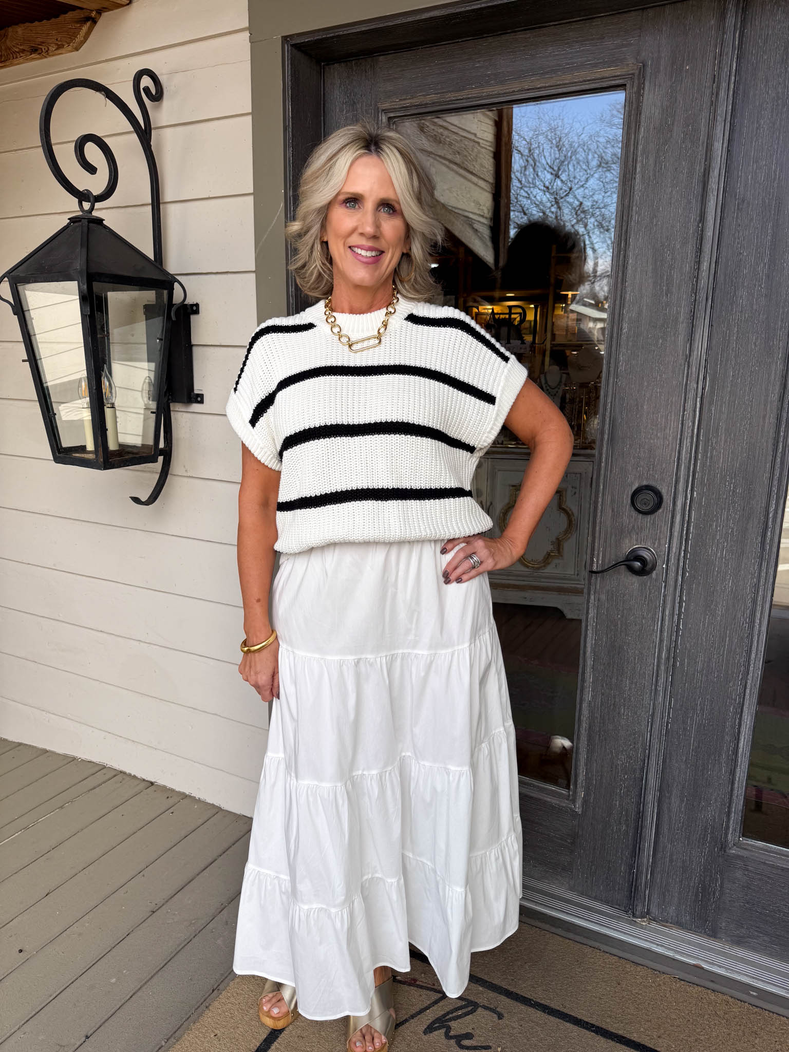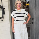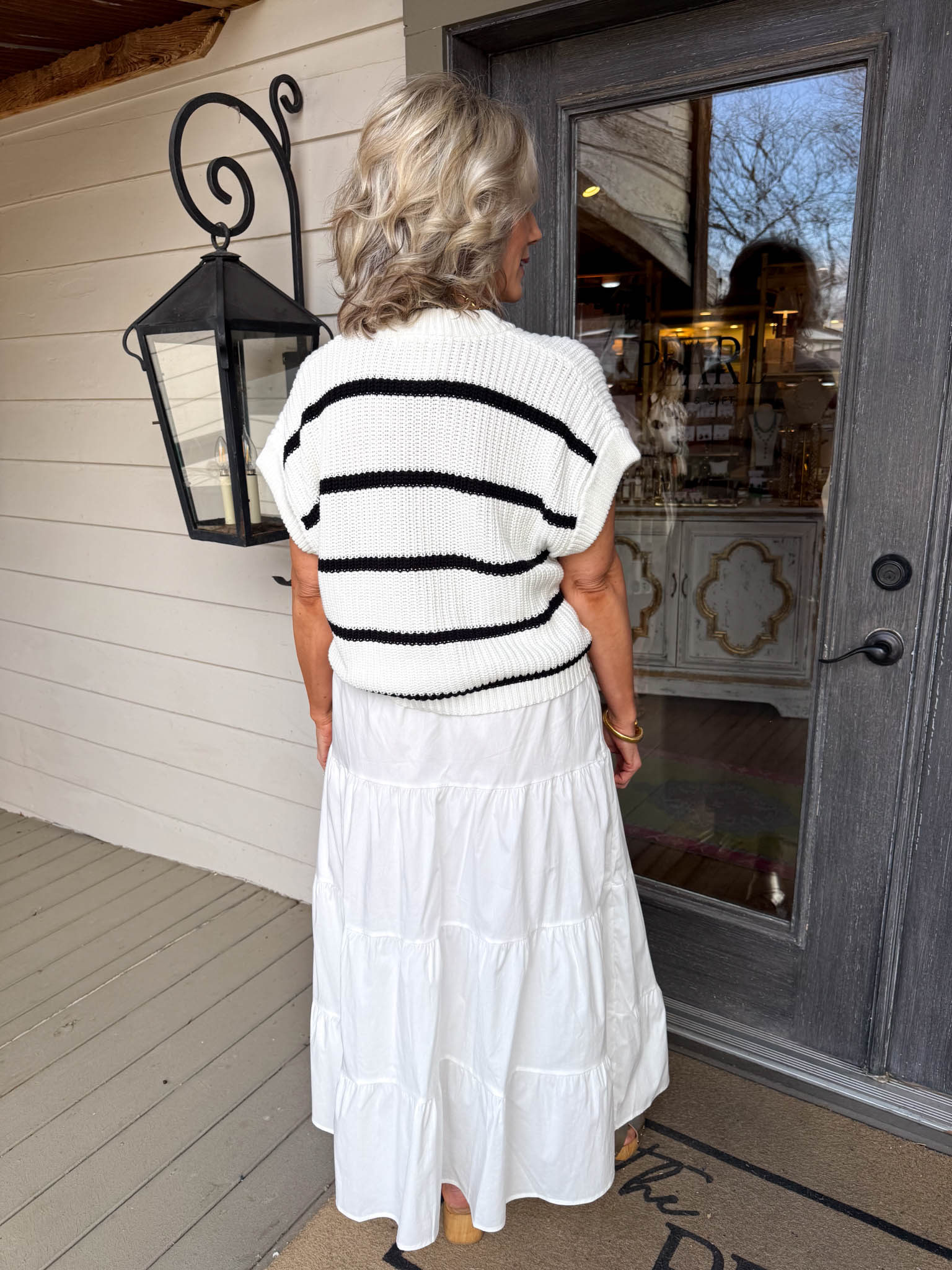 Effortlessly chic, this dress pairs a crisp black-and-white striped sweater top with a dreamy white tiered skirt for an instantly polished look.