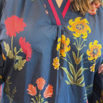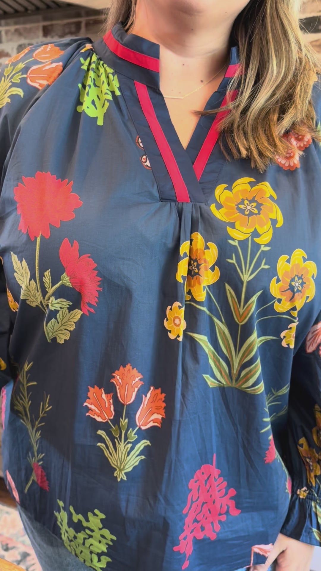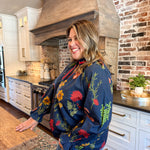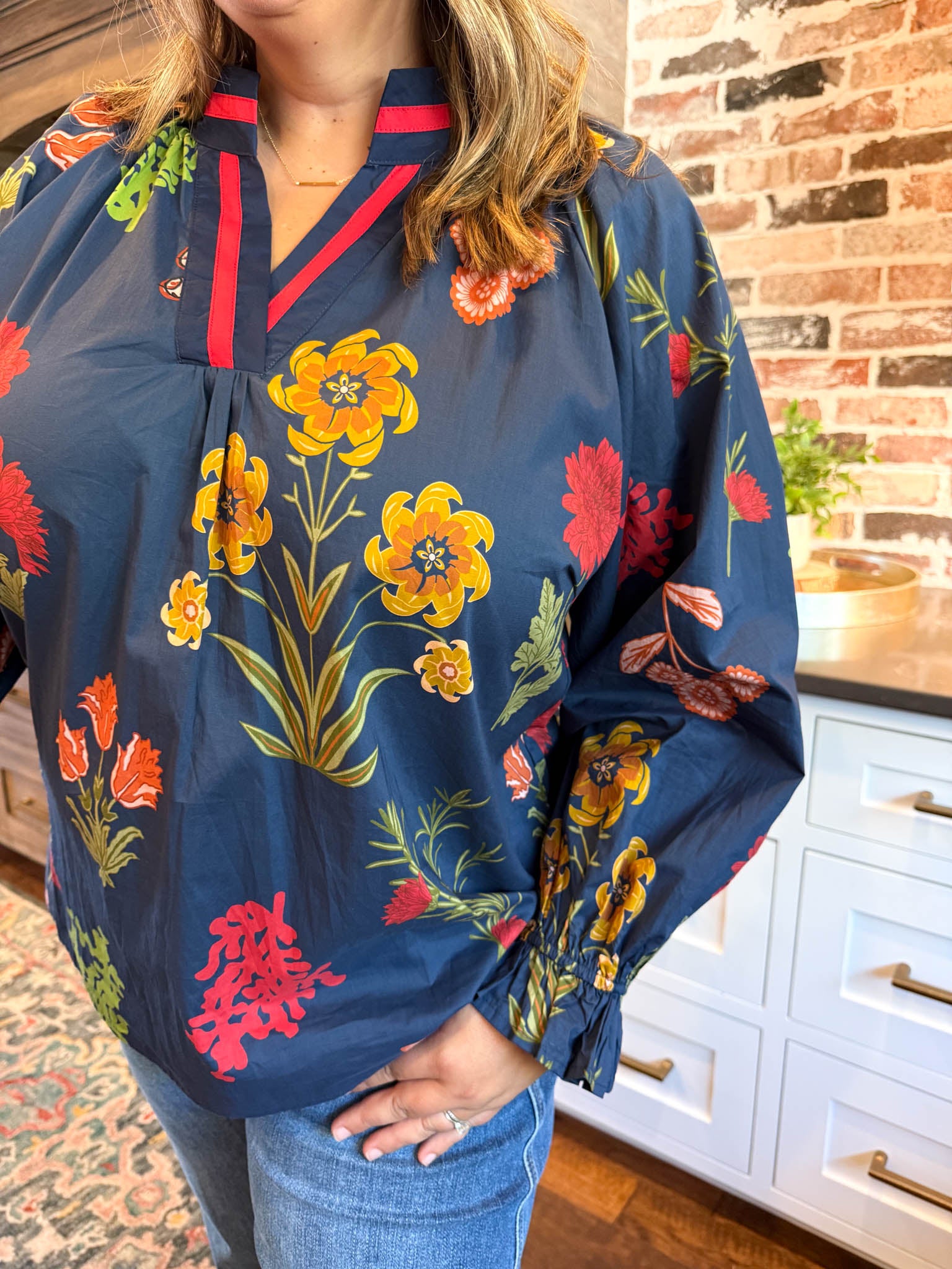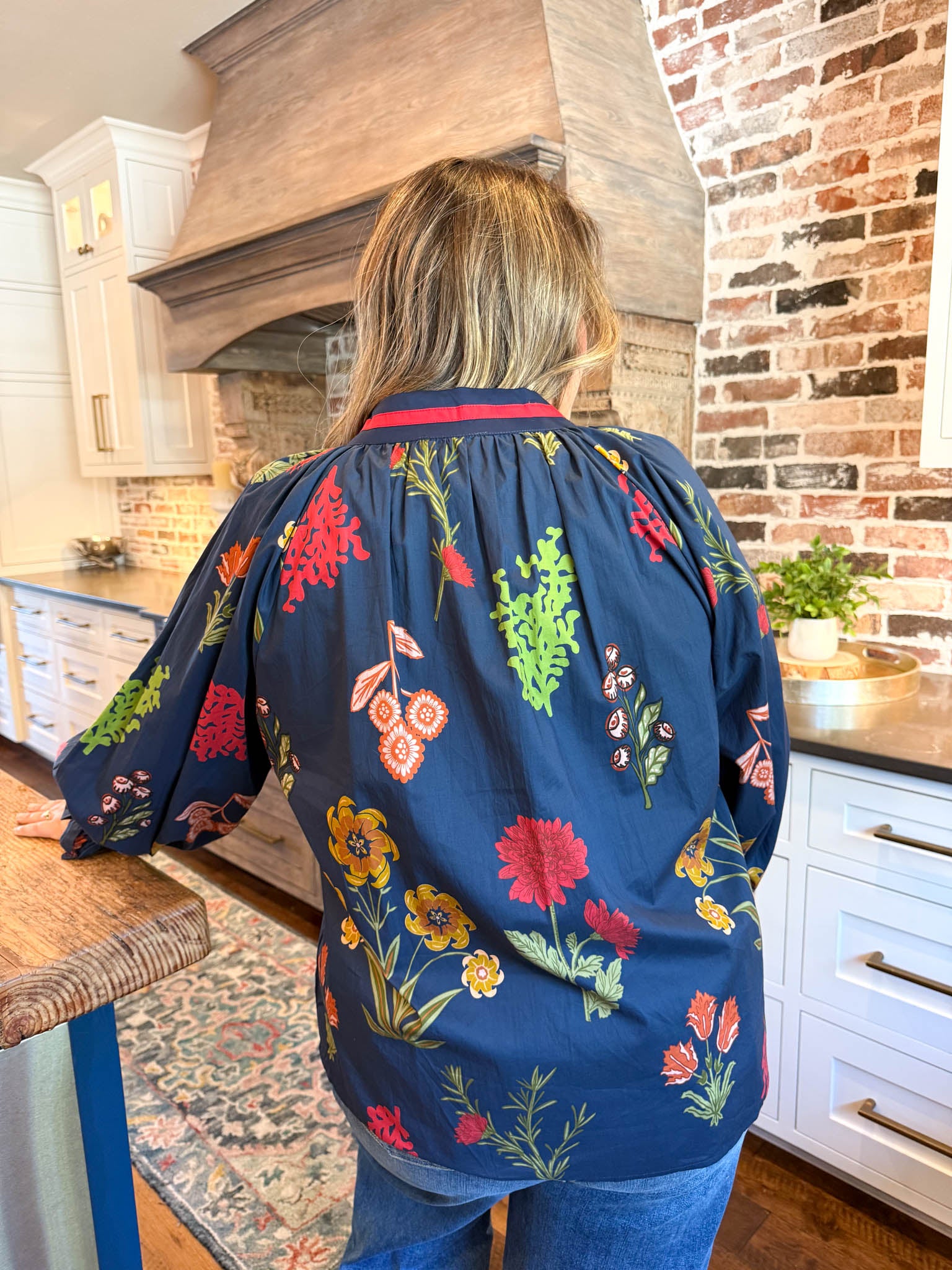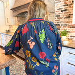 Elevate your style with the Calliope Blouse—a playful mix of navy warmth and delicate floral charm, perfect for turning heads wherever you go.
