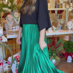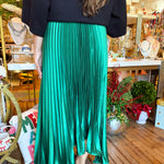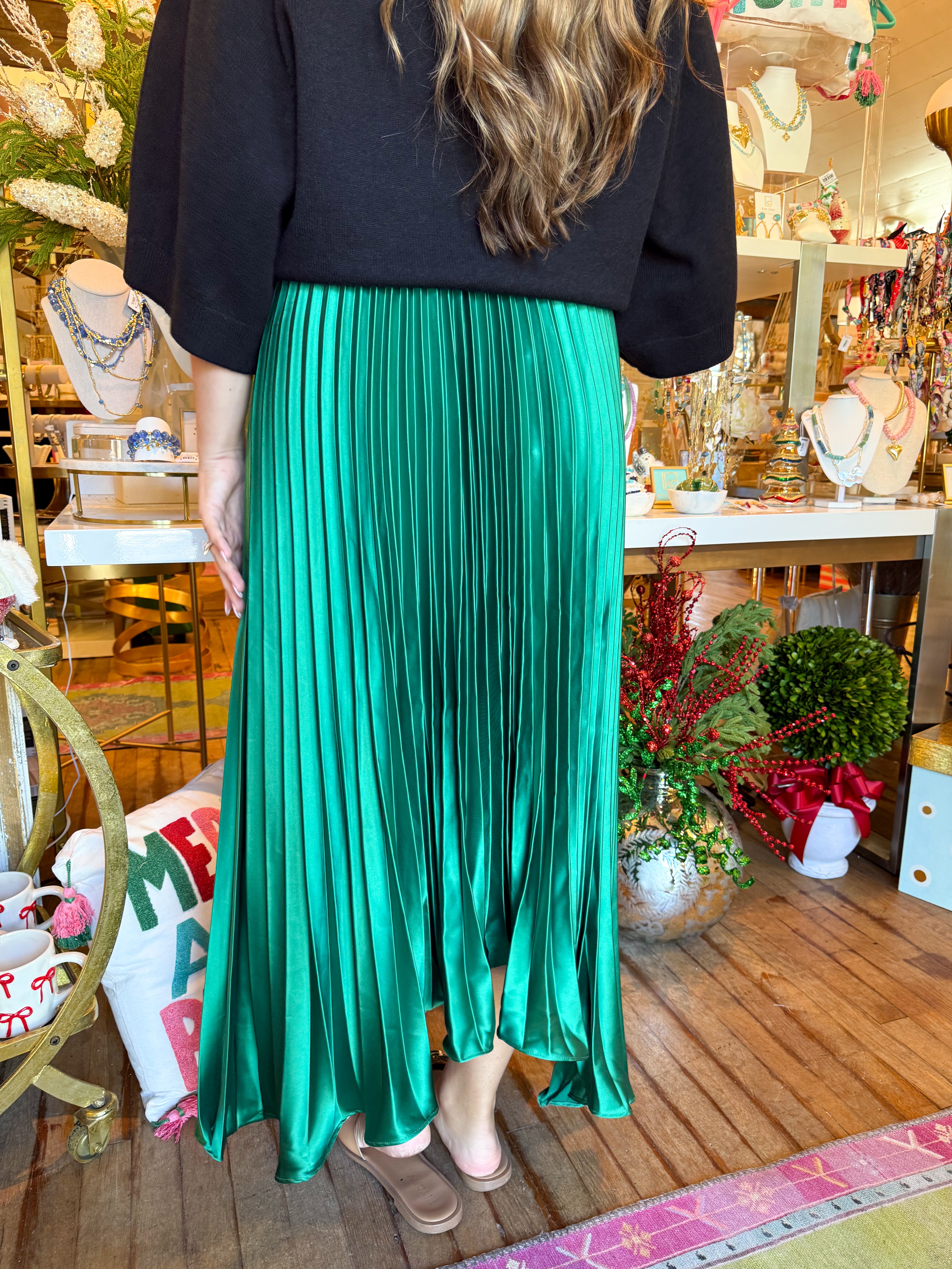 Turn heads with the Millie Midi Skirt, featuring emerald green pleats and a flirty asymmetrical cut that dances with every step.