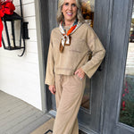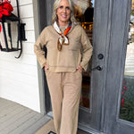 • Cropped 3/4 sleeve top pairs perfectly with drawstring lounge pants for a coordinated, put-together vibe
