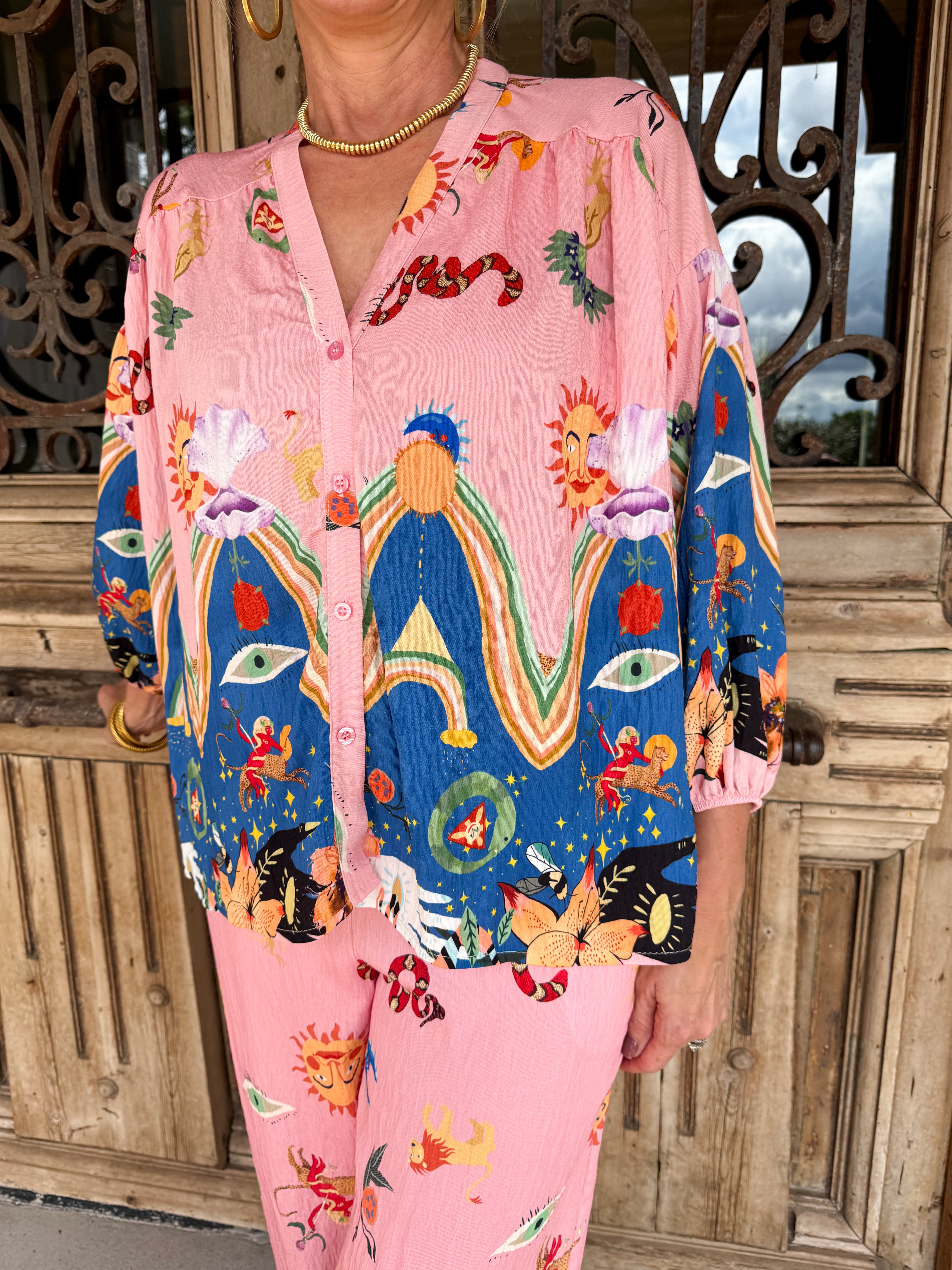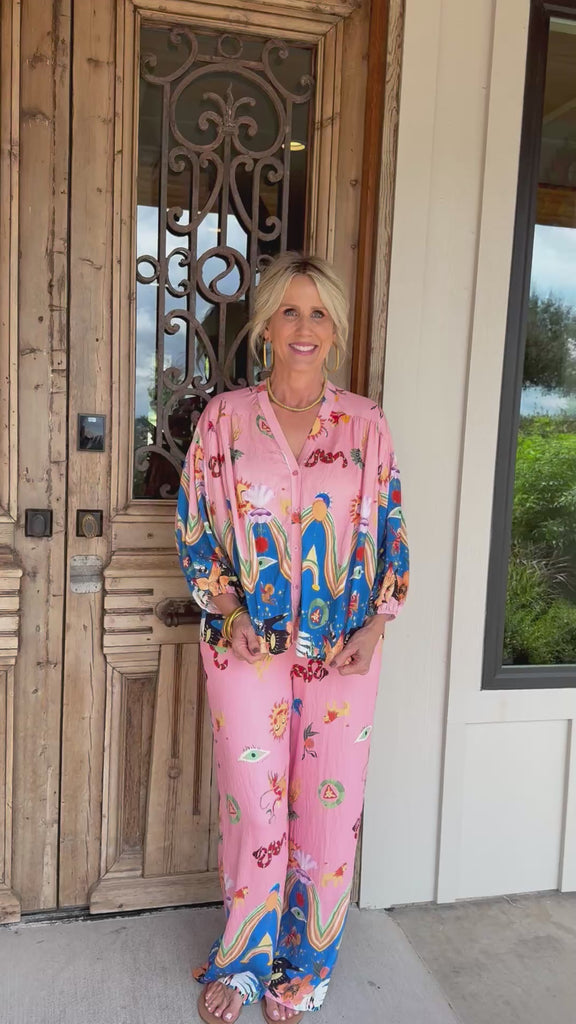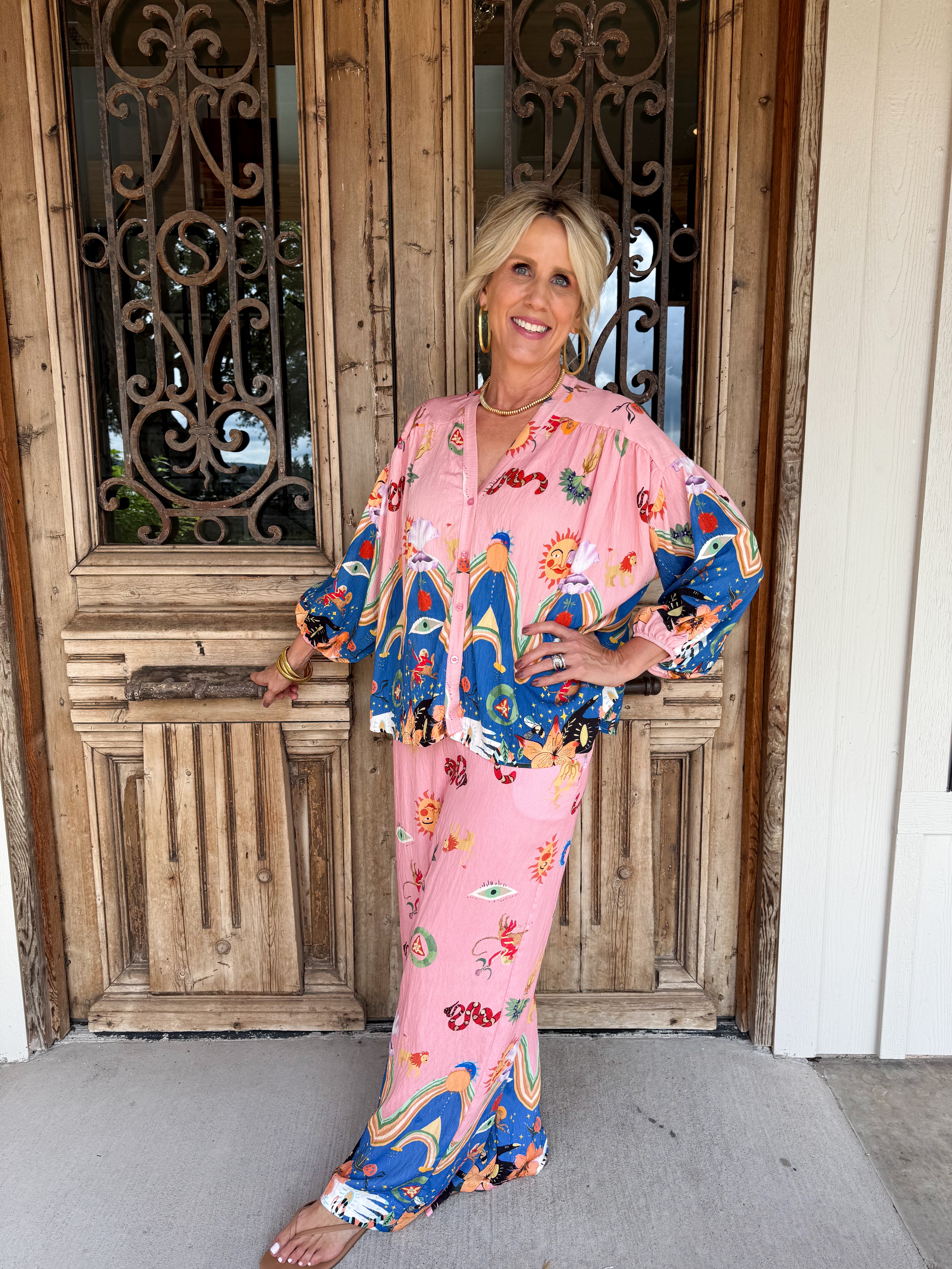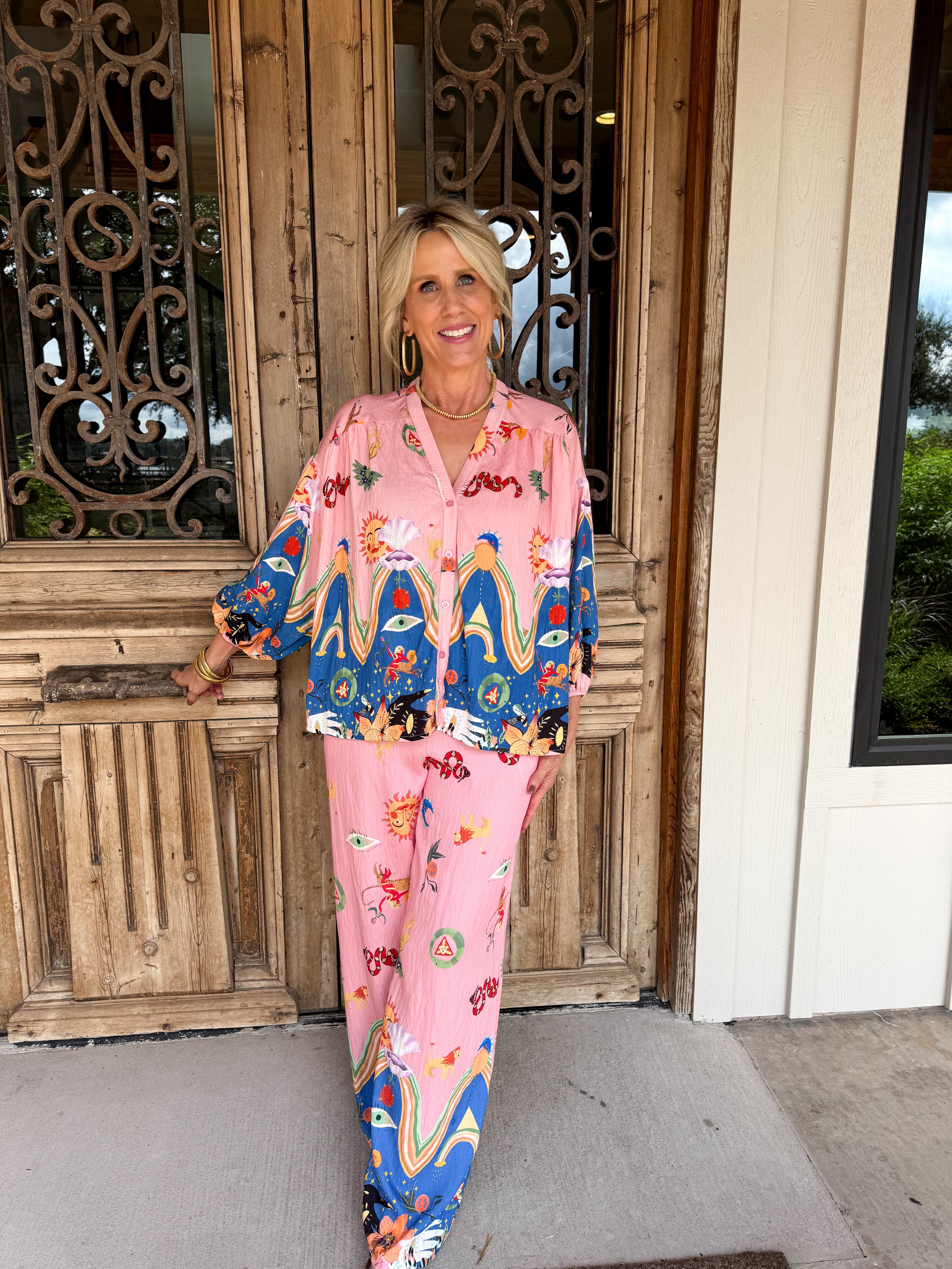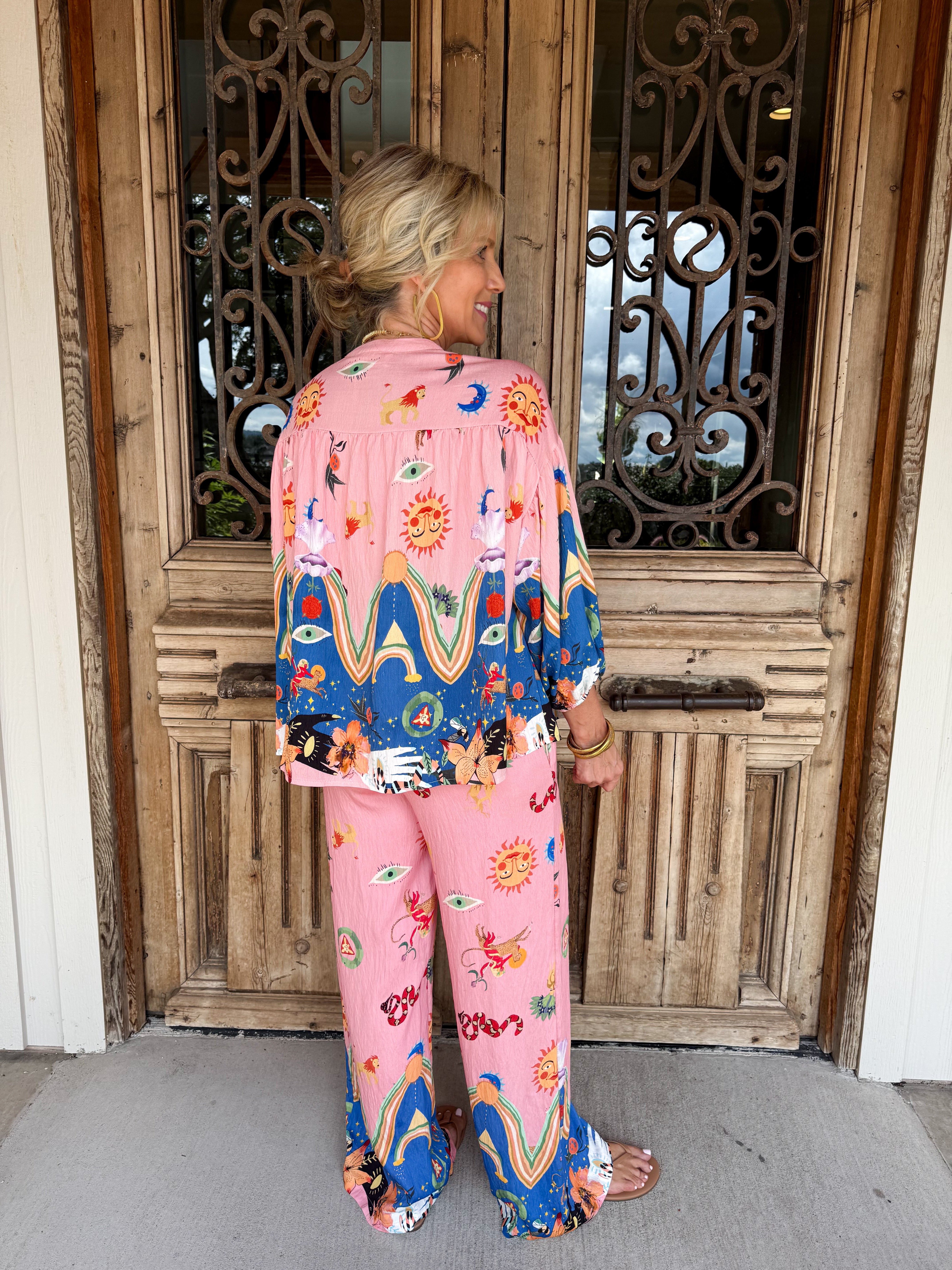 Turn heads with the Mykonos Ilios Set, where silky pink satin meets vibrant multicolor prints for a look that’s as fun as it is fabulous.