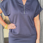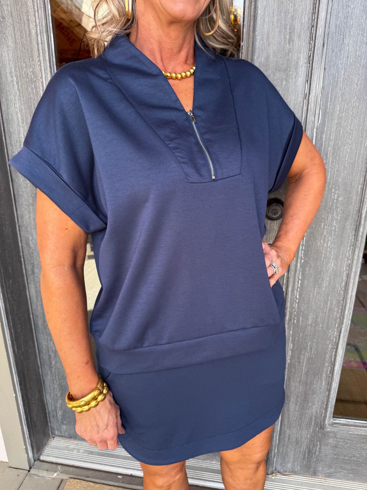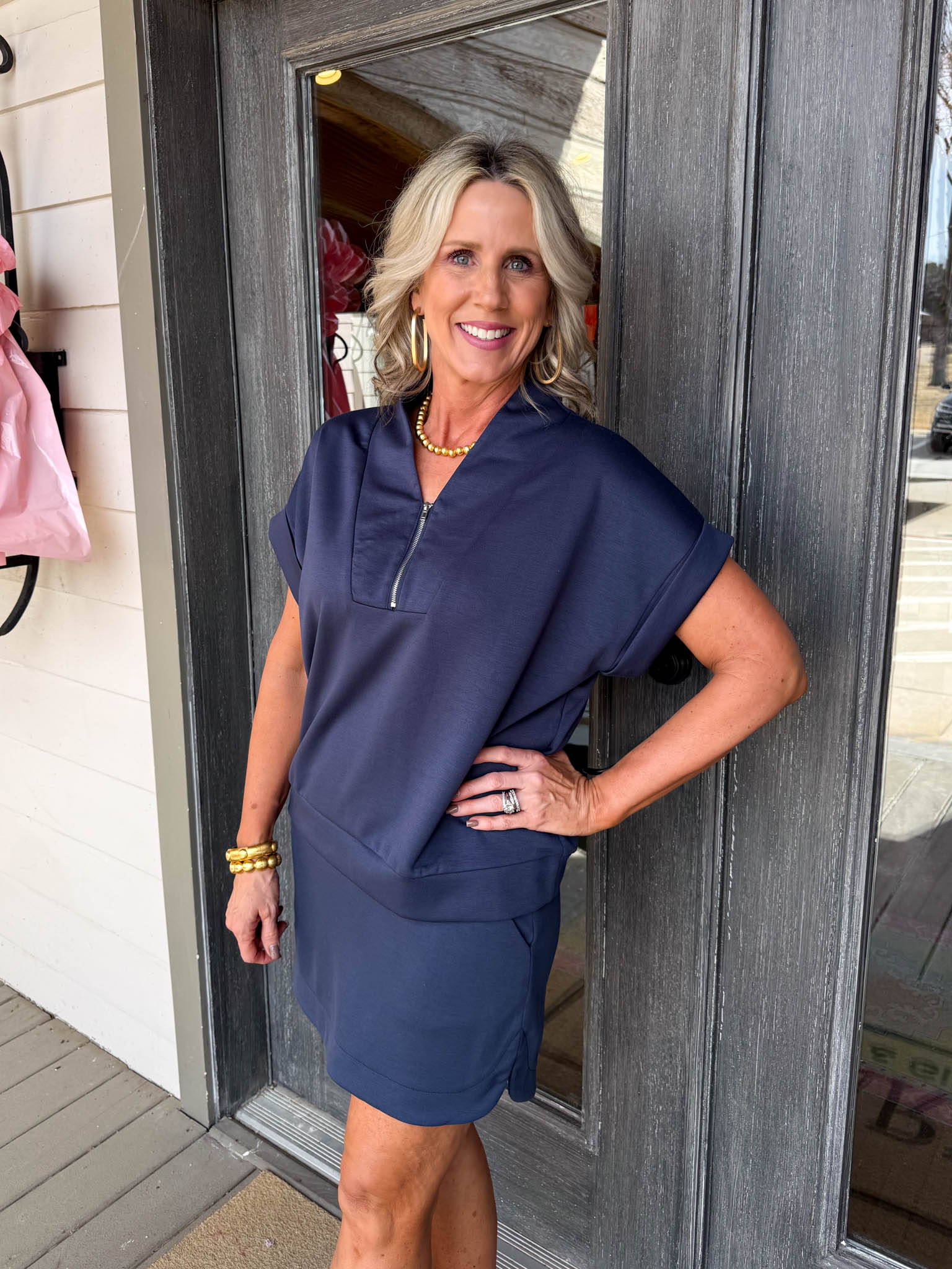 Elevate your everyday with this sleek navy set that blends sporty sophistication—a relaxed drop-shoulder half-zip top pairs seamlessly with a high-waist A-line skort for a look that's equal parts cozy and chic.