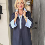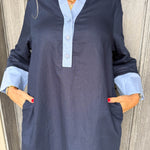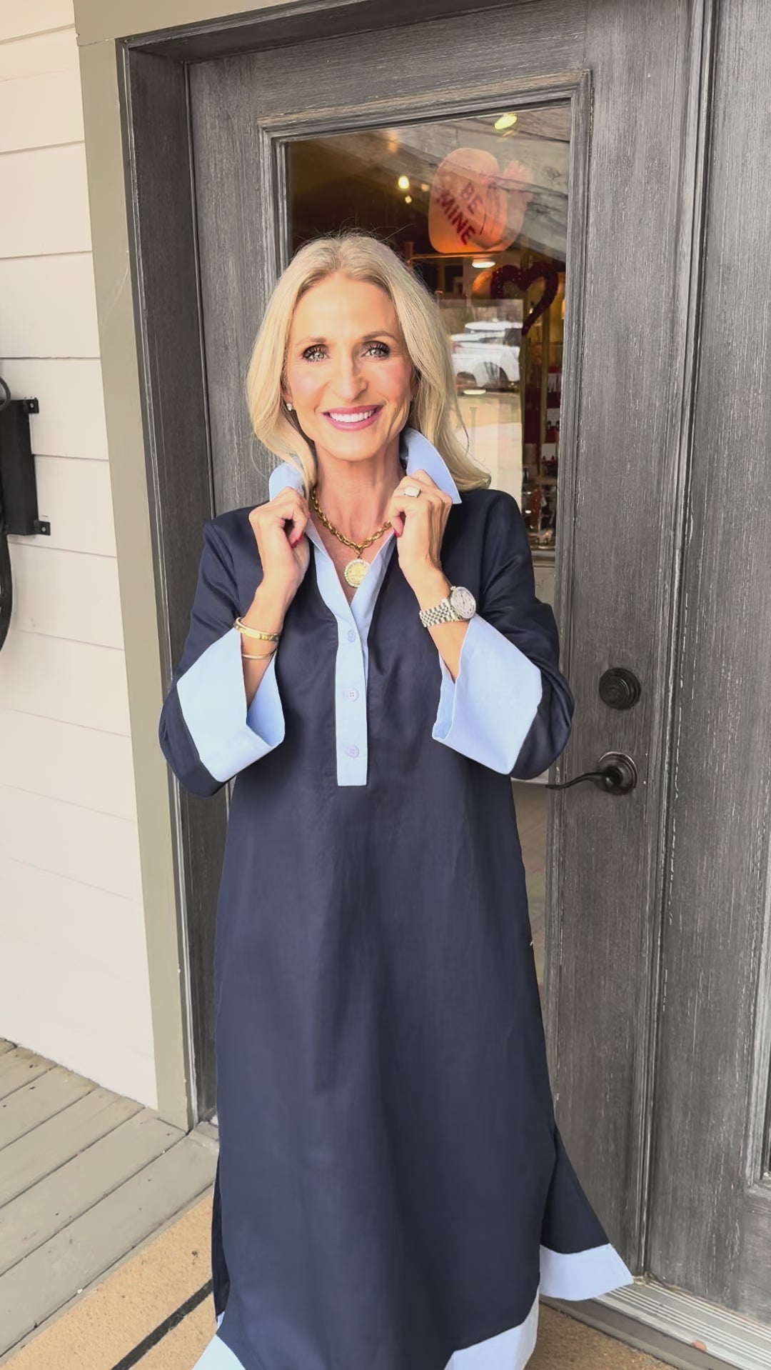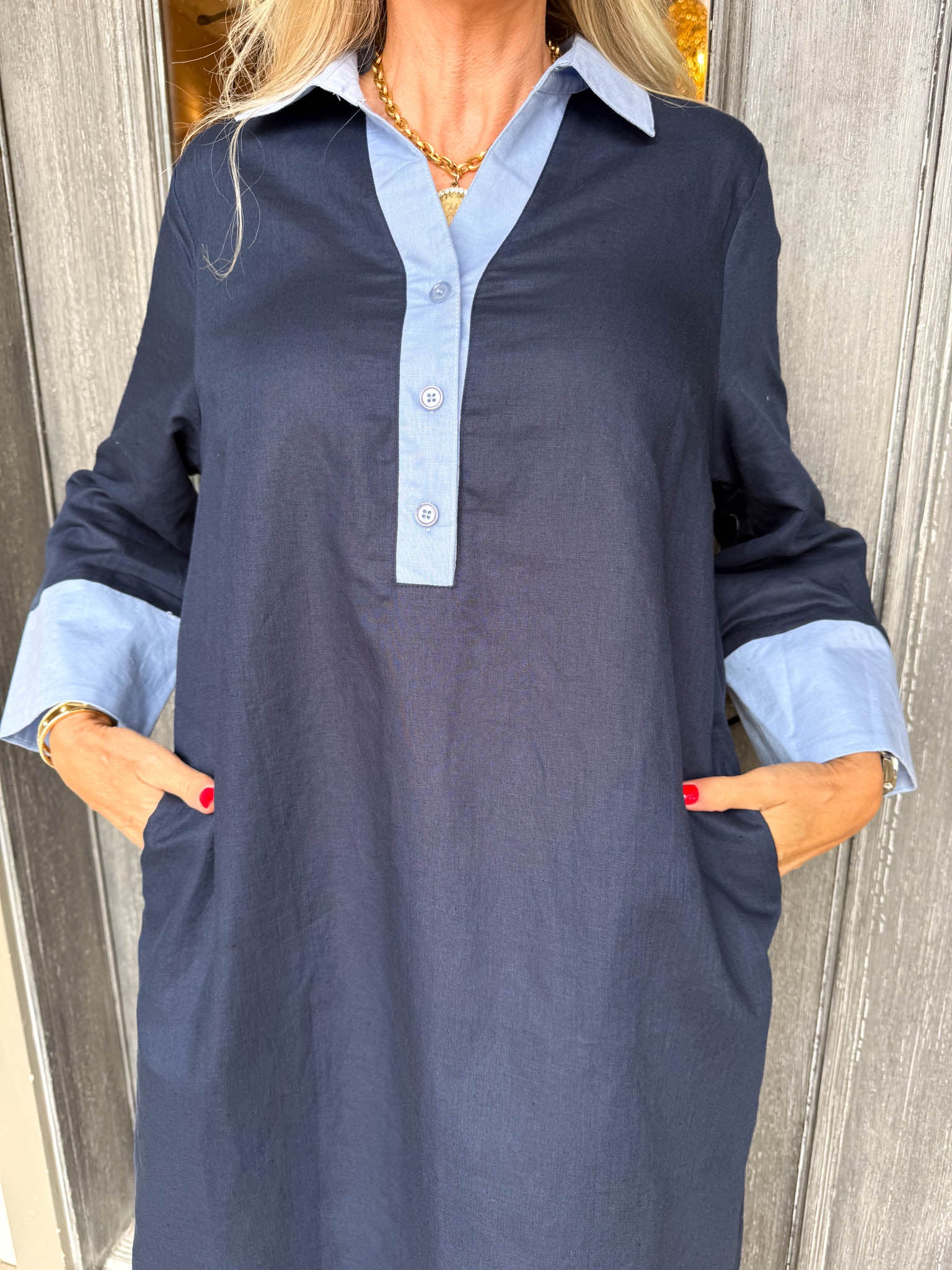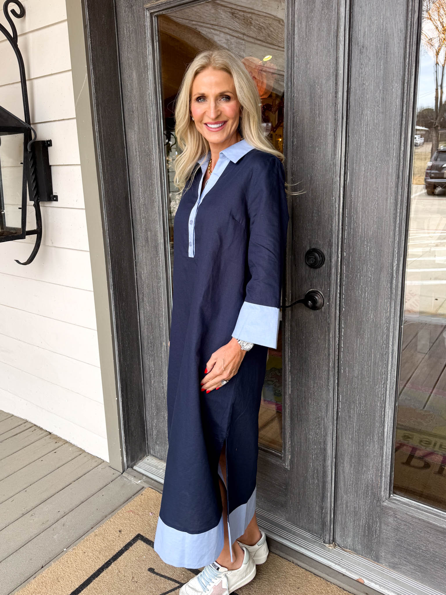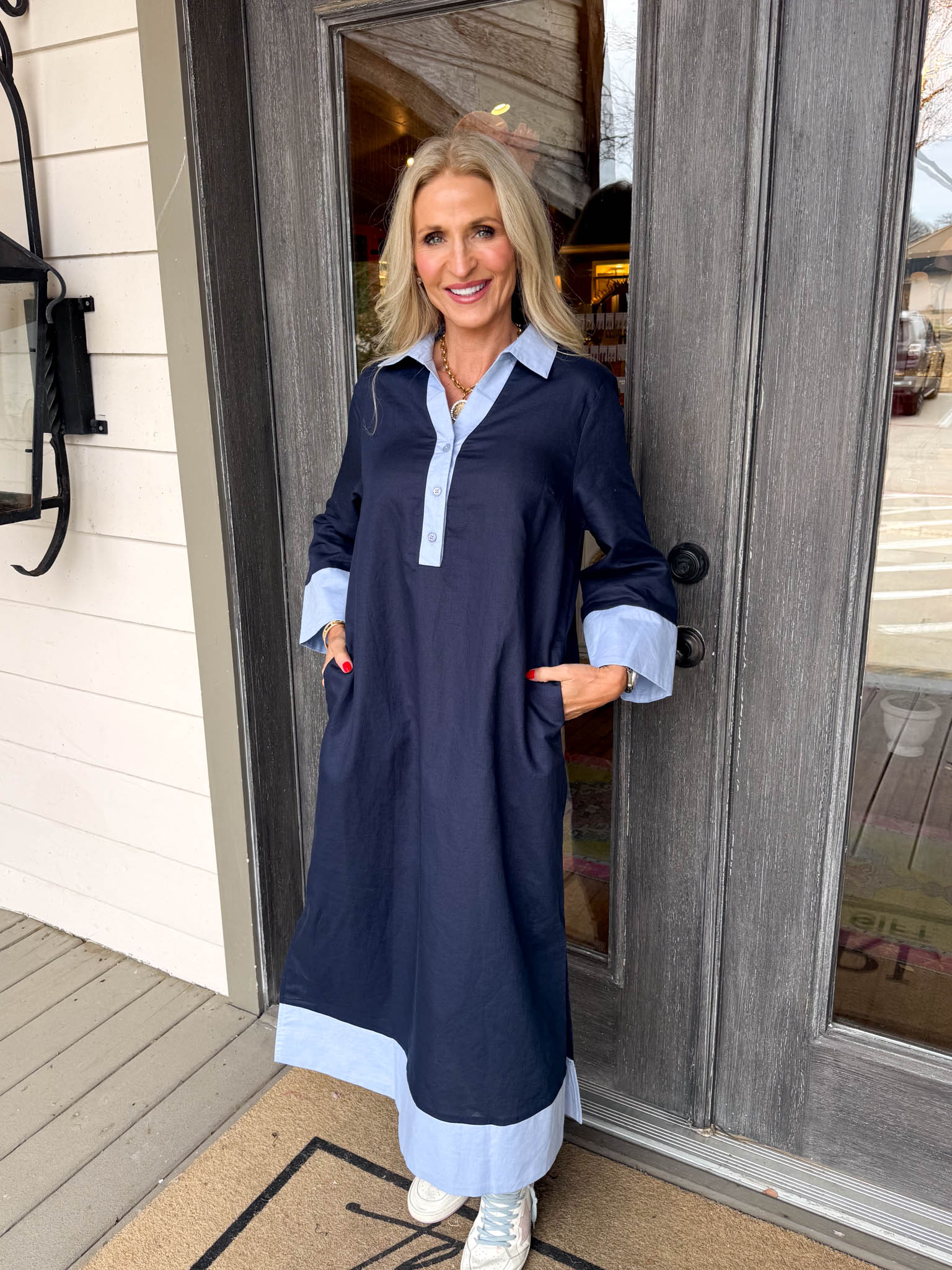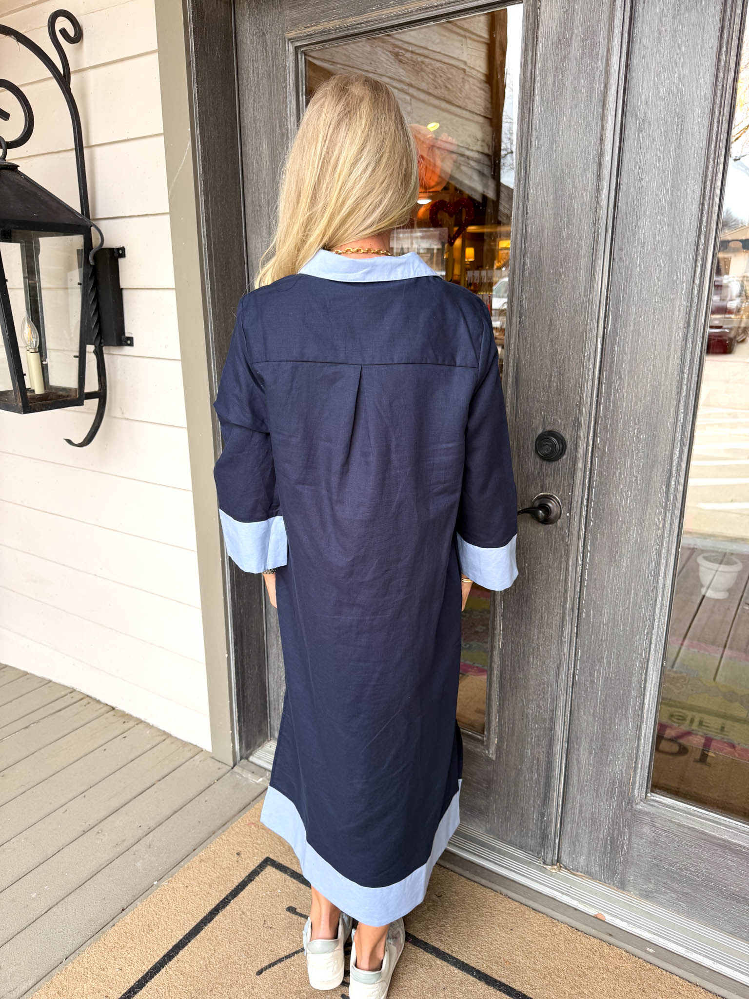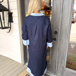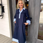 - Featuring long sleeves and charming light blue accents at the collar and hem. Designed for a refined silhouette, this midi dress transitions effortlessly from day to evening.