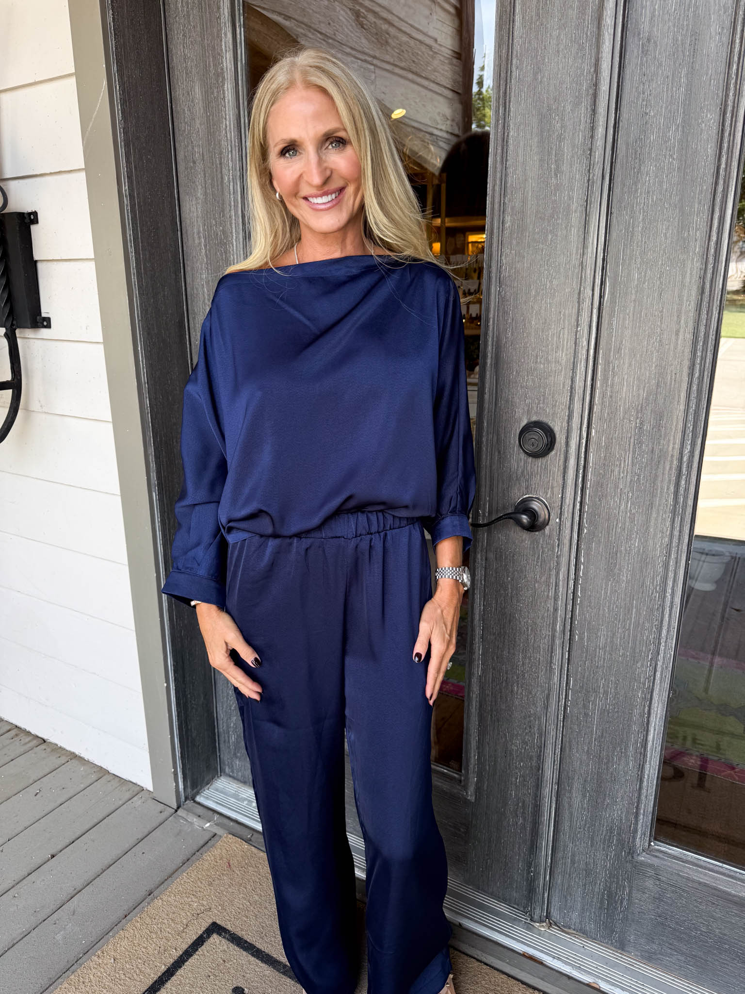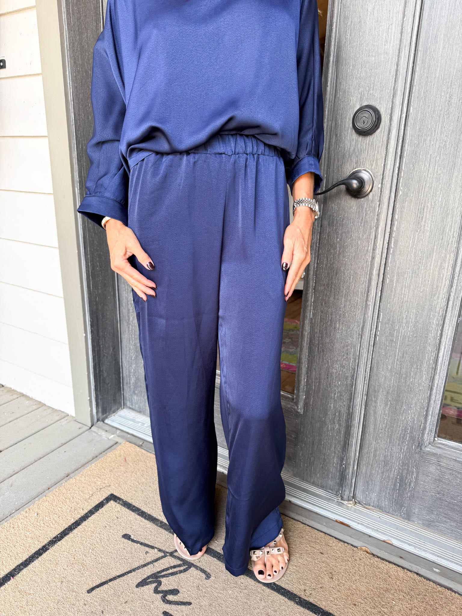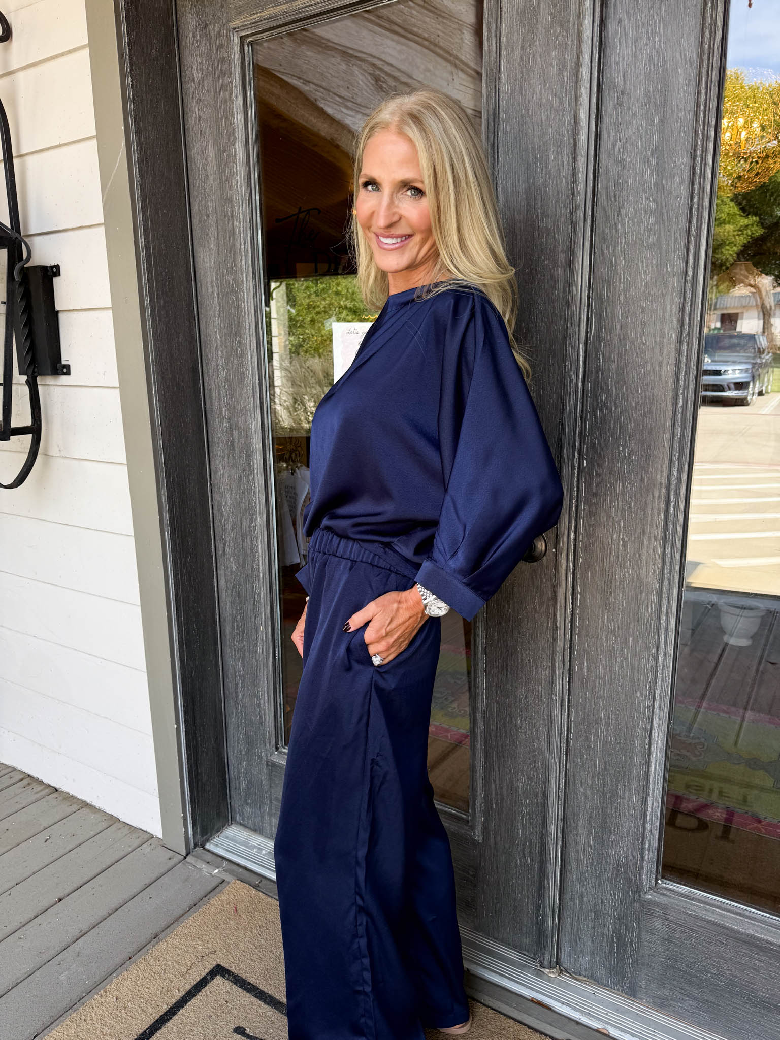 Elevate your wardrobe with the Navy Prussian Satin Set, where playful balloon sleeves meet elegantly flowy satin pants for effortless charm.