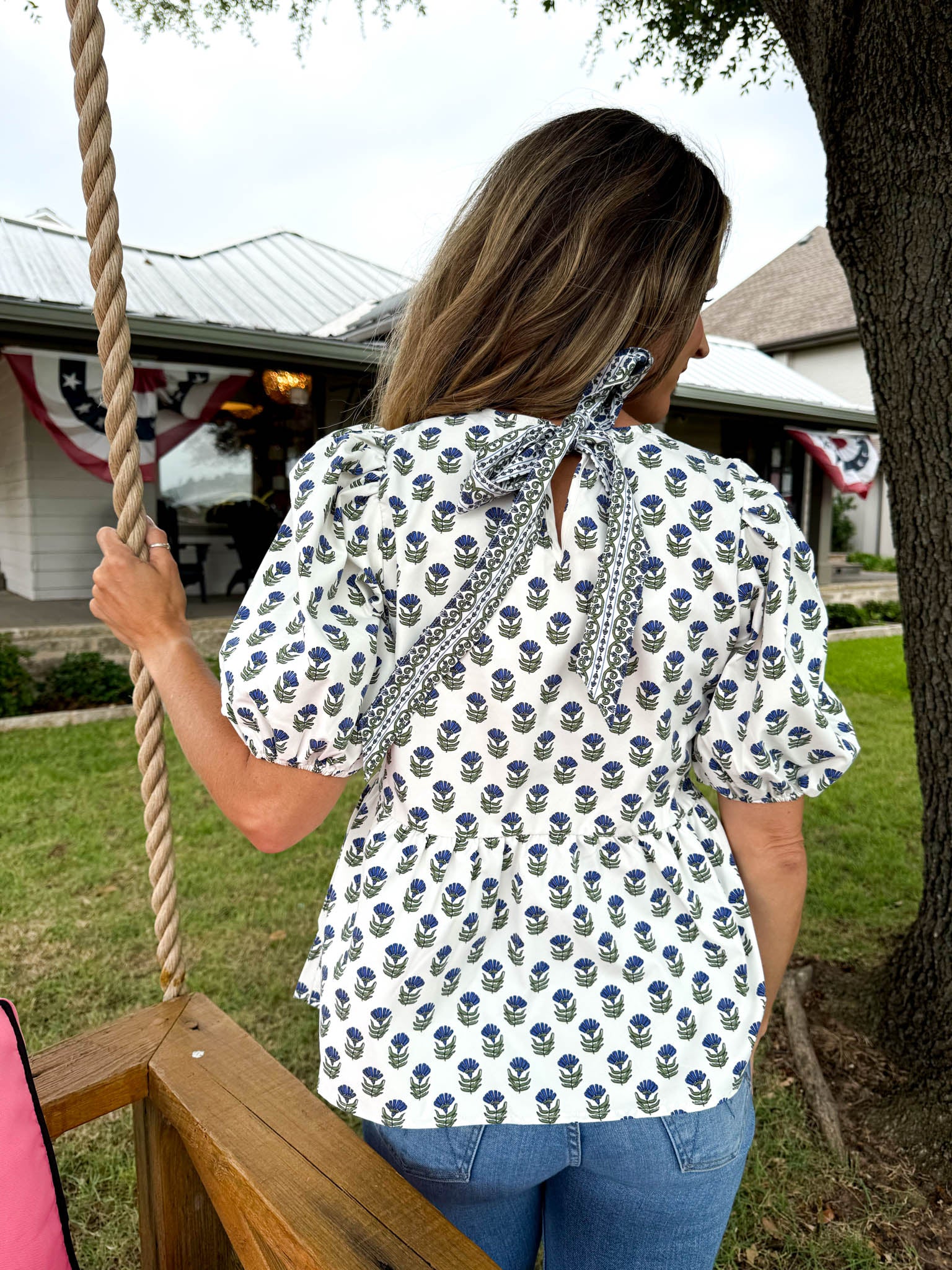 This playful blue and white striped blouse with an adorable floral print is your new go-to for effortless charm and flirty fun.