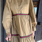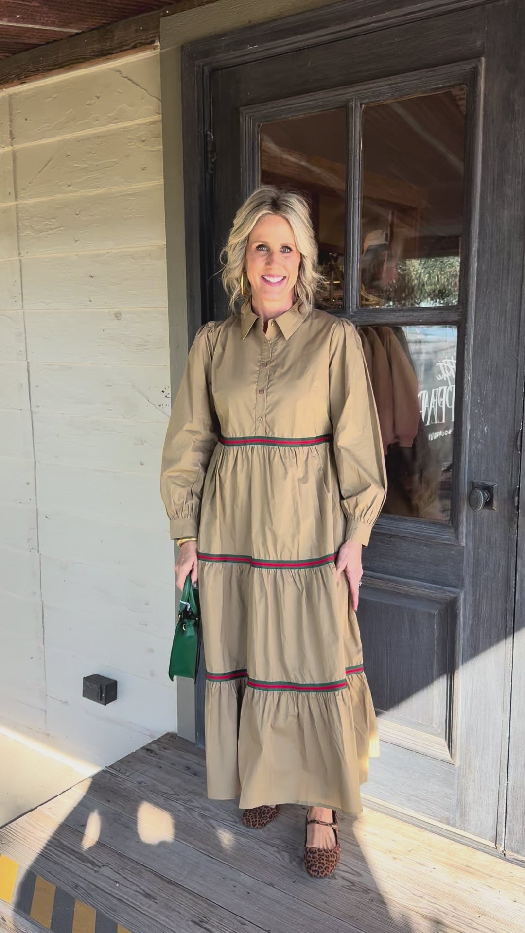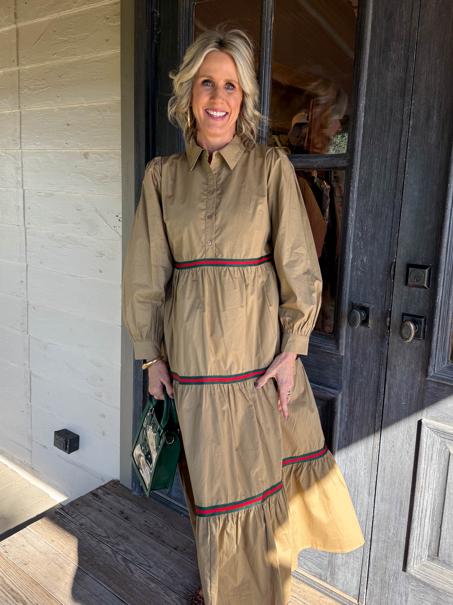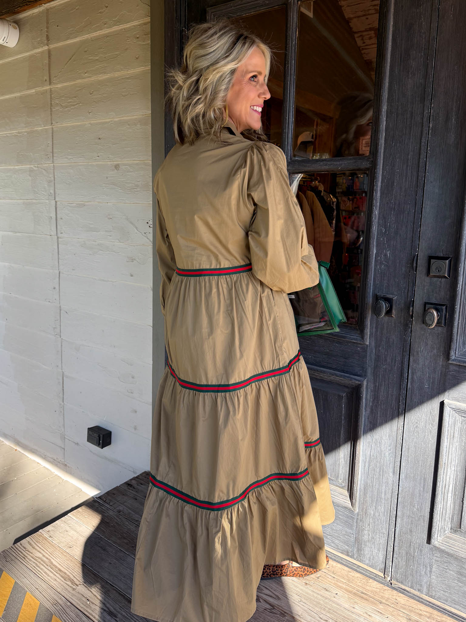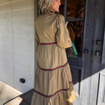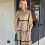 This tan tiered maxi dress is your go-to for effortless elegance with a festive twist!