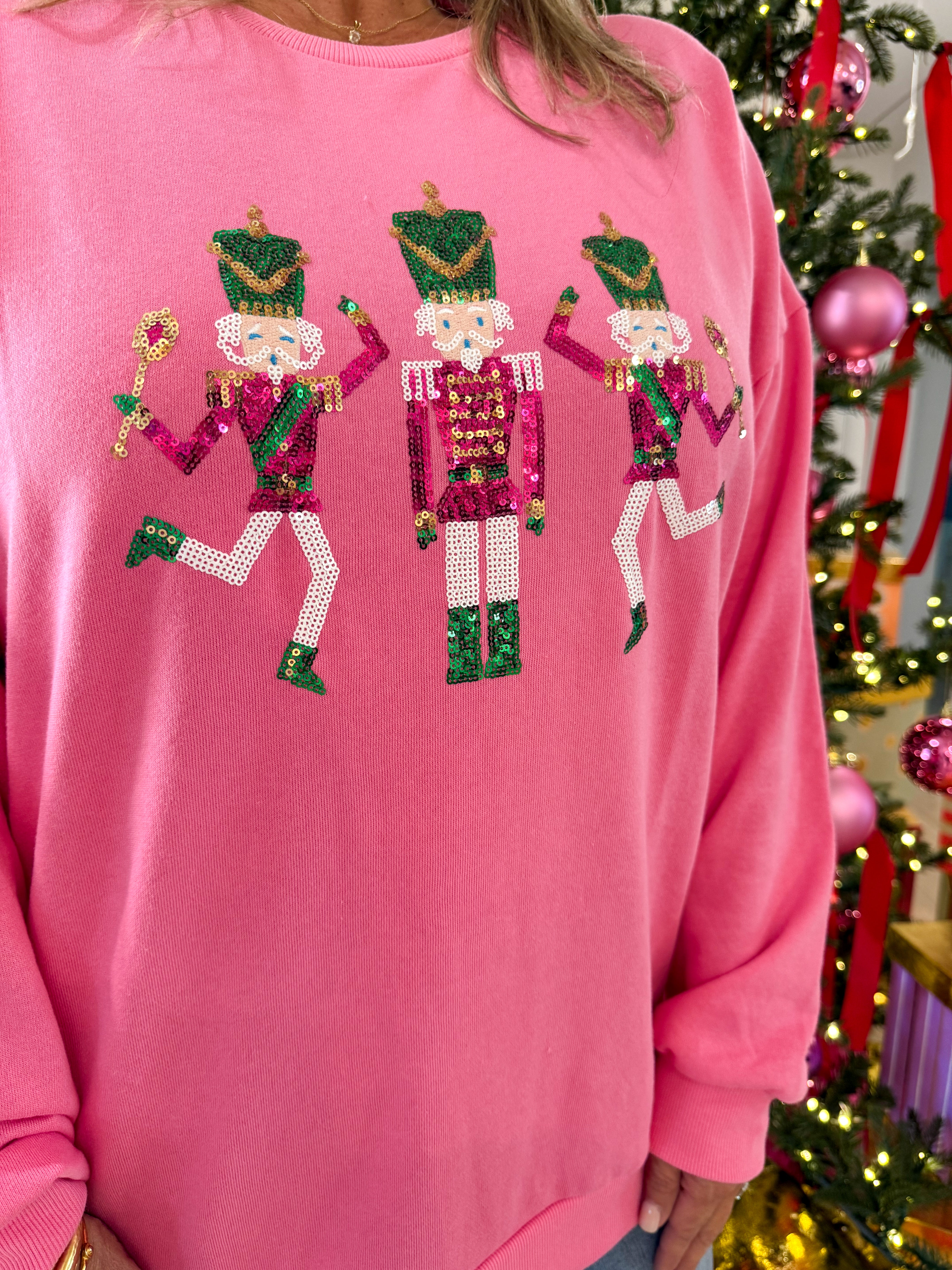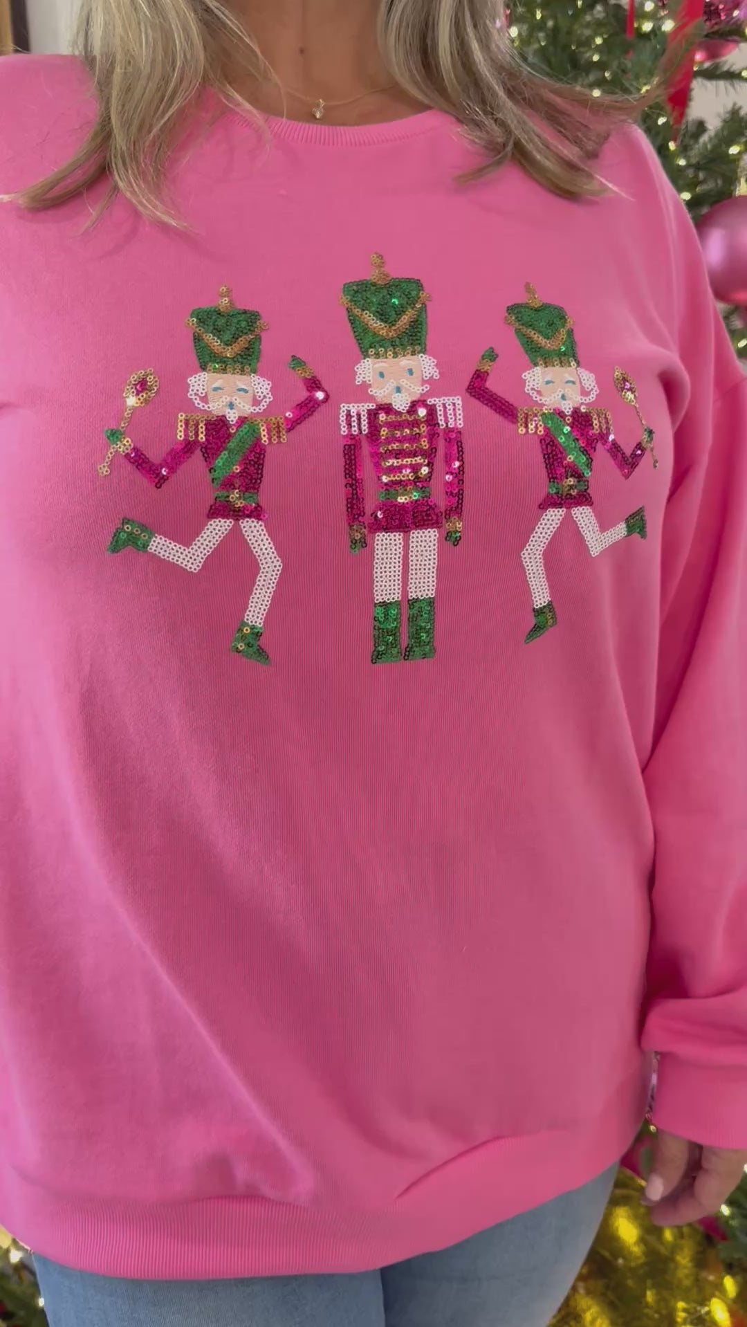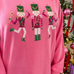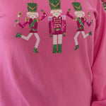 Add a festive sparkle to your cozy days with the Nutcracker Cutie Sweatshirt, featuring three dazzling sequin nutcrackers on a cheerful pink backdrop.