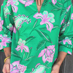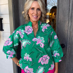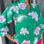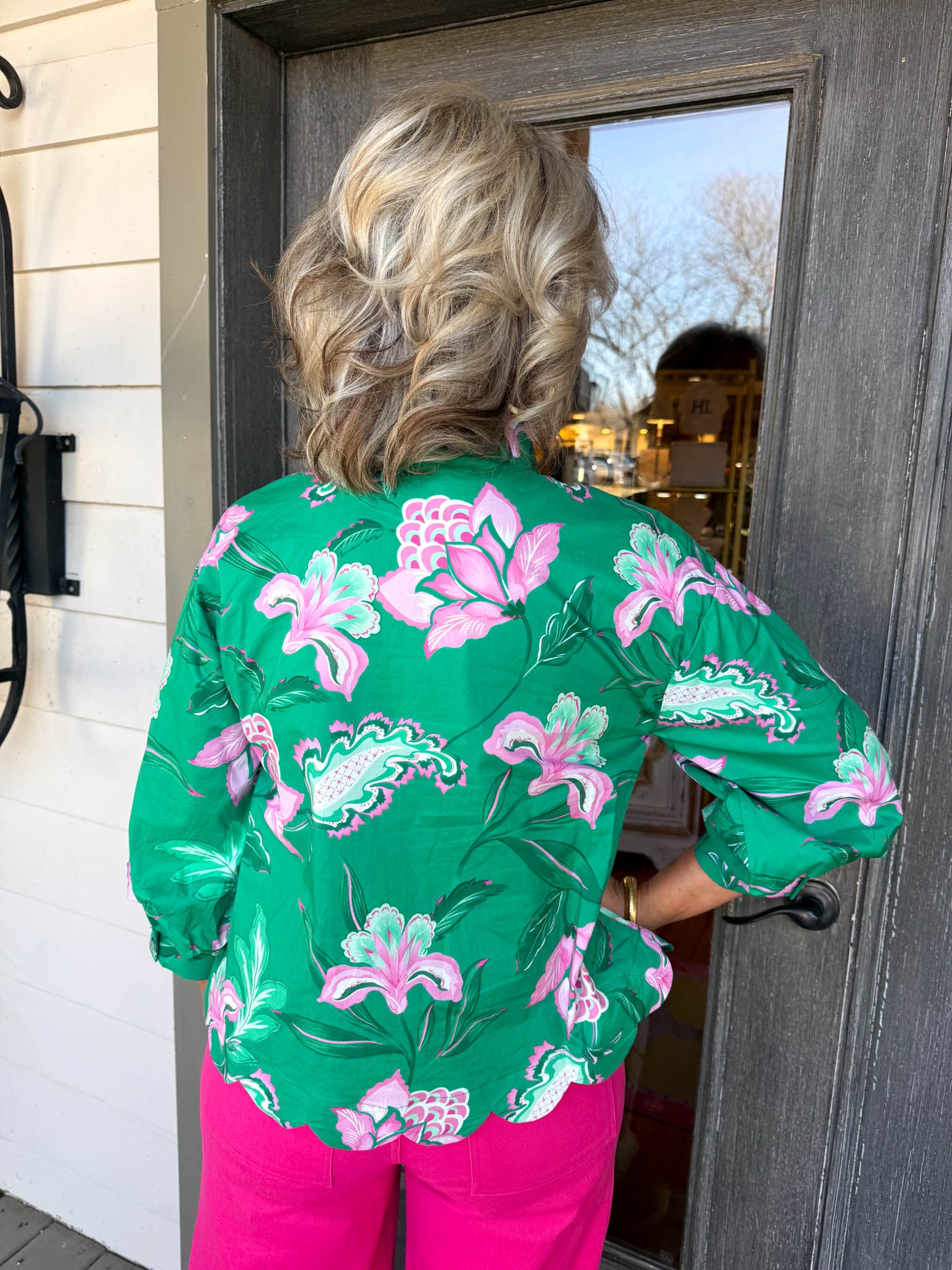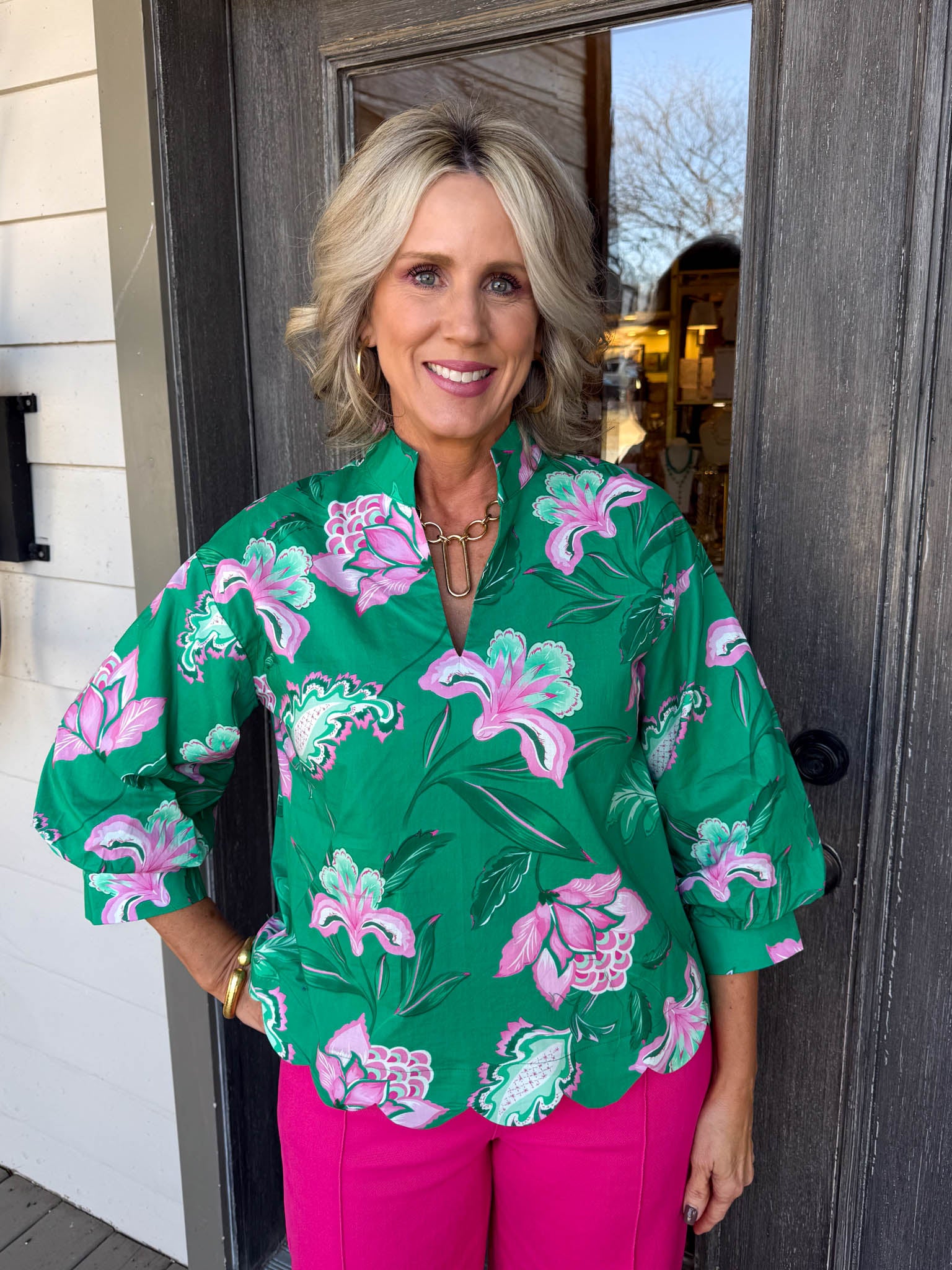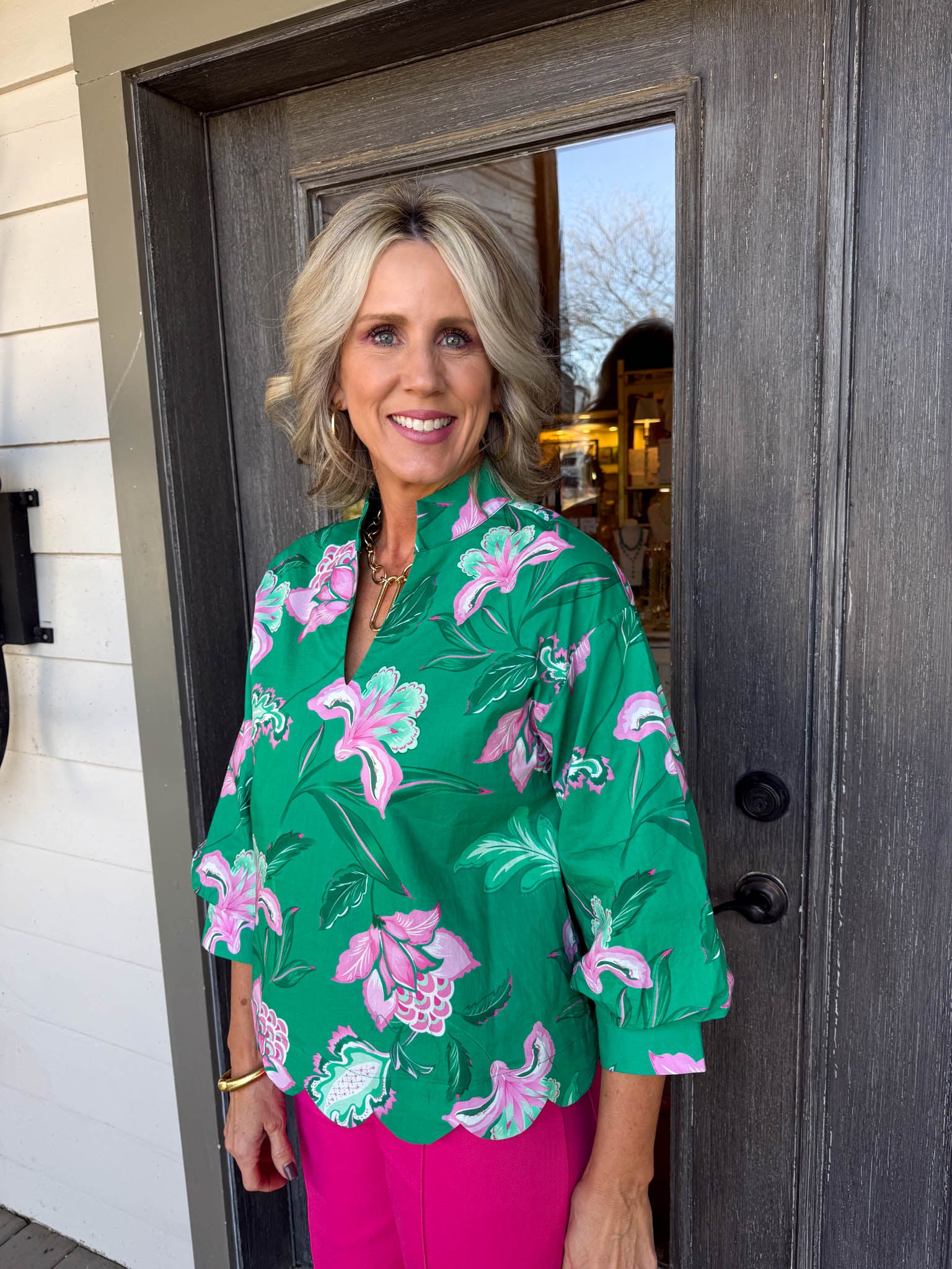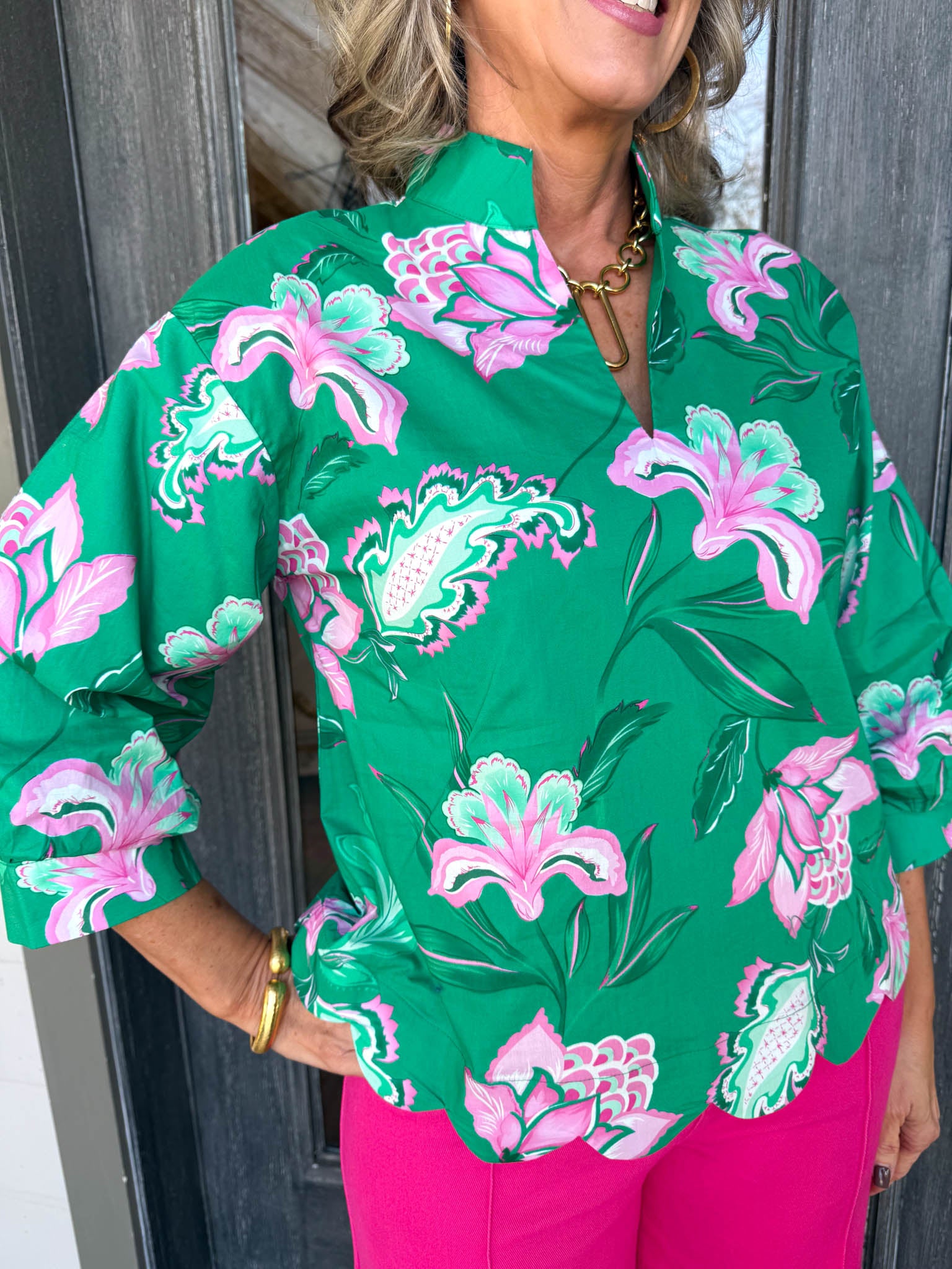 • Green base with delicate pink floral print and a scalloped hem that adds whimsy without trying too hard