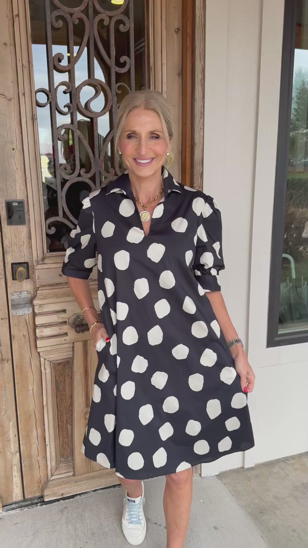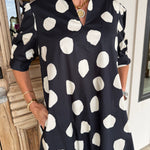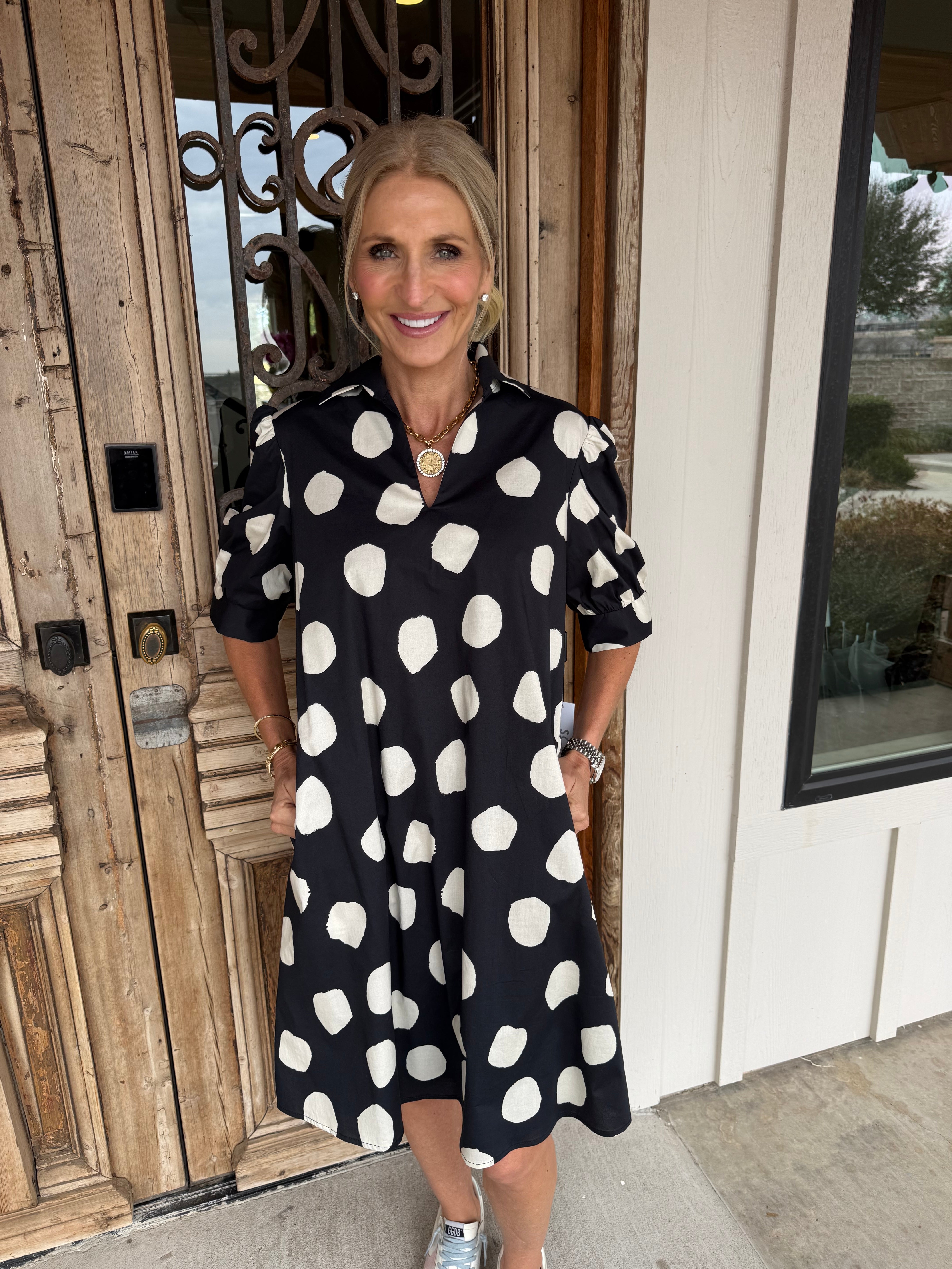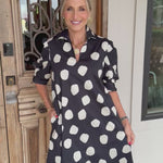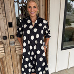 Slip into effortless elegance with this charming black mini dress that pairs timeless polka dots with a flattering A-line silhouette.