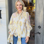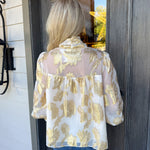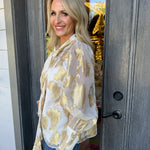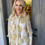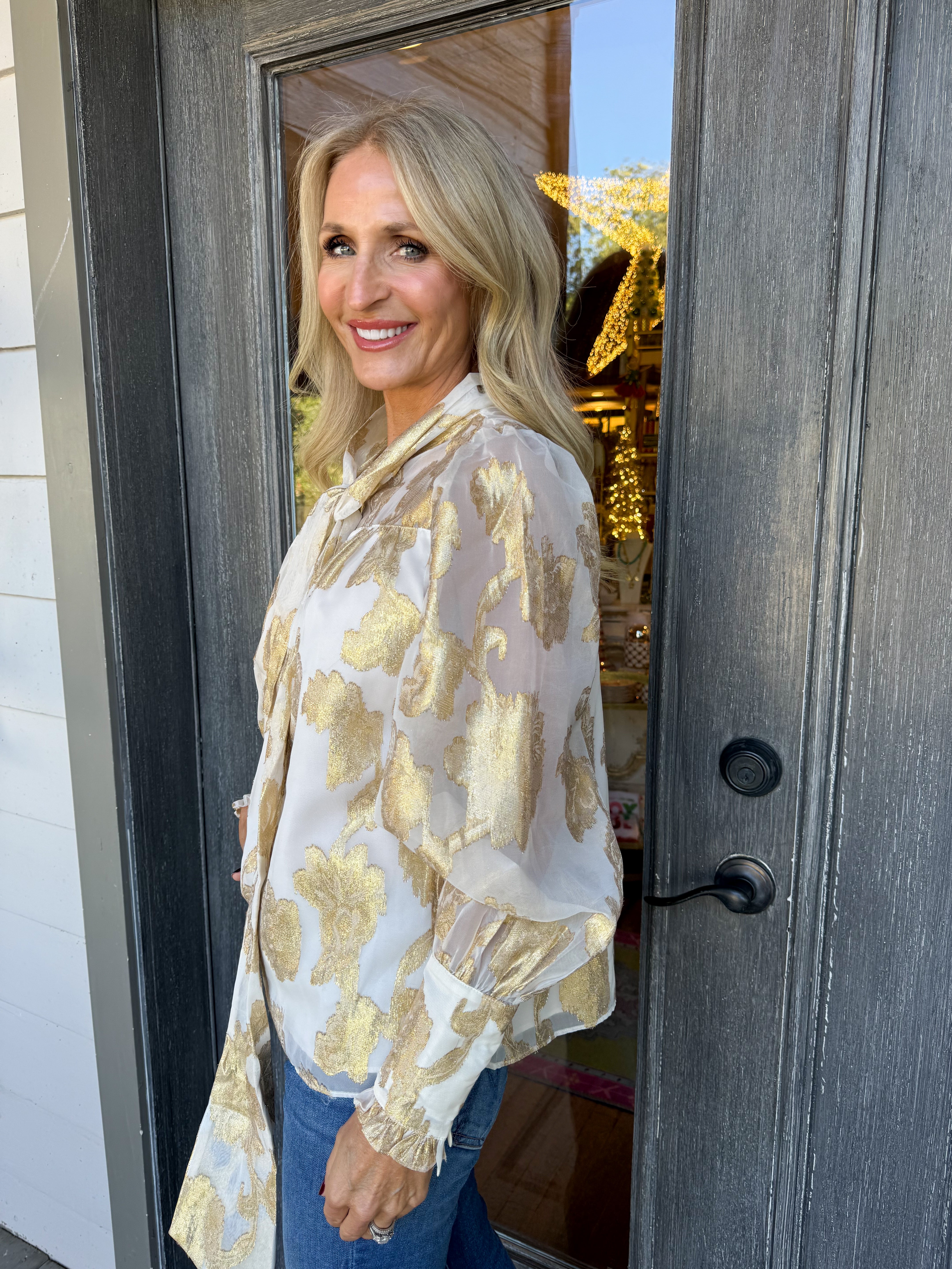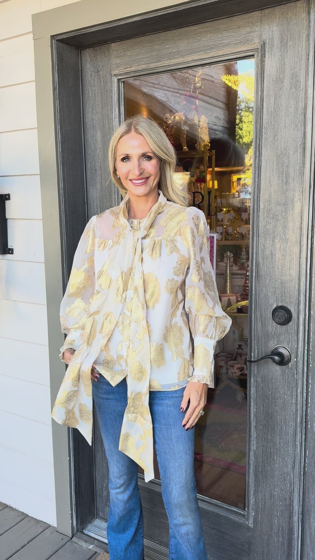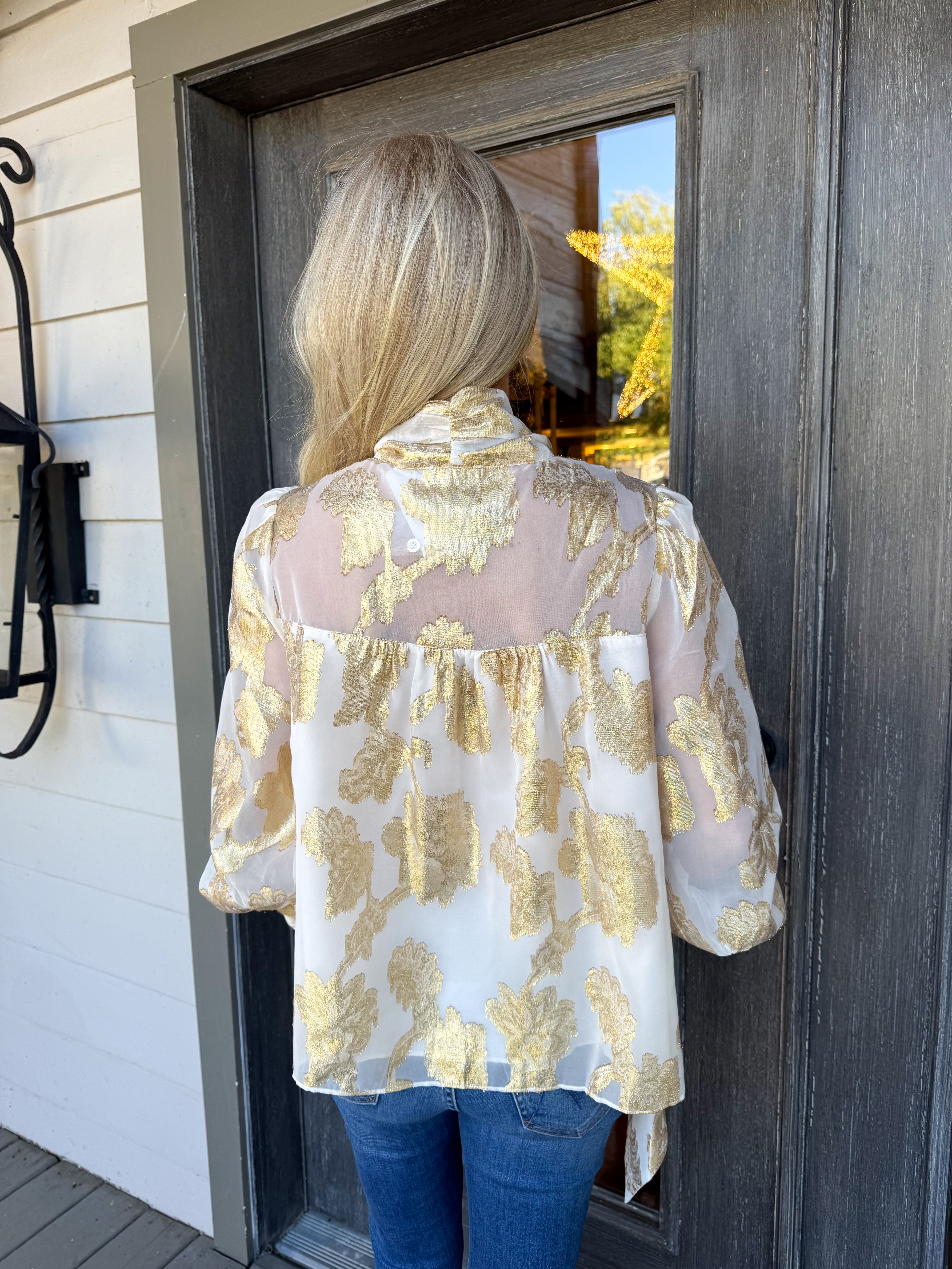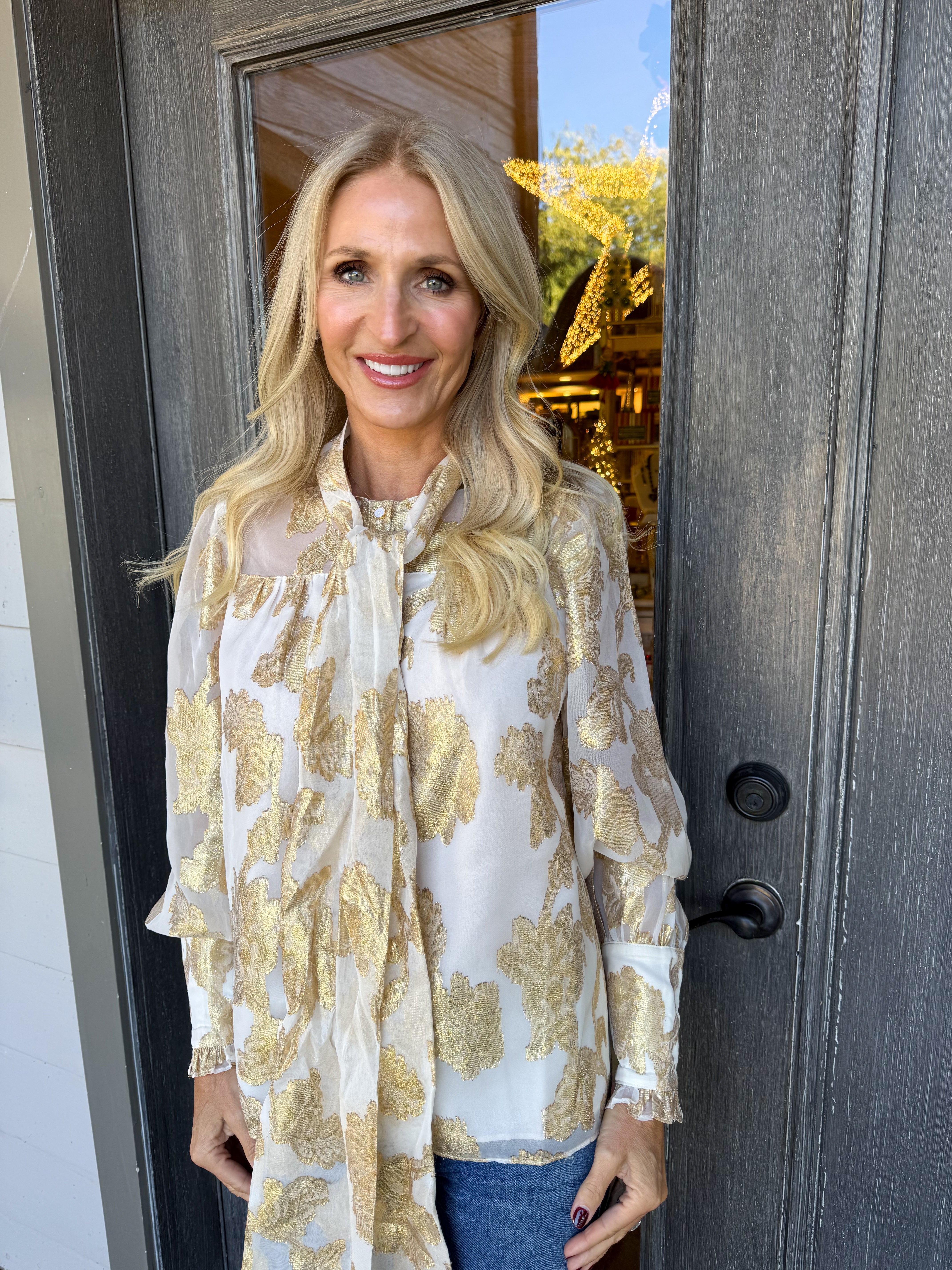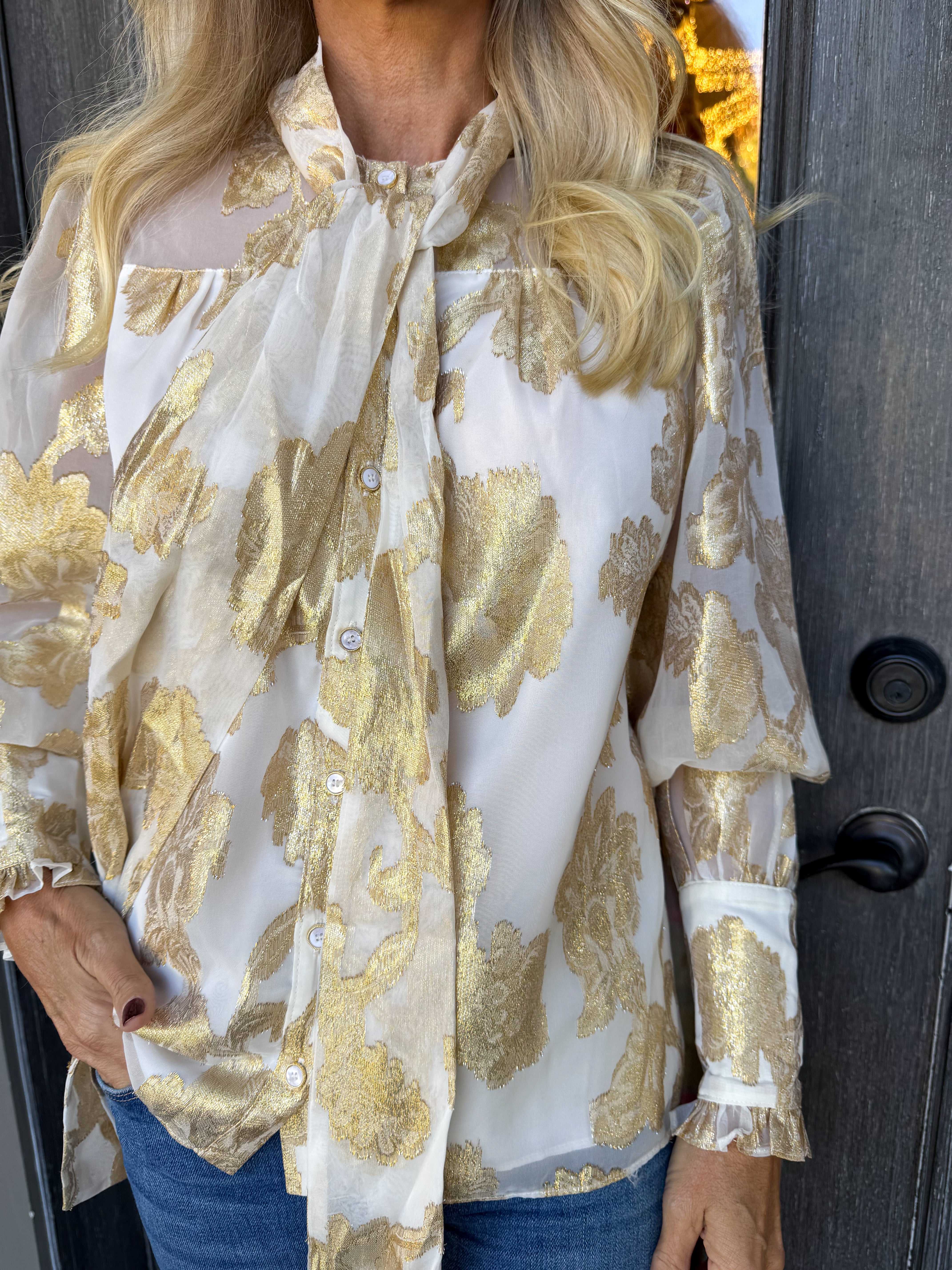 Elevate your wardrobe with the Randi Jacquard Blouse, where shimmering metallic gold meets delicate cream chiffon for a playful yet elegant statement.