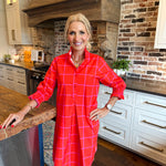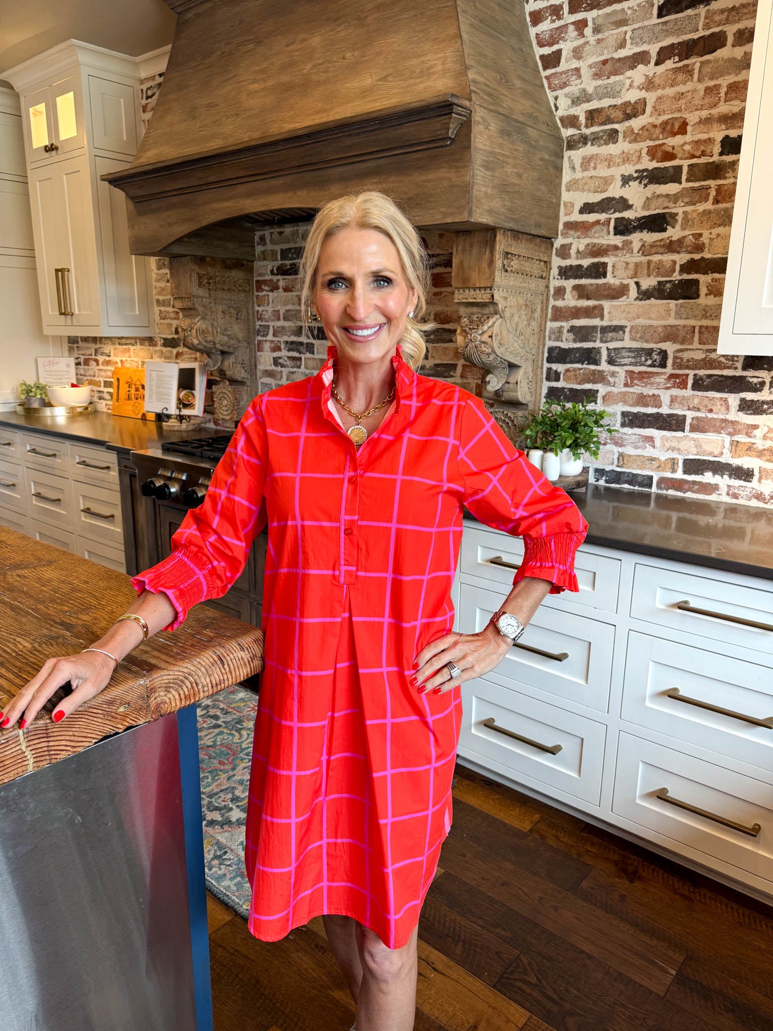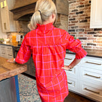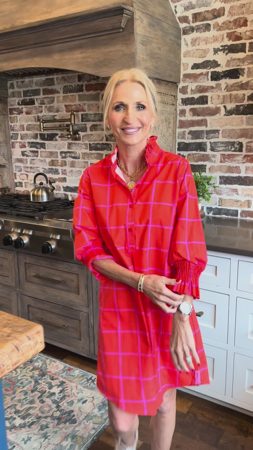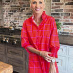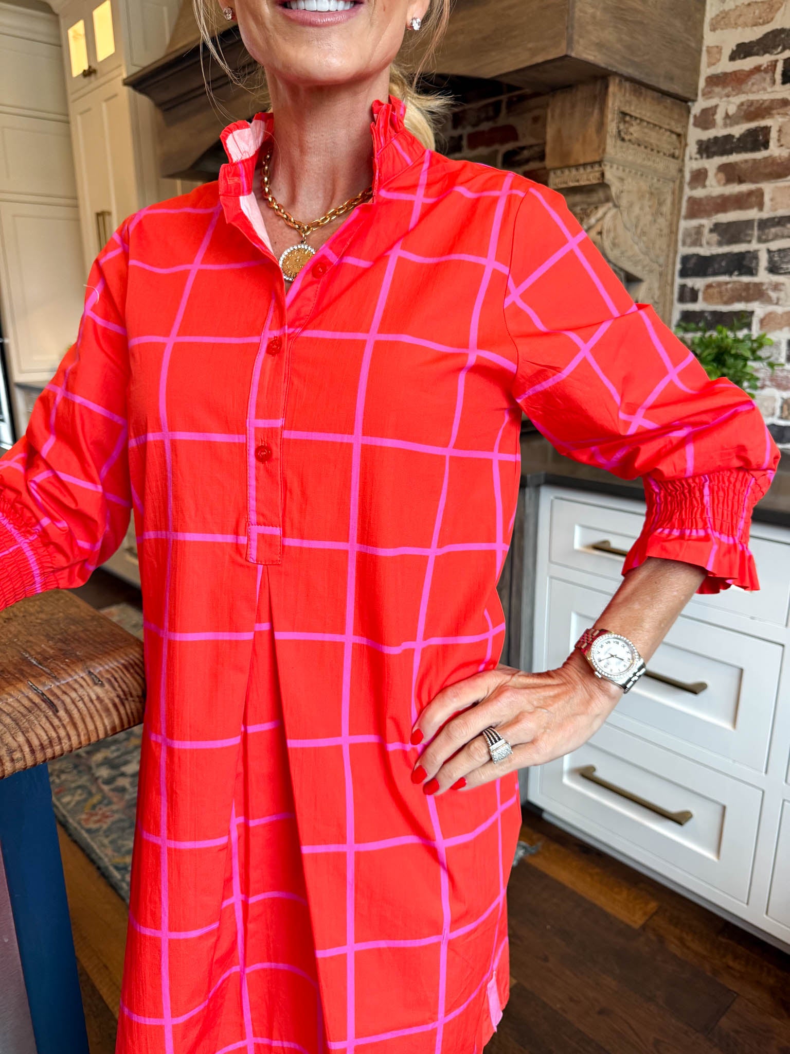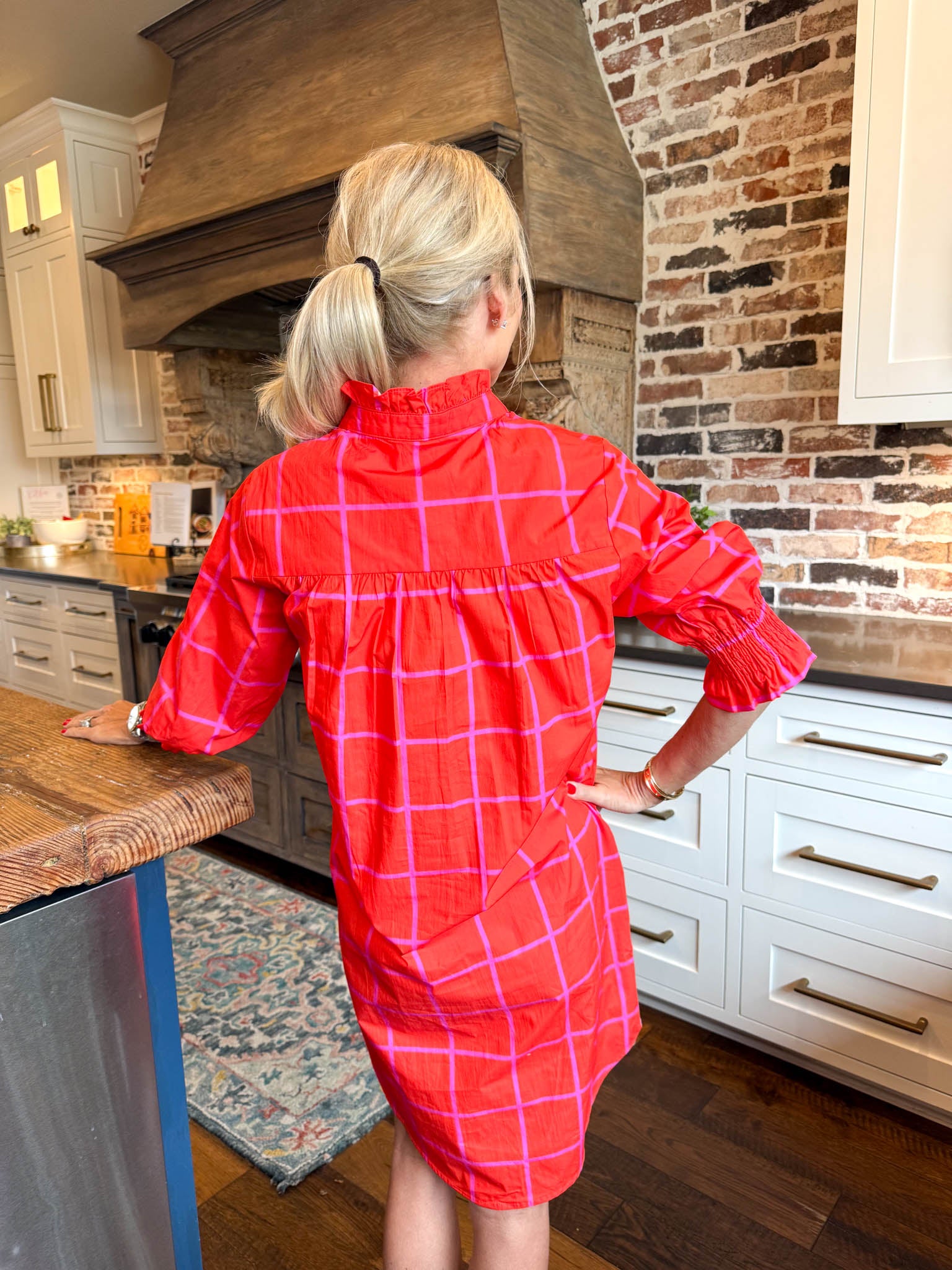 This striking red mini dress features a charming pink cross pattern and 3/4 sleeves with a button-up collar—a versatile piece that transitions effortlessly from casual to dressed-up occasions.