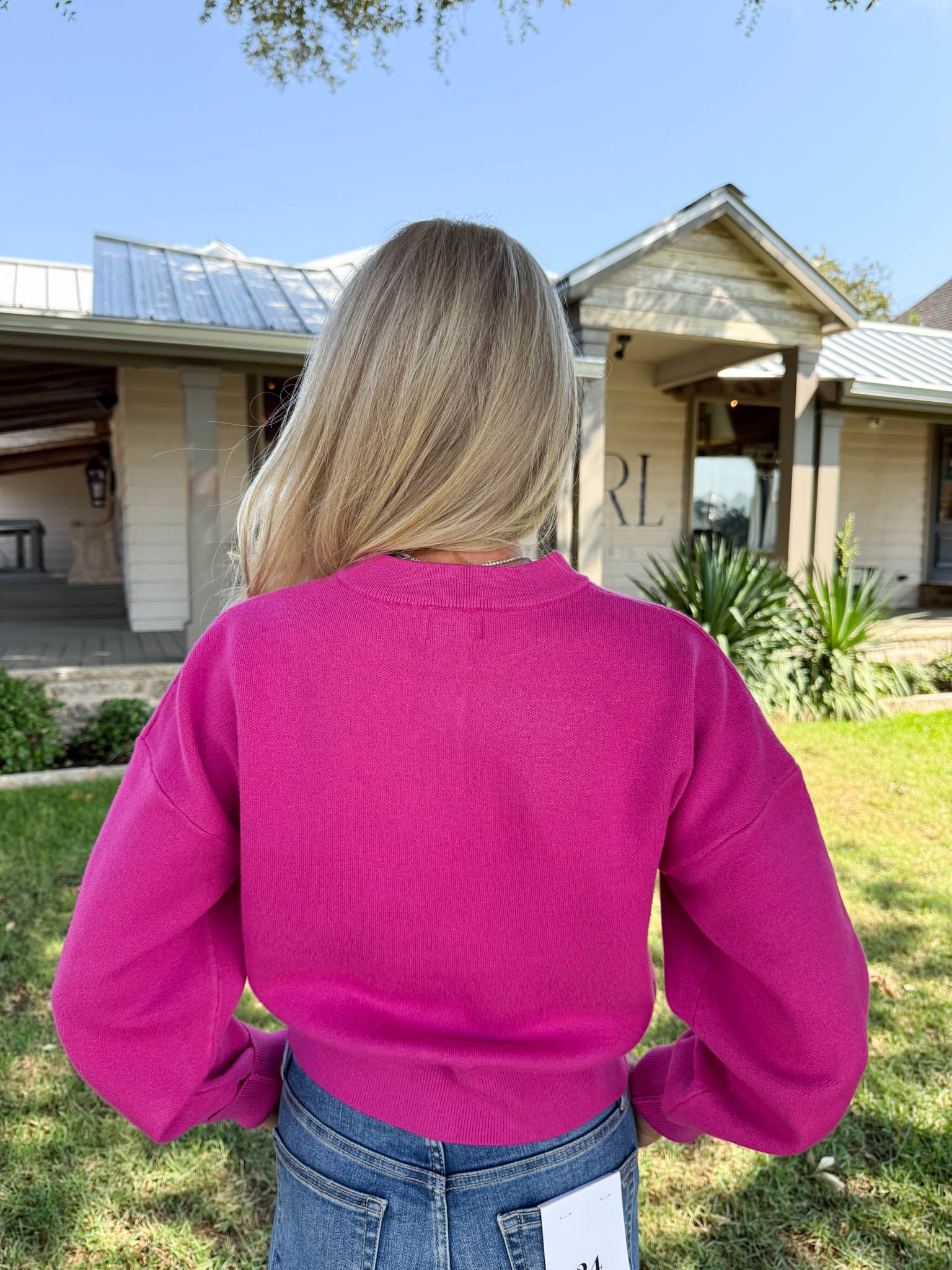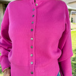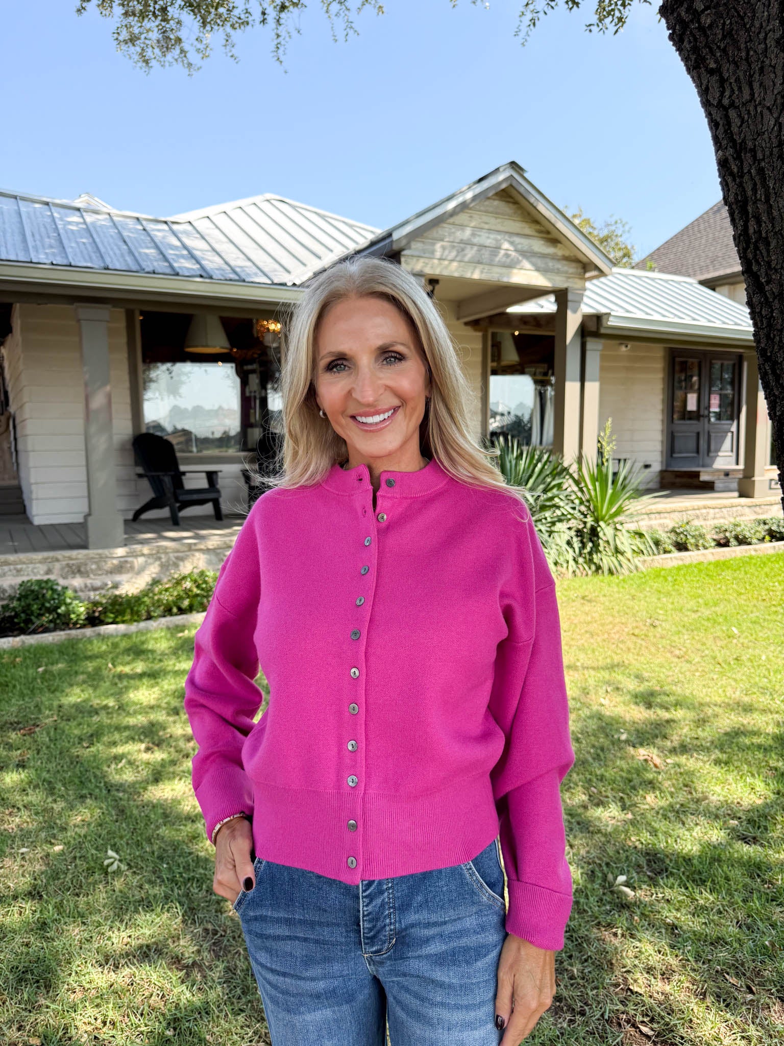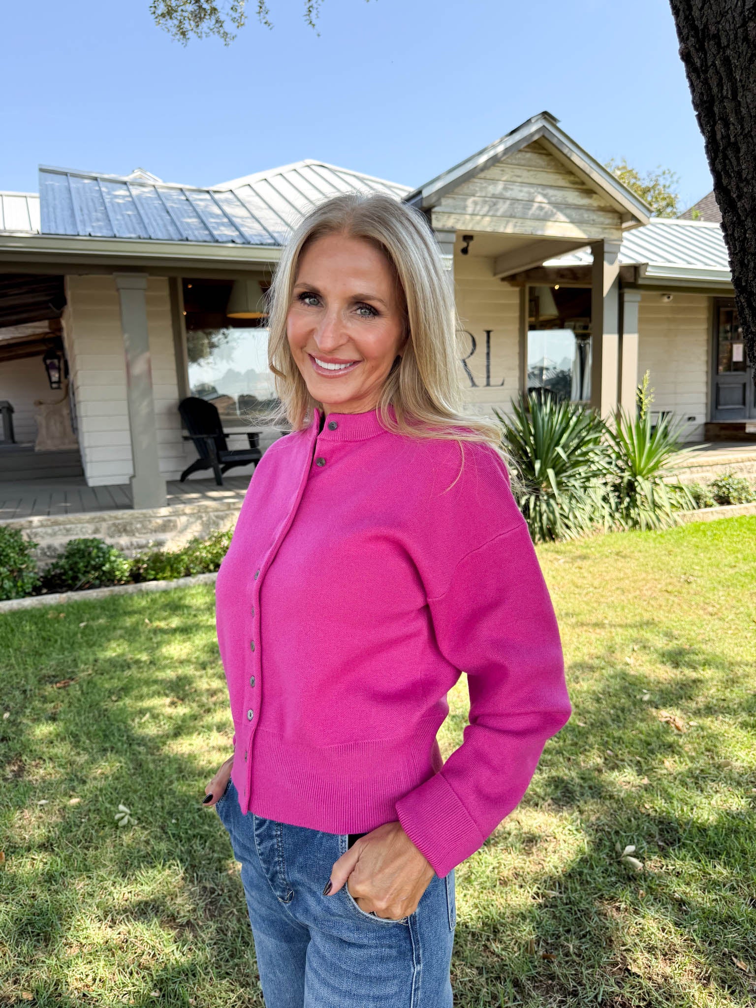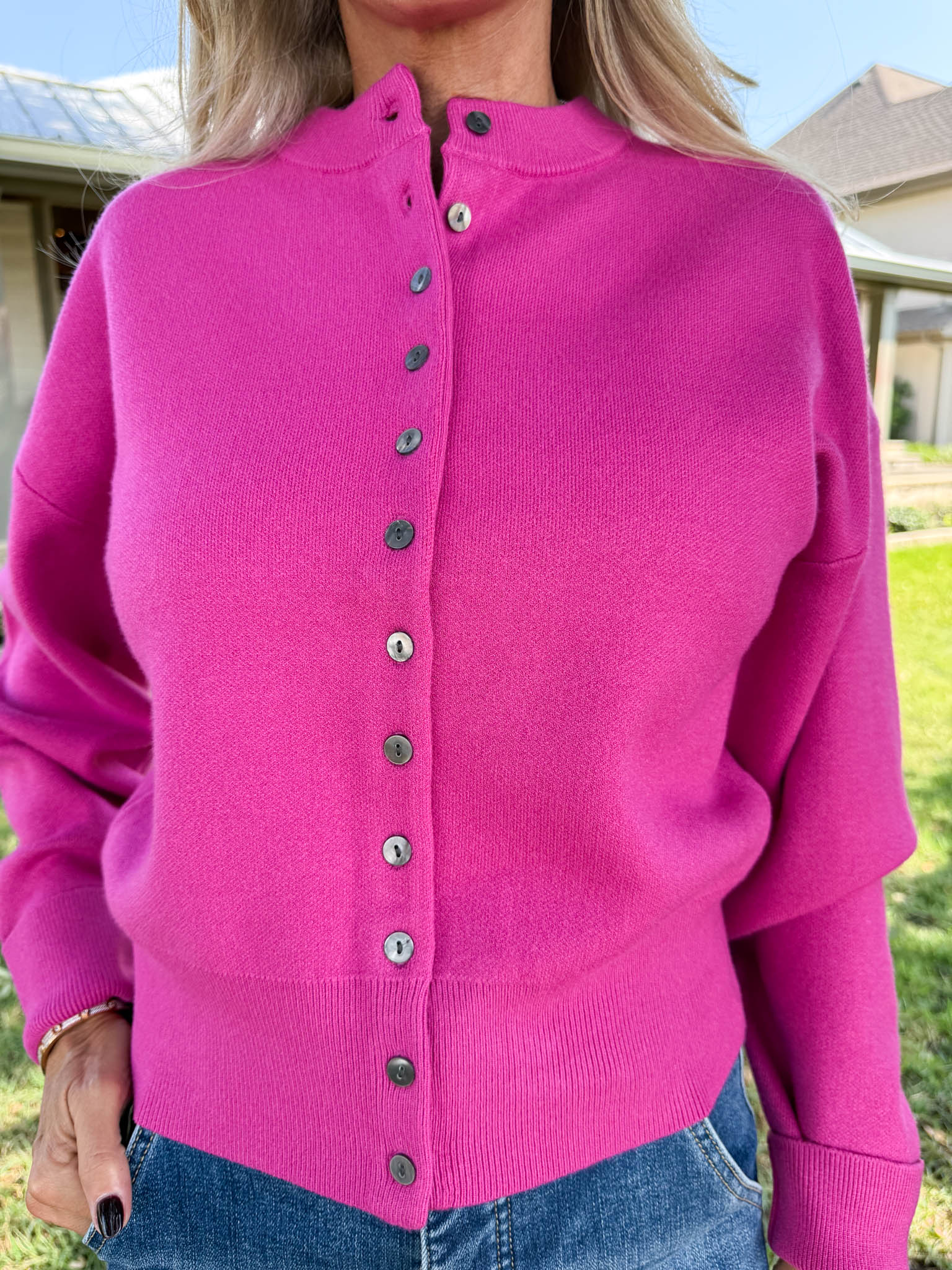 Add a pop of playful charm to your wardrobe with this pink round neckline cardigan, designed to brighten any outfit with its button closure that’s as fun to wear as it is easy to style.