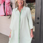 • The soft sage palette pairs with crisp white stripes to create a look that works from casual coffee runs to weekend getaways