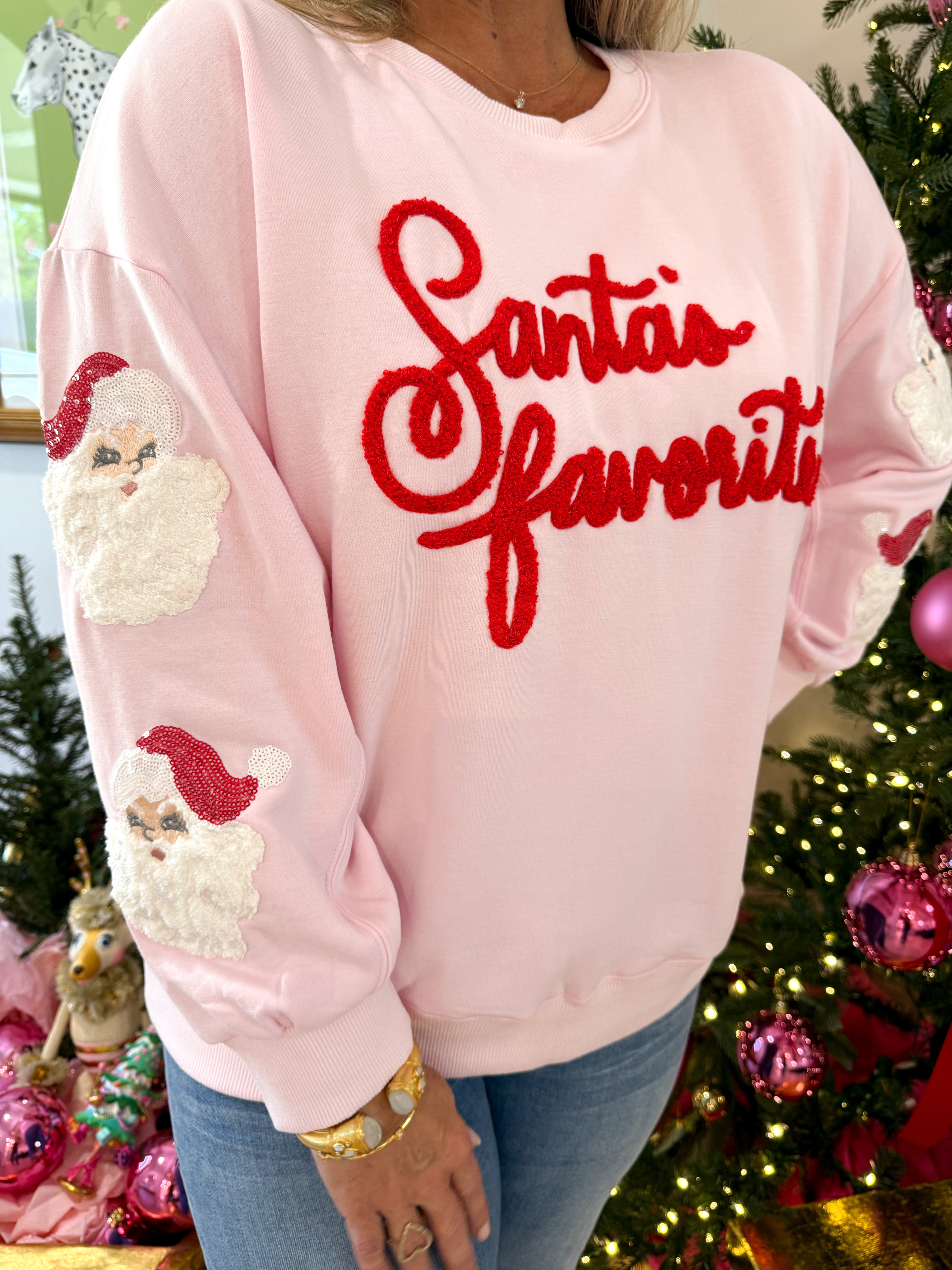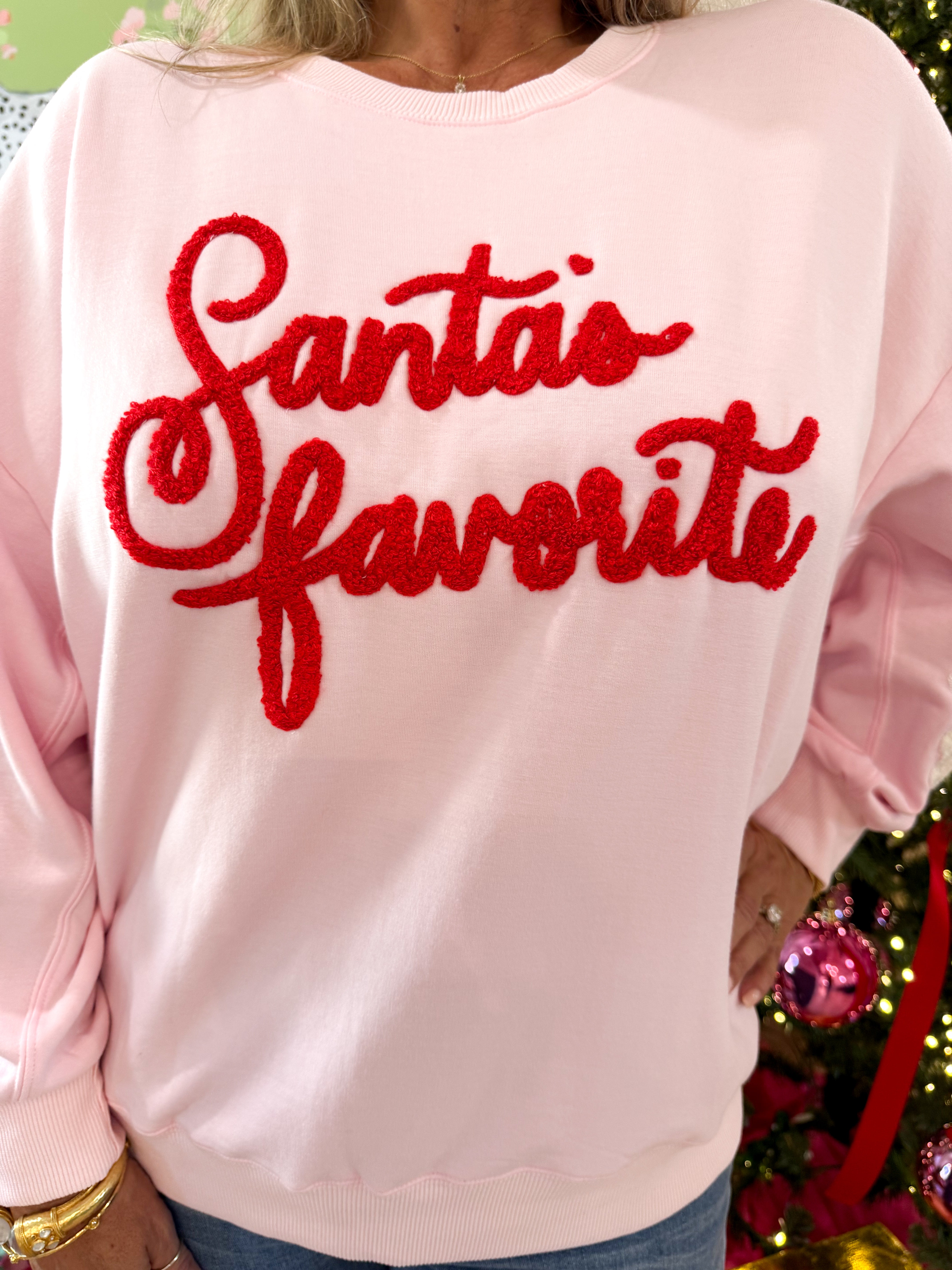 Cozy up in style with the Santa's Favorite Sarah Sweatshirt—where playful pink meets festive red for holiday cheer and comfy billowy sleeves.