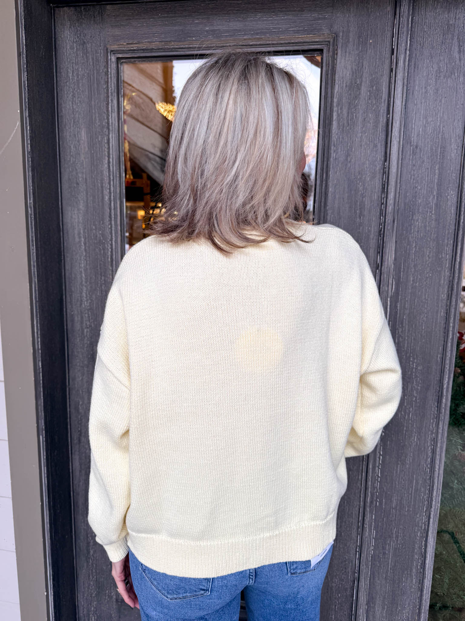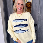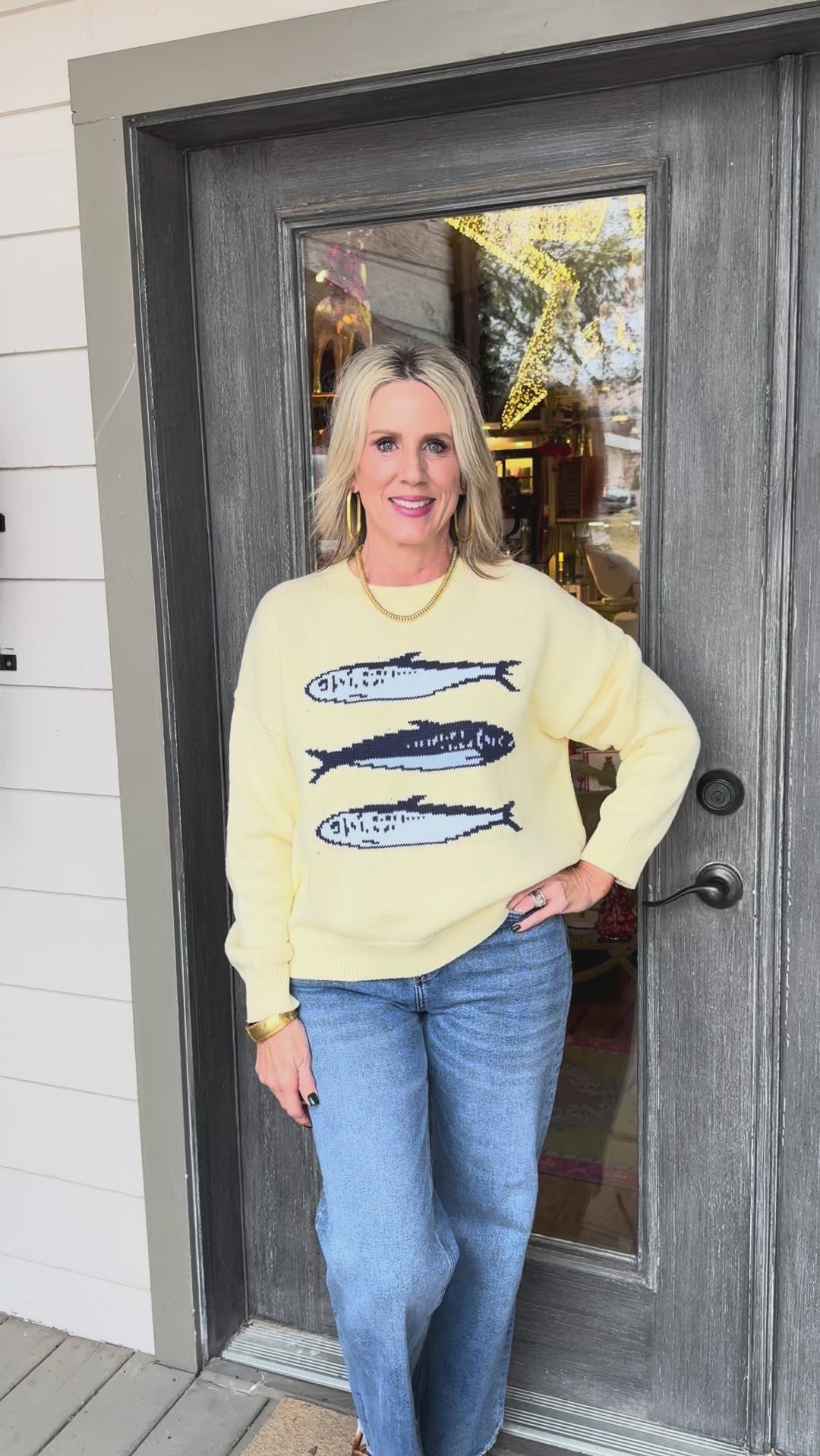 Wrap yourself in whimsy with this cheerful light yellow sweater top featuring a charming sardine print that brings coastal charm and personality to your everyday wardrobe.