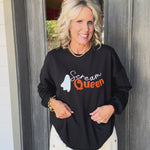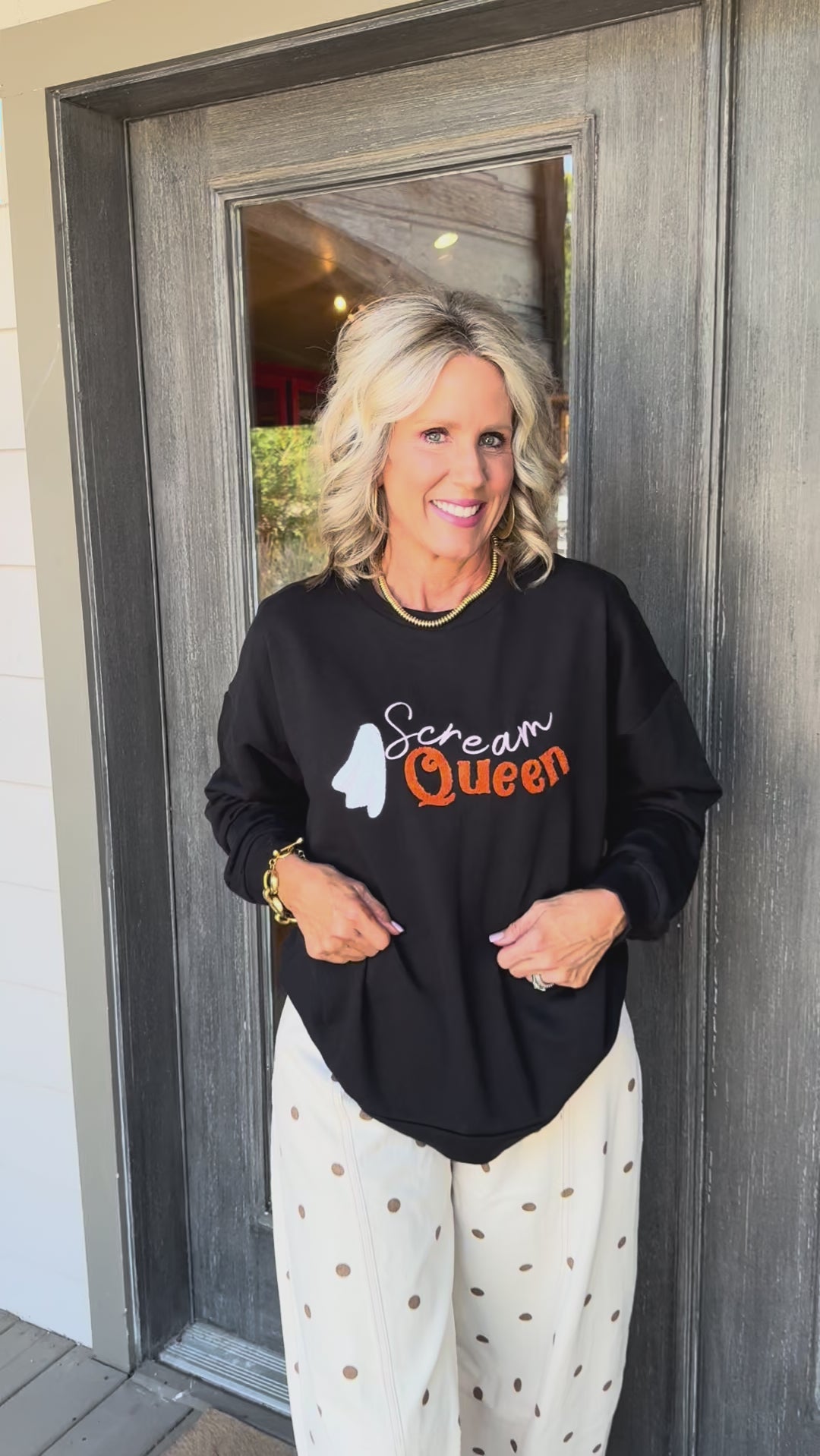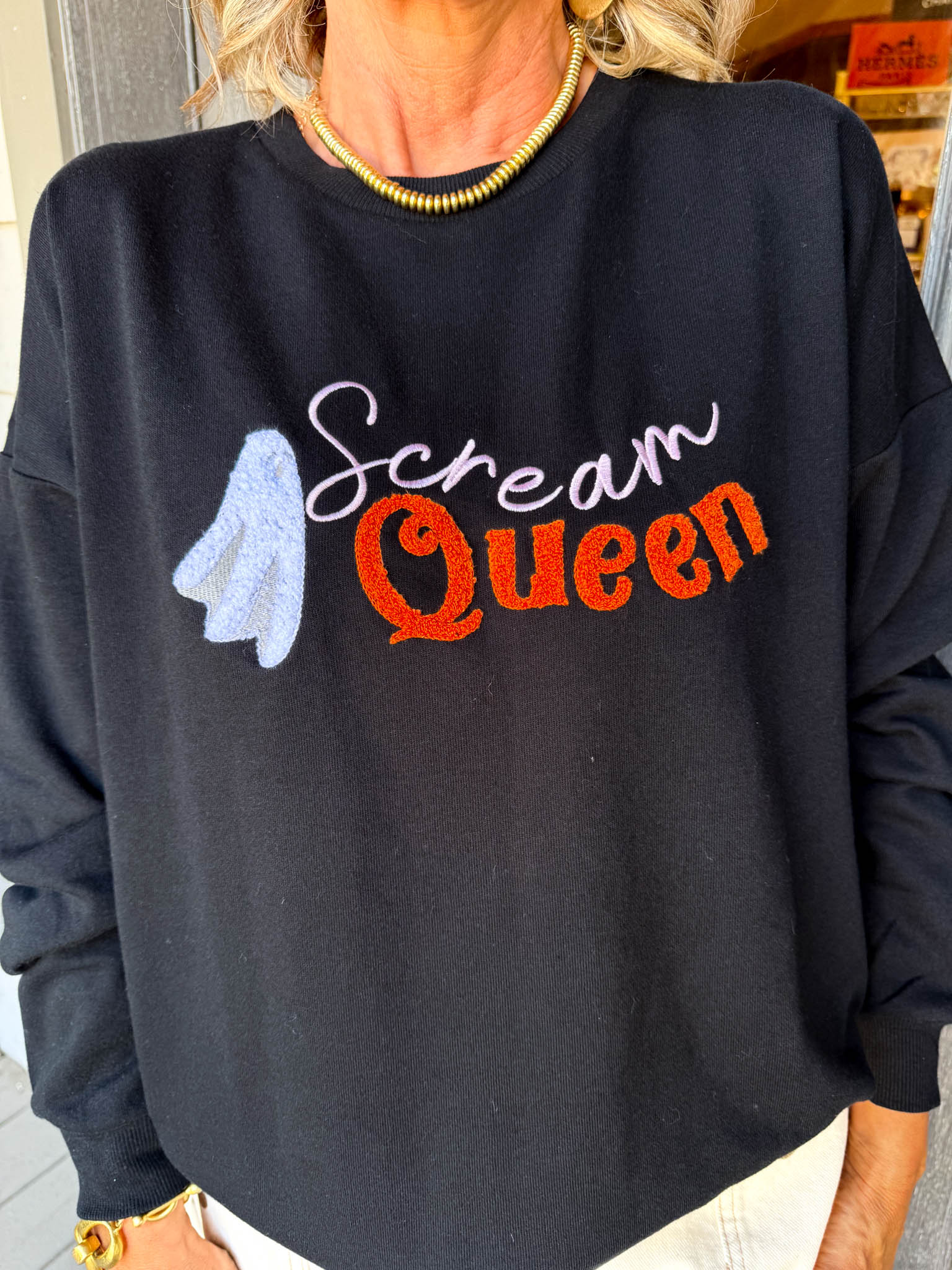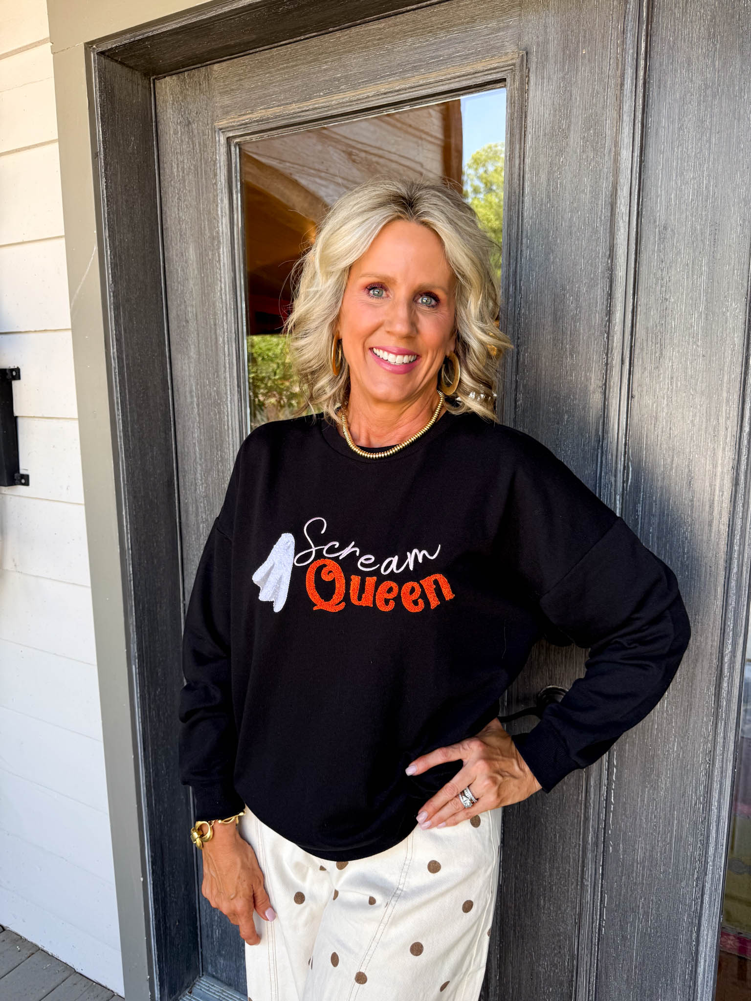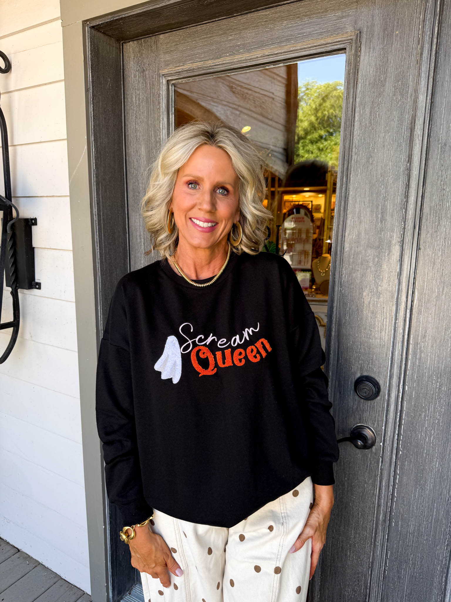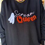 Show off your spooky style with the Scream Queen Sweatshirt, featuring vibrant chenille embroidery that pops in pink and orange.