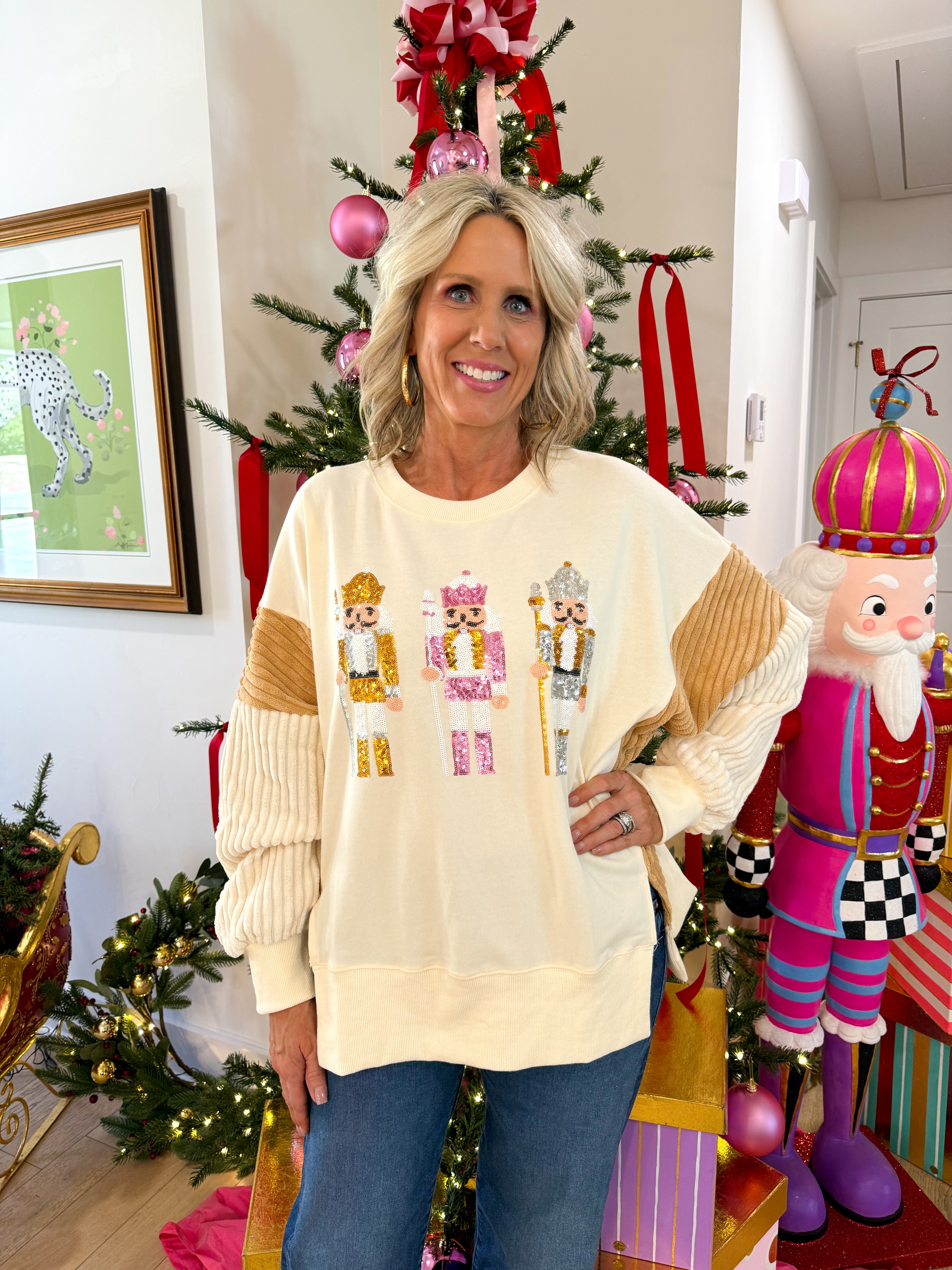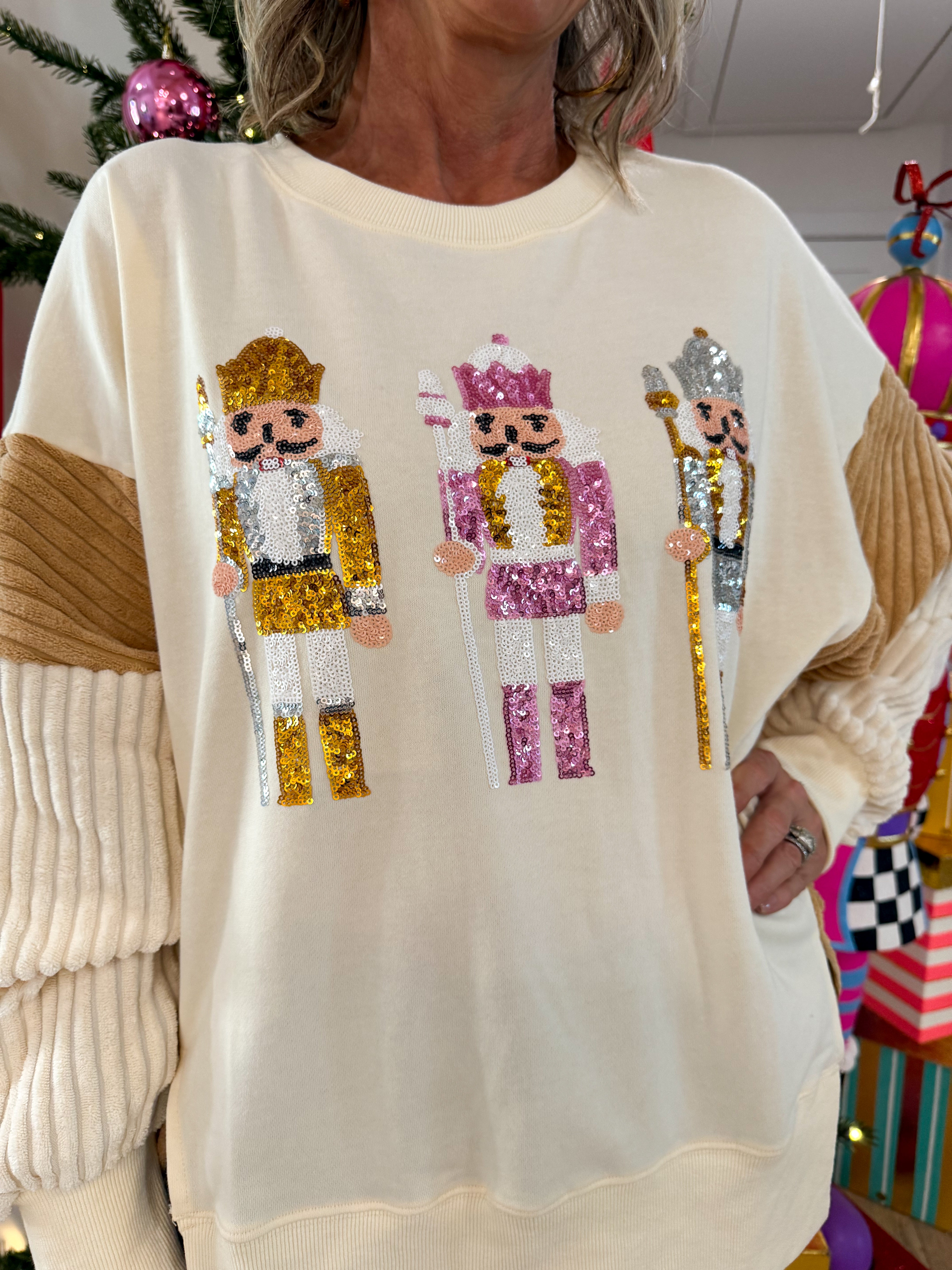 Stay cozy and festive in this playful white sweatshirt featuring soft faux corduroy tan sleeves and three sparkling sequin nutcrackers that bring holiday cheer to your outfit.