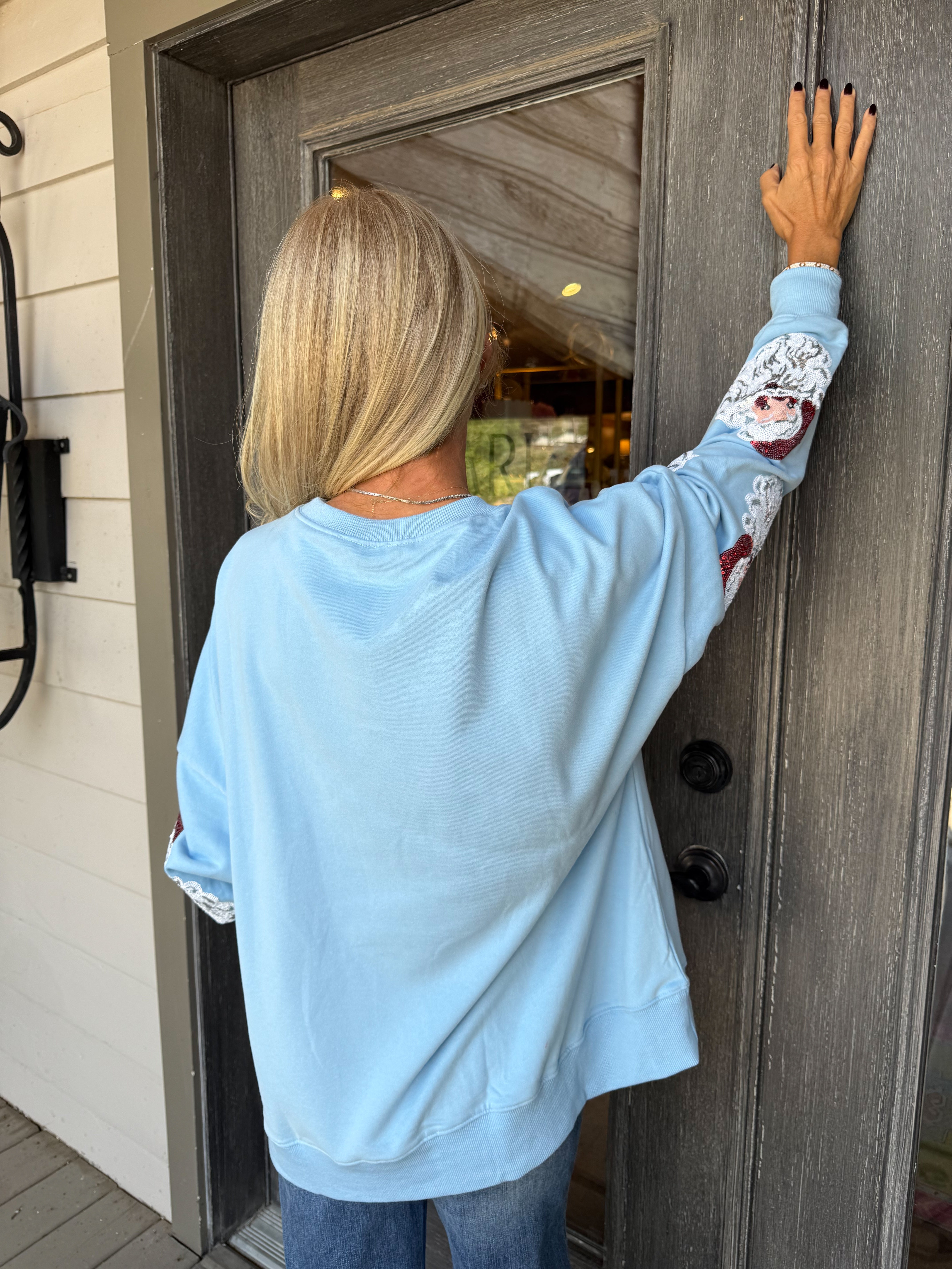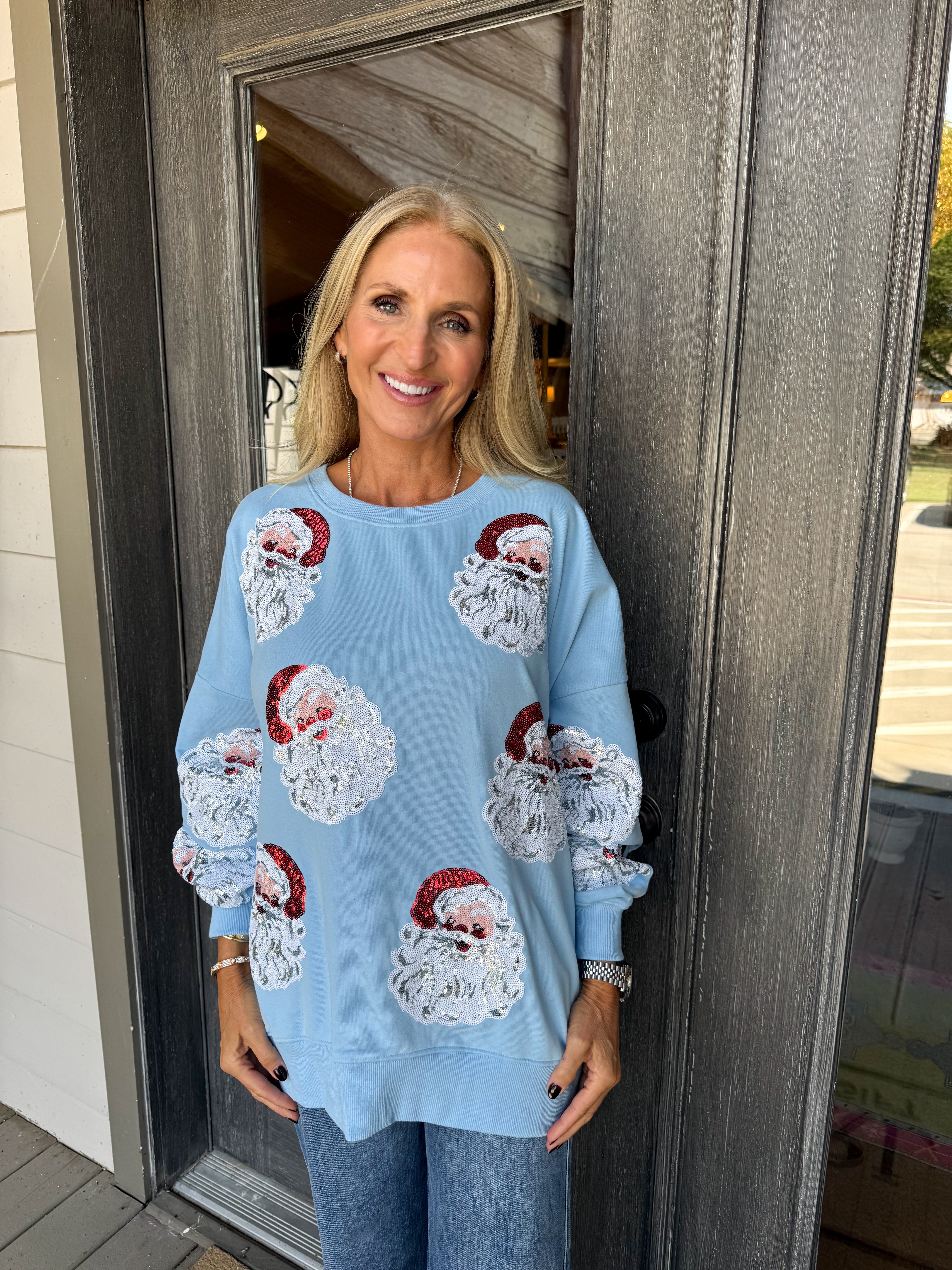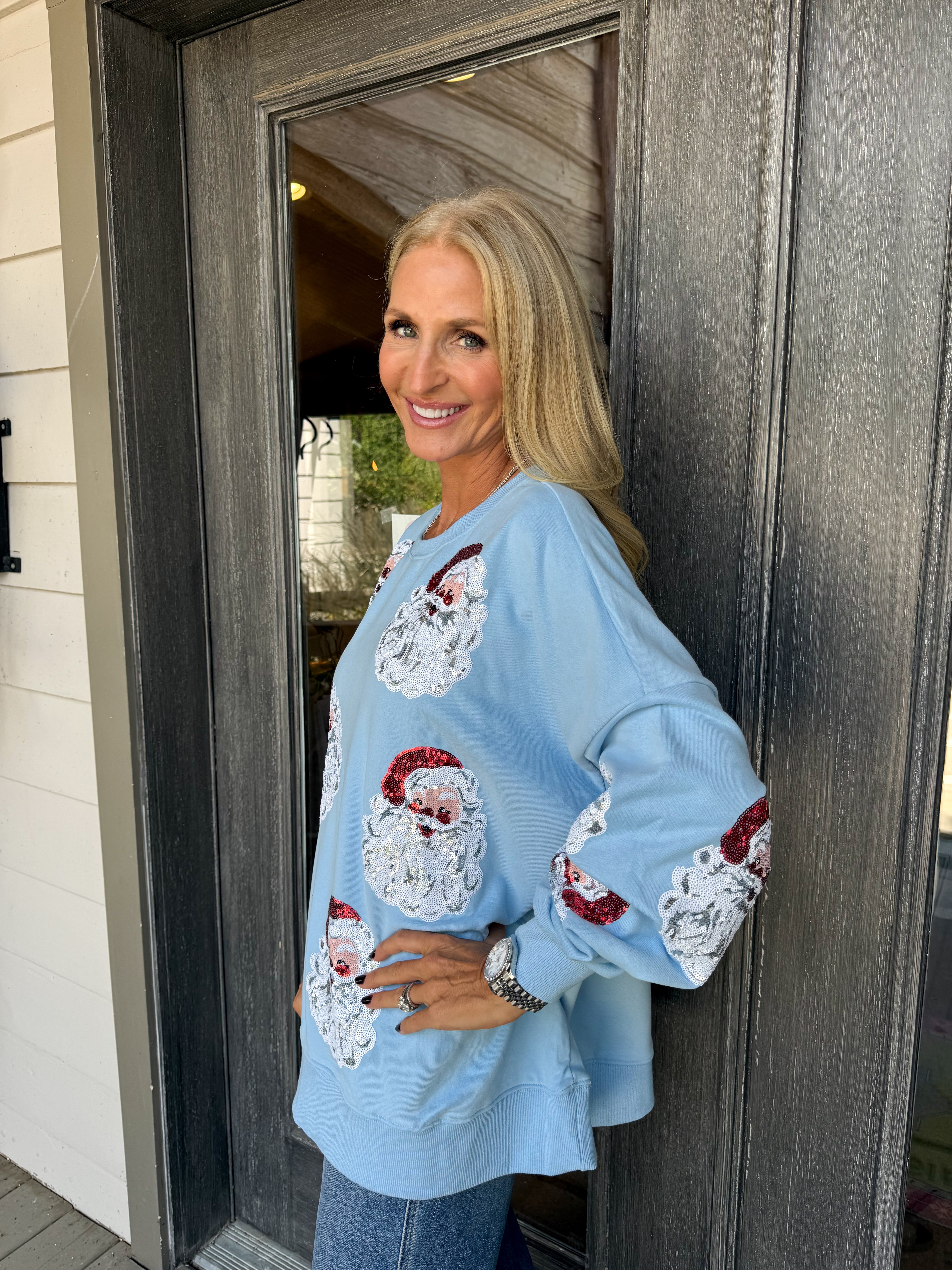 Get cozy and festive in this blue billowy sleeve sweatshirt adorned with sparkling sequin vintage Santa faces that bring holiday cheer to your wardrobe.
