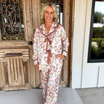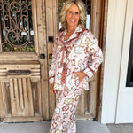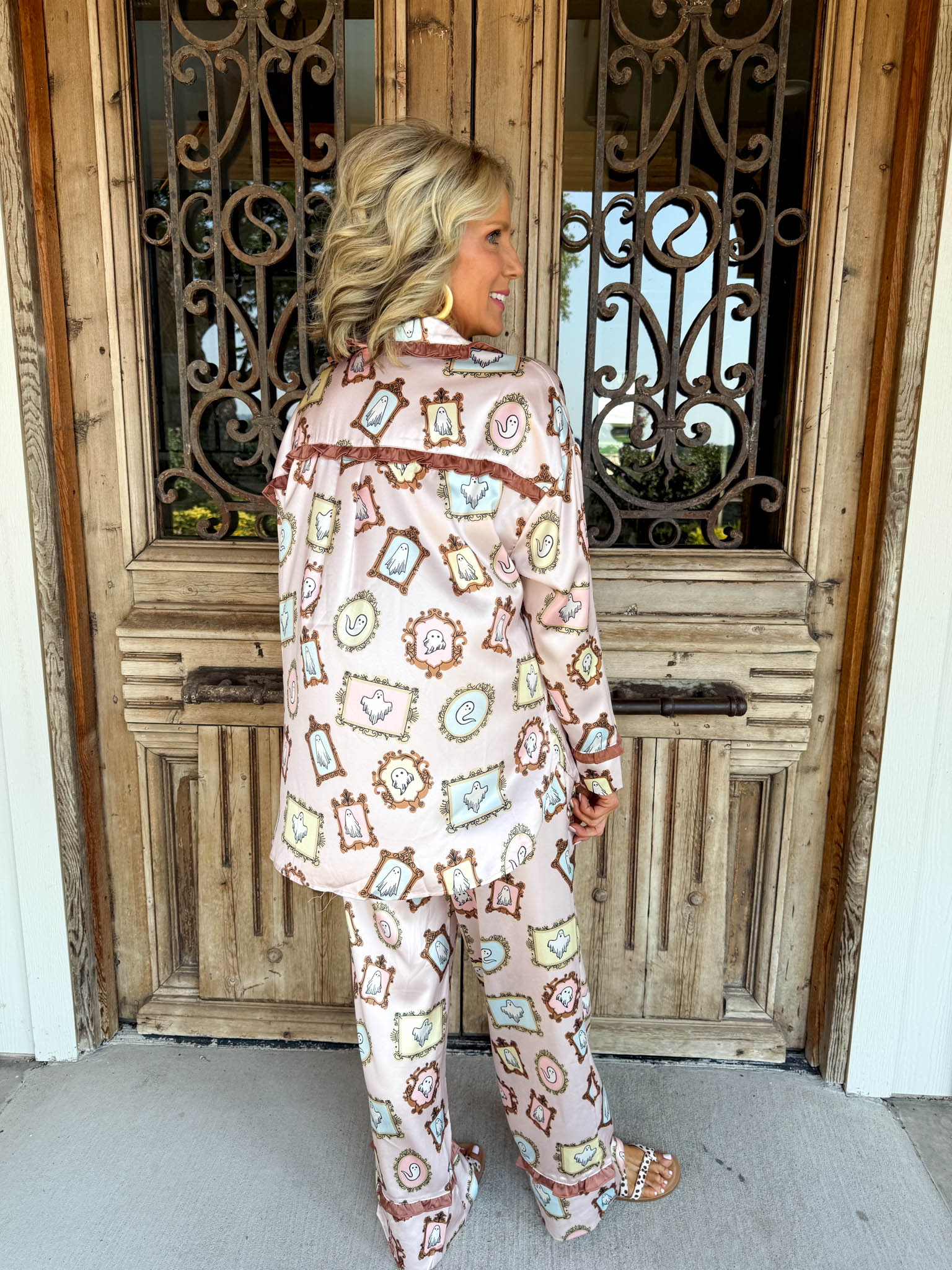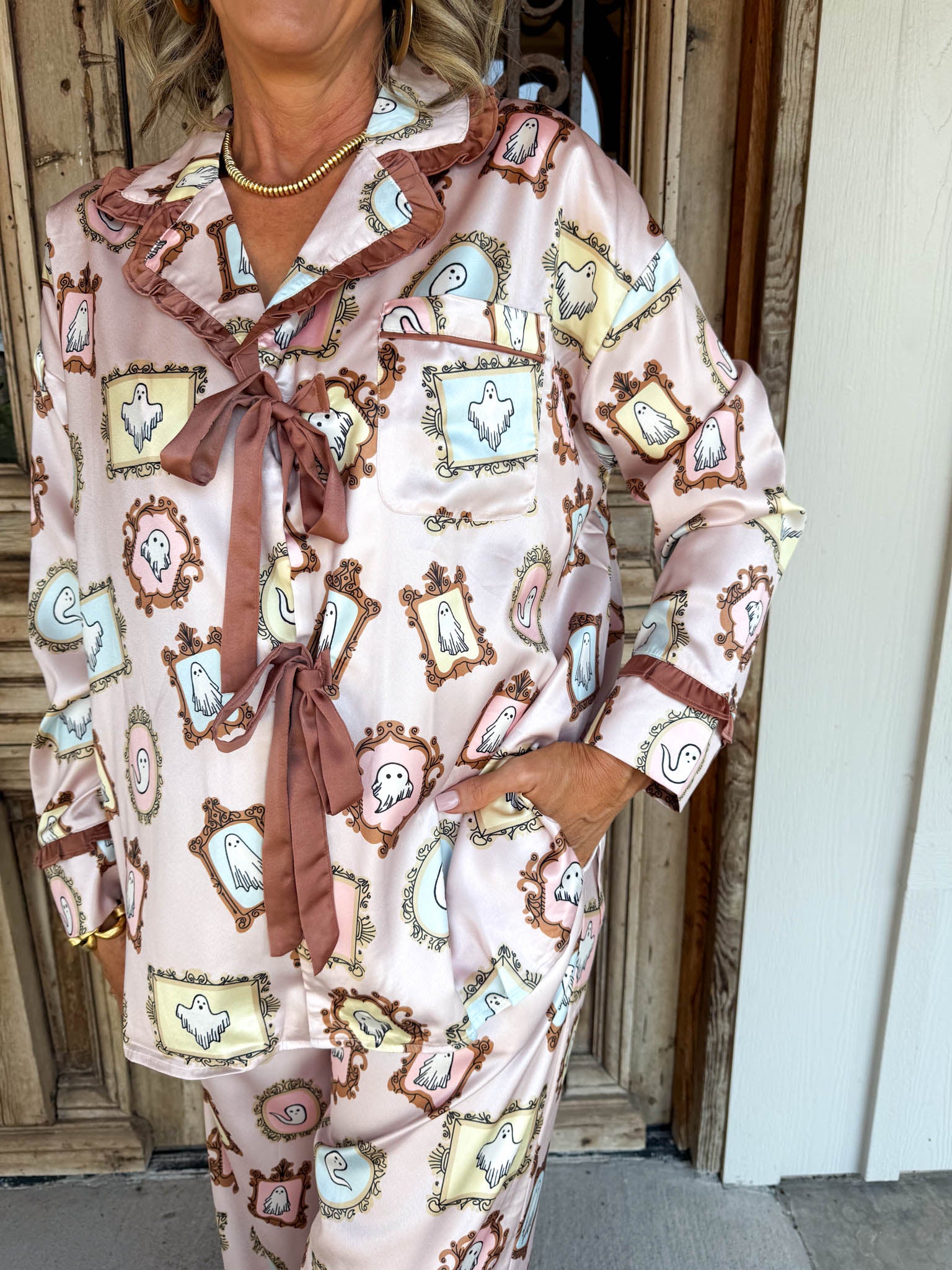 Slip into spooky-chic comfort with Seraphina's Shadow Pajama Set, where ghostly characters meet dreamy dusty pink satin for a night of whimsical relaxation.