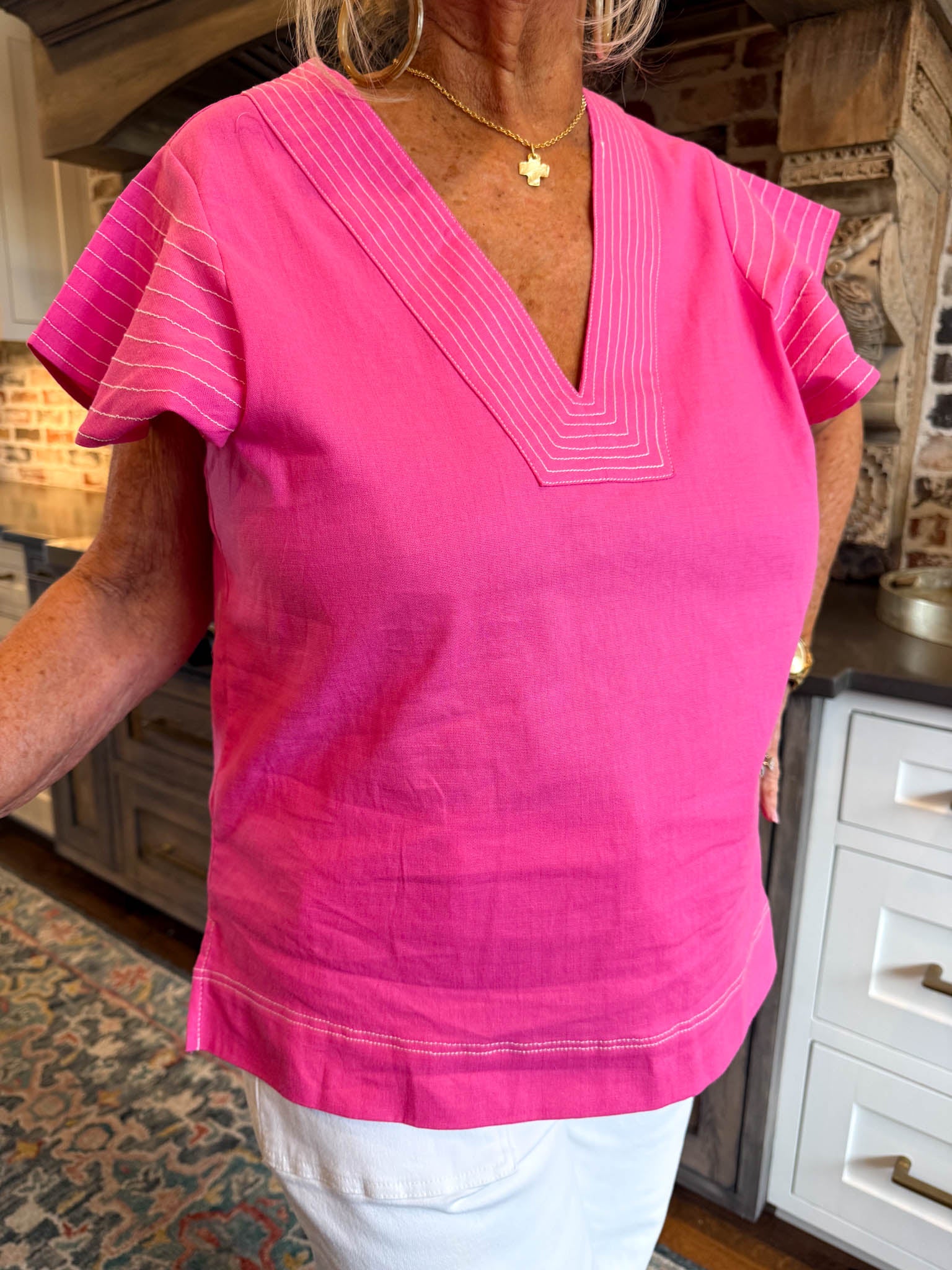 • Crisp white stitch detailing adds a preppy touch and visual interest to the soft pink fabric