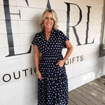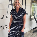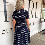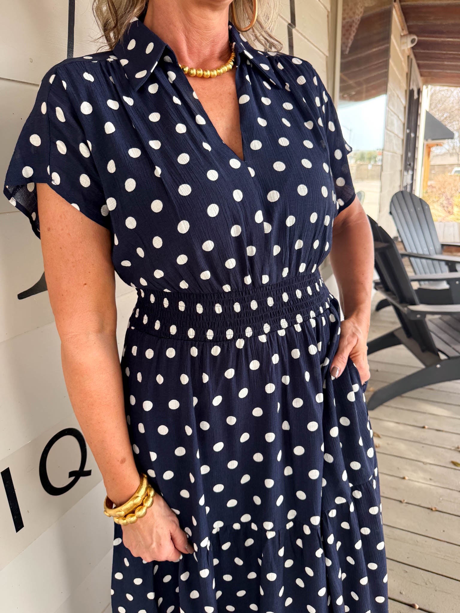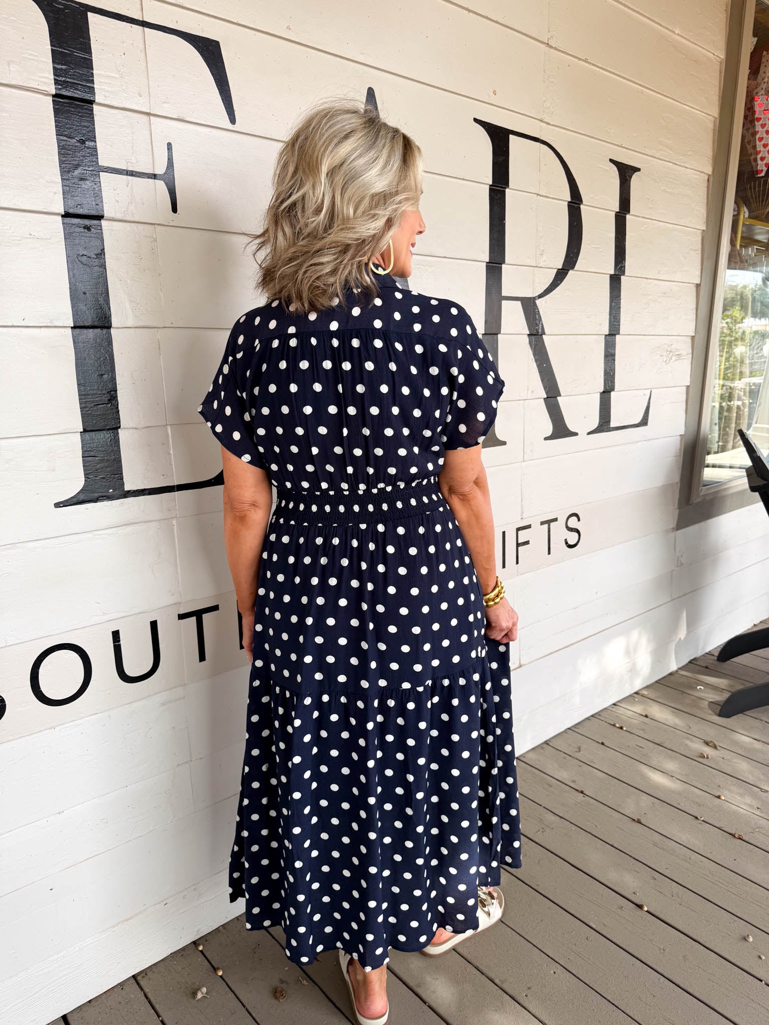 Twirl into effortless elegance with this charming navy and white polka dot midi dress that balances vintage-inspired details with modern comfort.