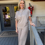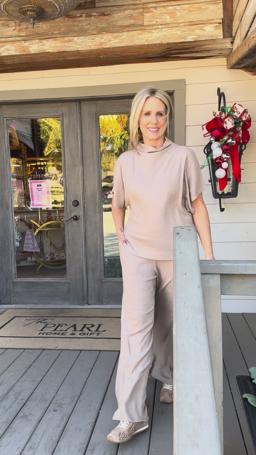 Get ready to feel amazing in this stone soft touch set that pairs a flattering side-ruched top with comfy elastic waist trousers for the ultimate comfort-meets-style combo.