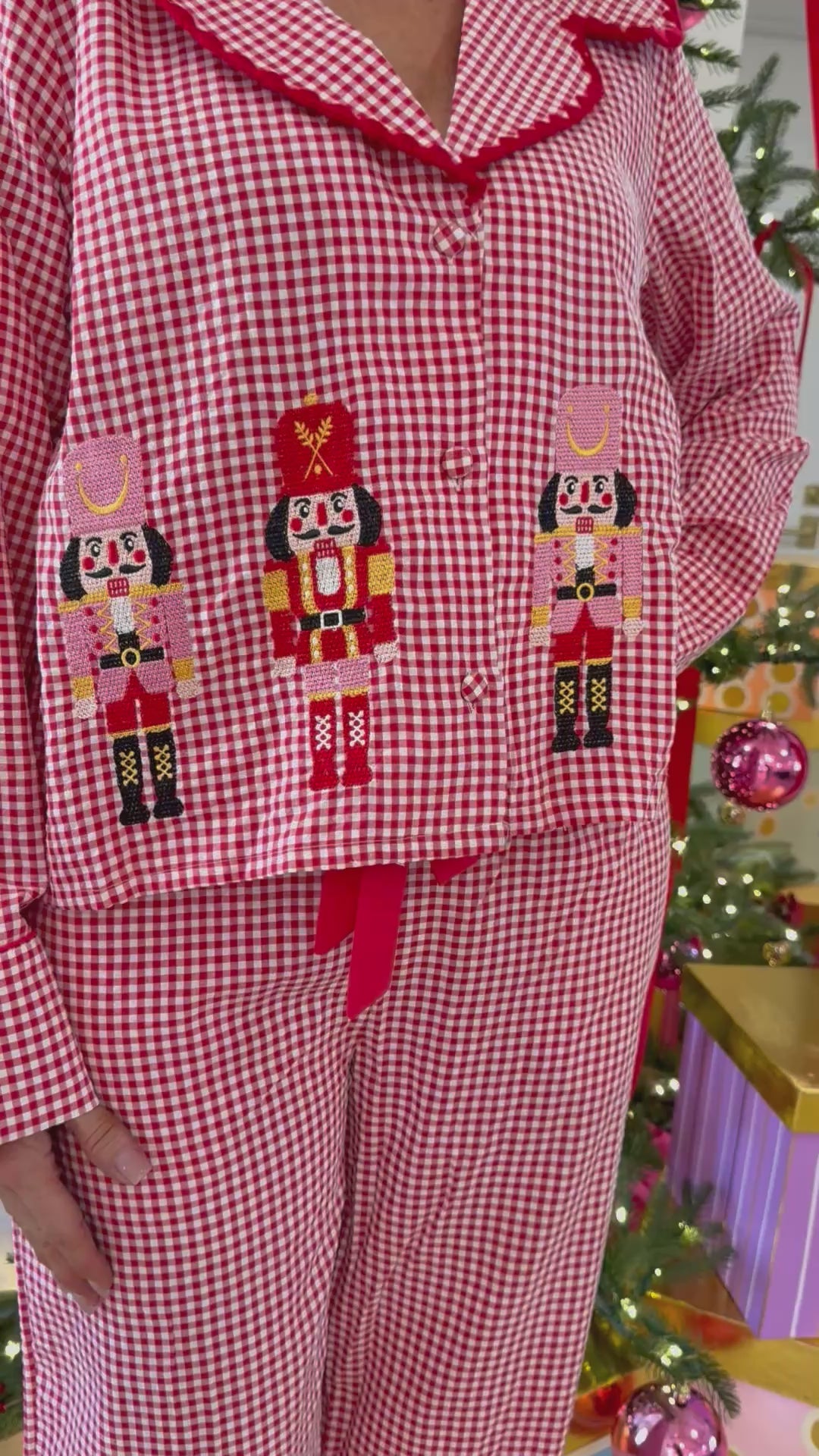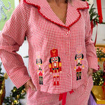 Get cozy in festive style with the Sugar Nutcracker Pajama Set, featuring charming ruffle collars and a playful nutcracker detail.