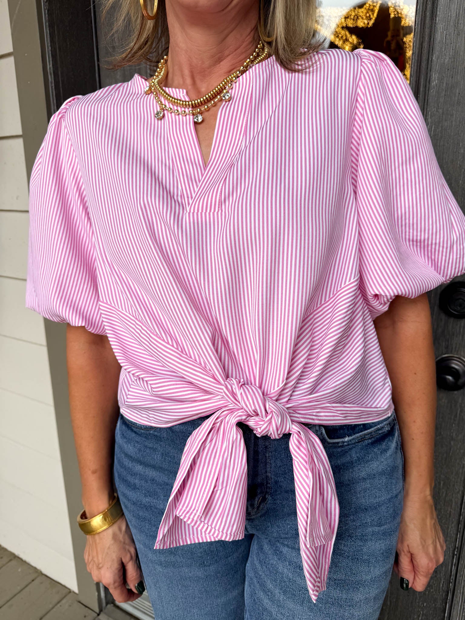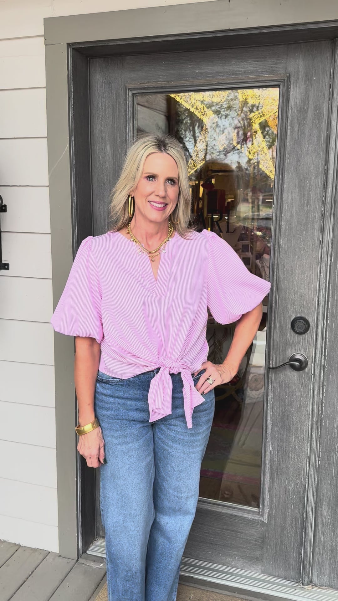 • Soft pink stripes and a flattering tie-front design create an instantly polished, versatile look for work or weekend wear
