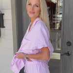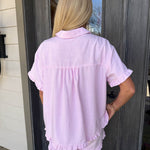 • Ruffle-trimmed shorts and button-up top create a coordinated look that works solo or layered