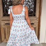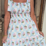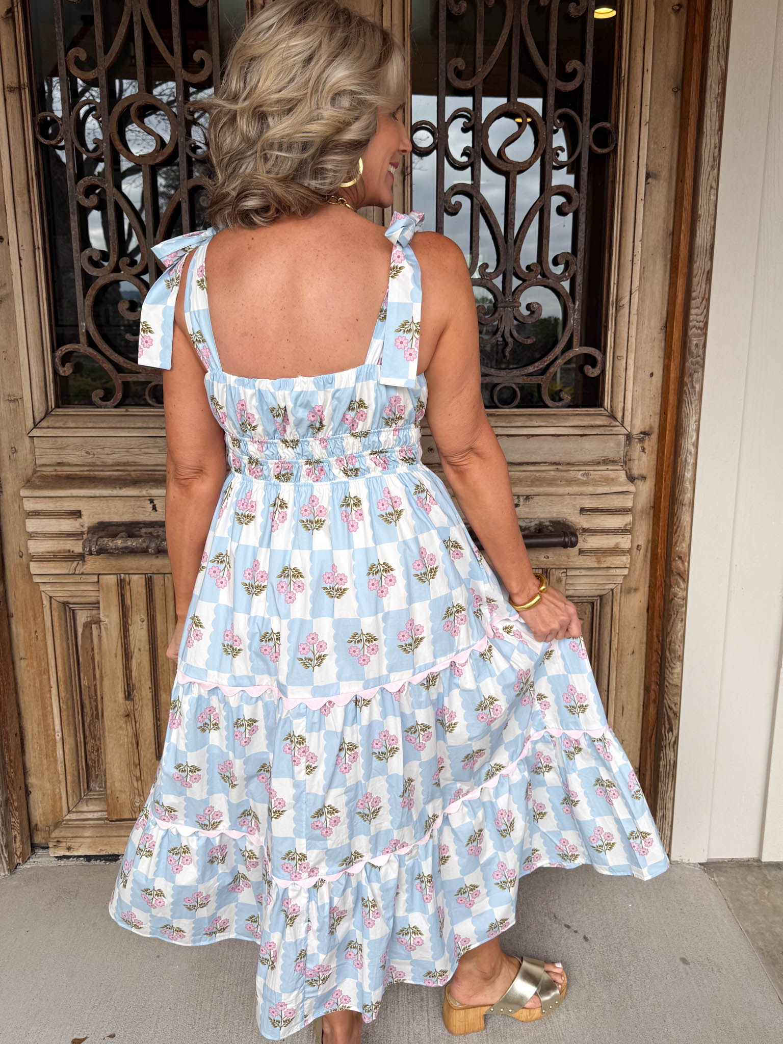 Effortlessly charming, this light blue tiered midi dress layers delicate checker and floral prints with whimsical ric rac detailing for a look that's equal parts sweet and sophisticated.