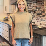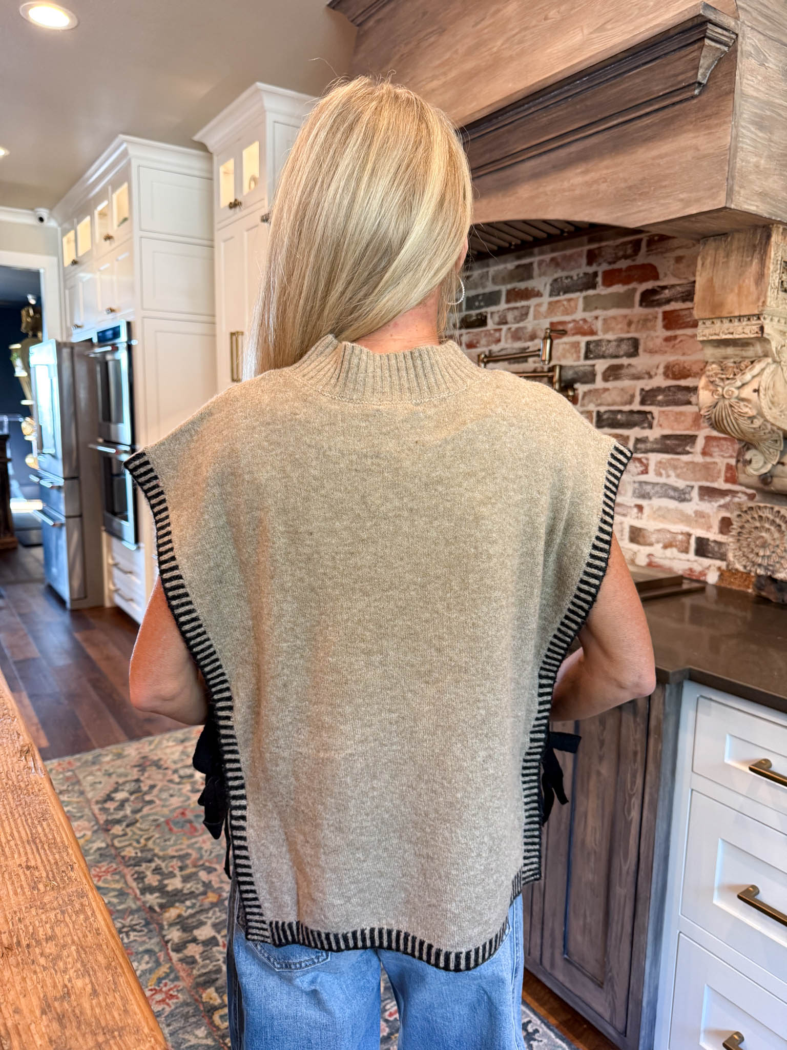 Turn heads with the Taupe Bowie Sweater, where sleeveless comfort meets flirty bow-tied side closures.