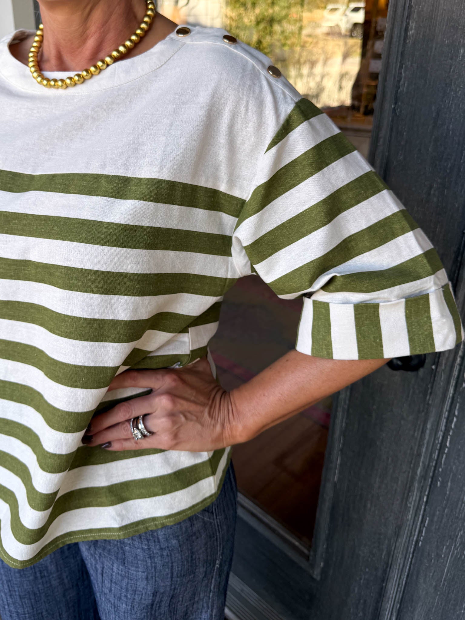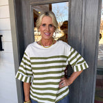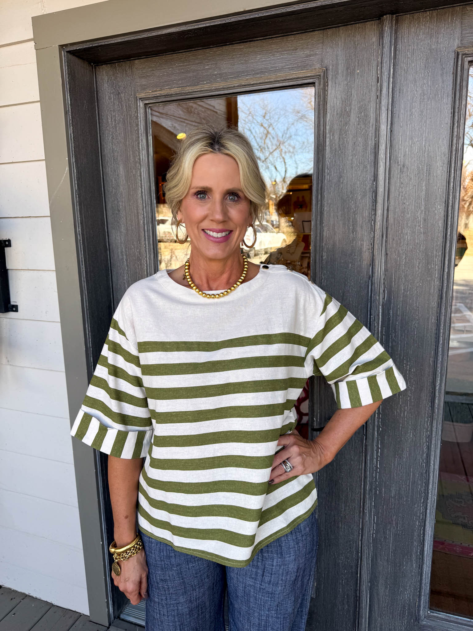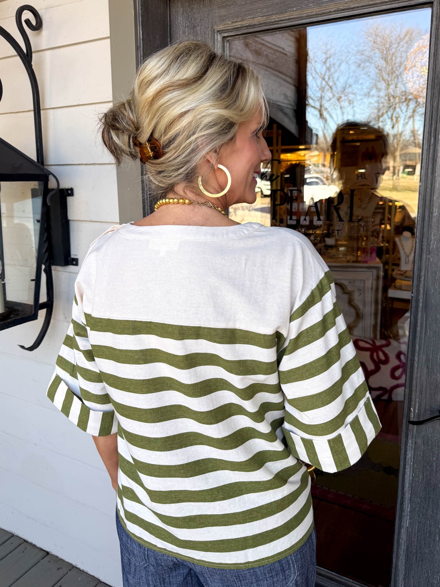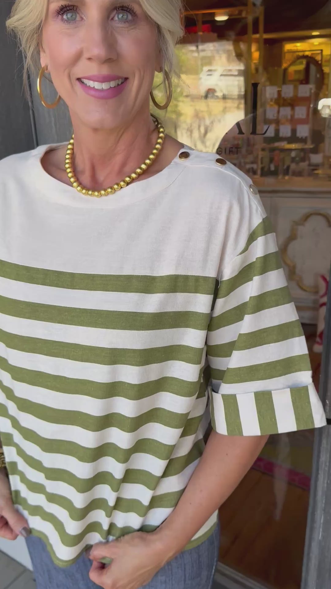 • Cream and olive stripes create a timeless color palette that pairs seamlessly with neutrals and bold pieces alike