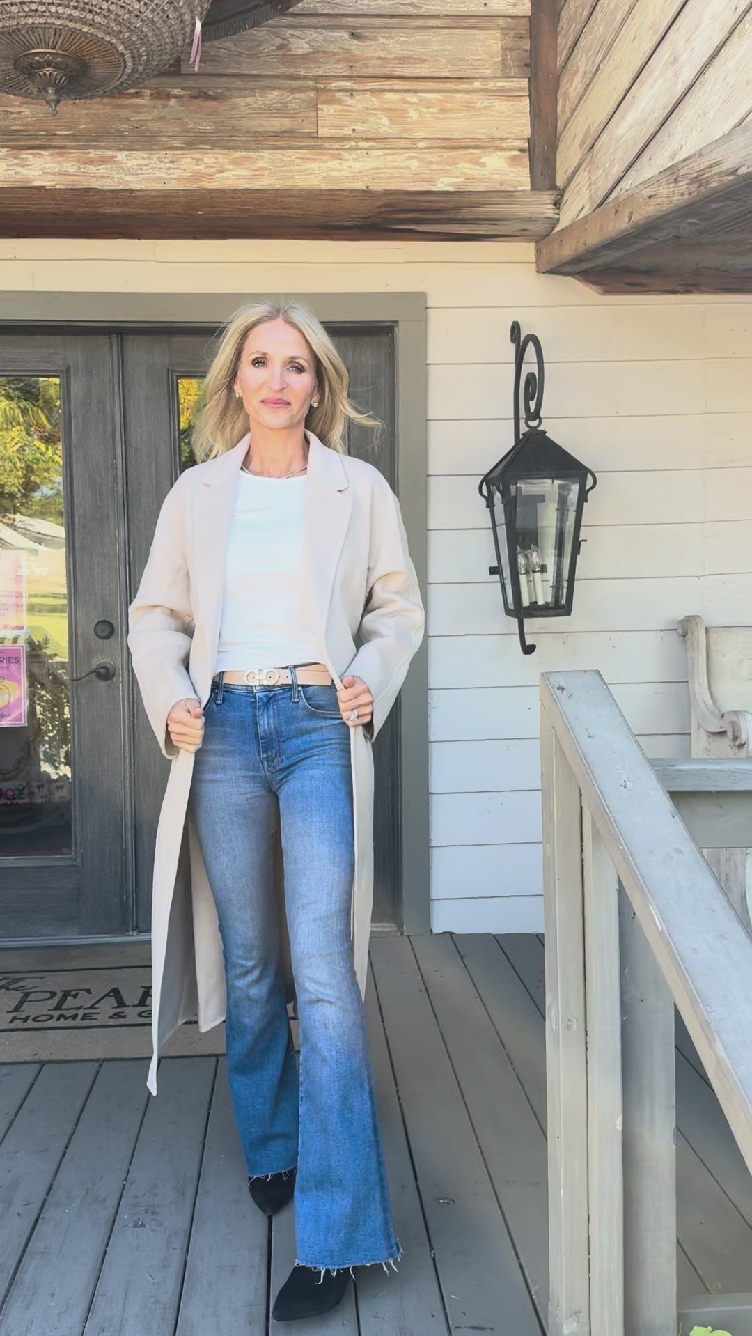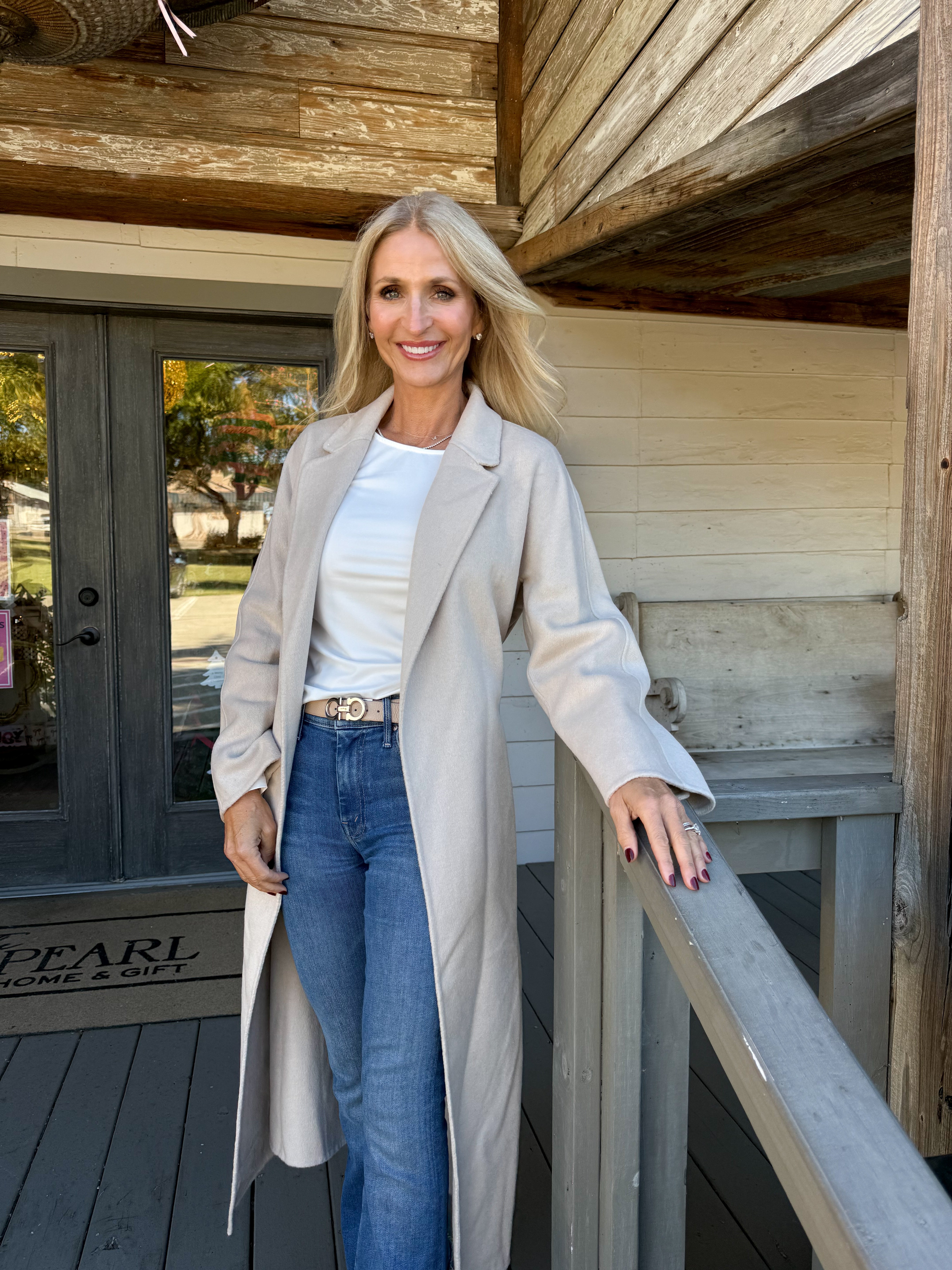 Wrap yourself in timeless elegance with this crisp white felt coat that's ready for any occasion.