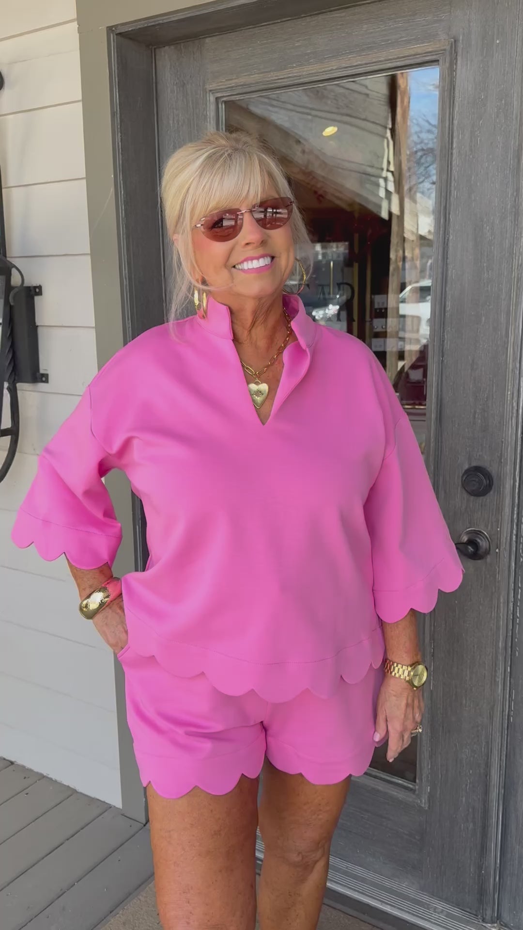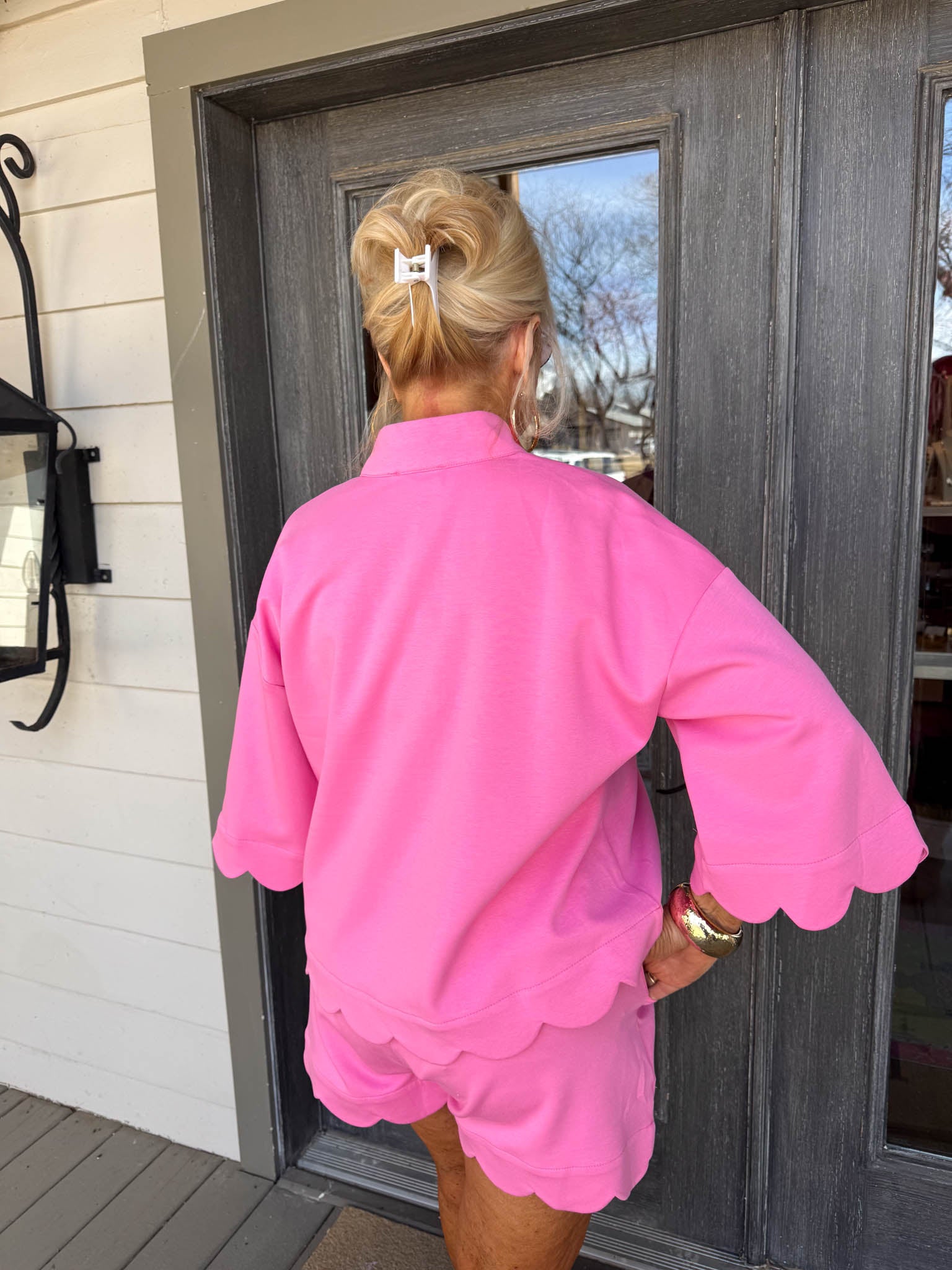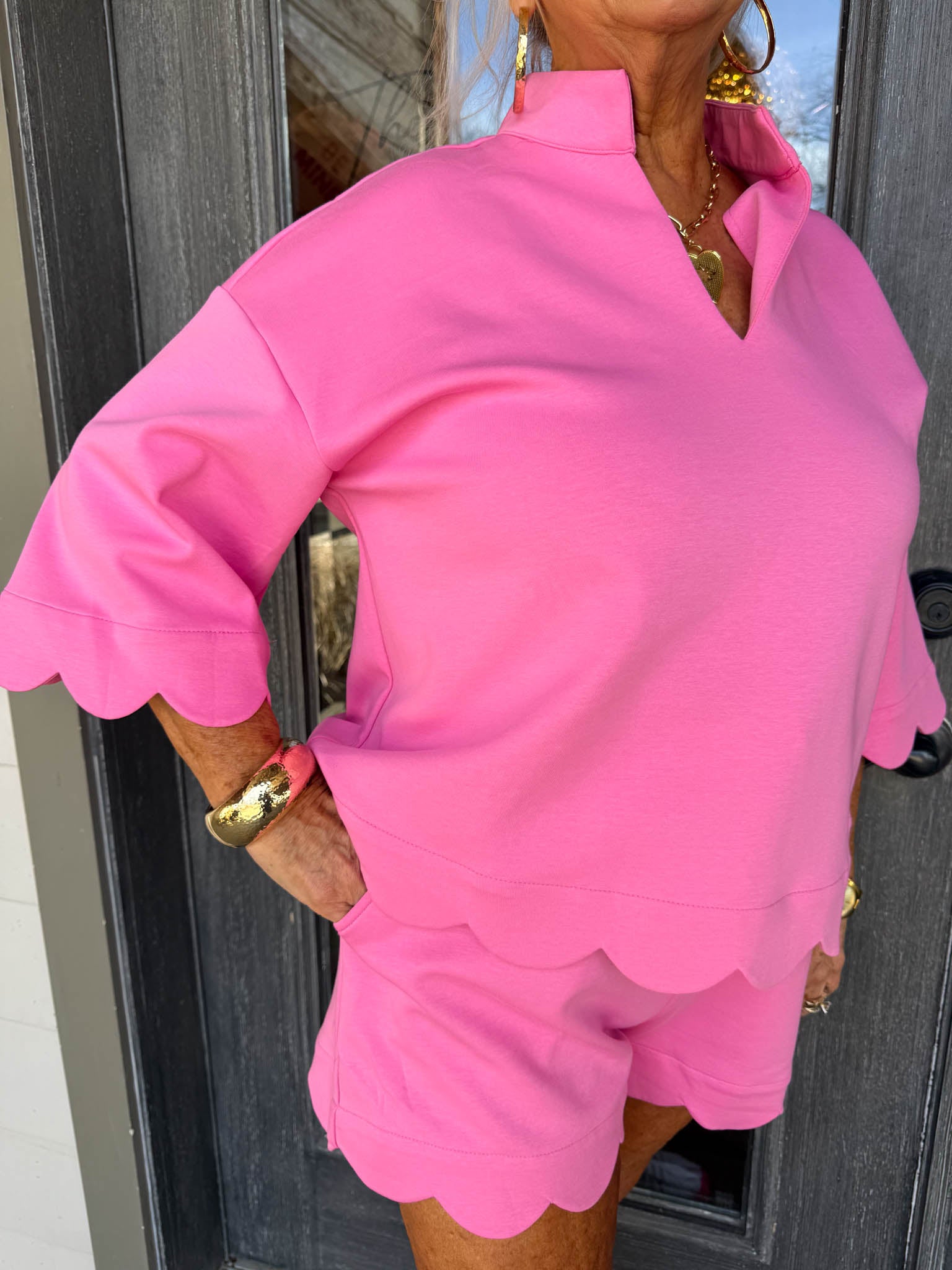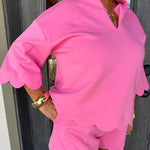 - Soft pink short-sleeve top and shorts with charming scalloped hems that add a delicate, feminine touch